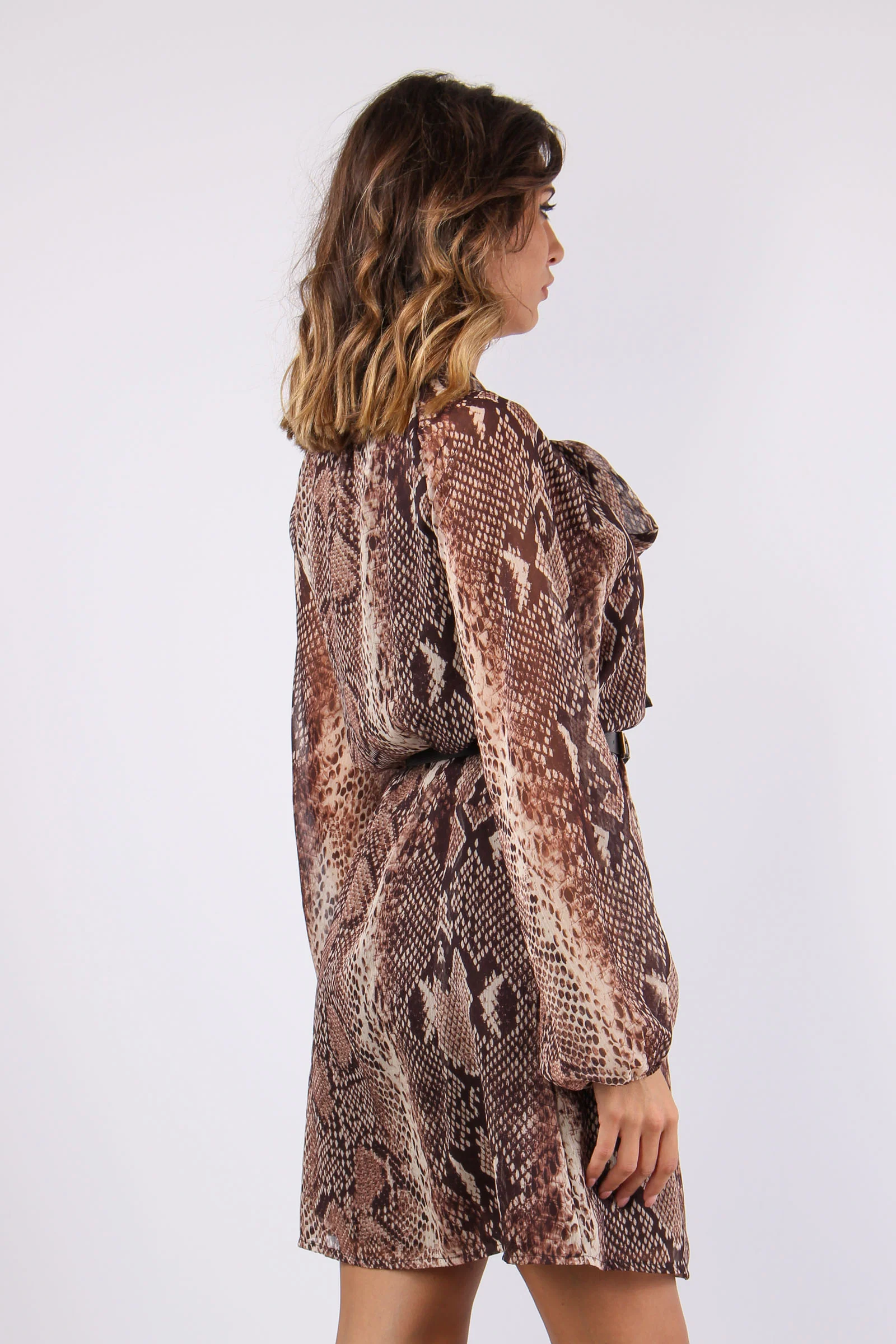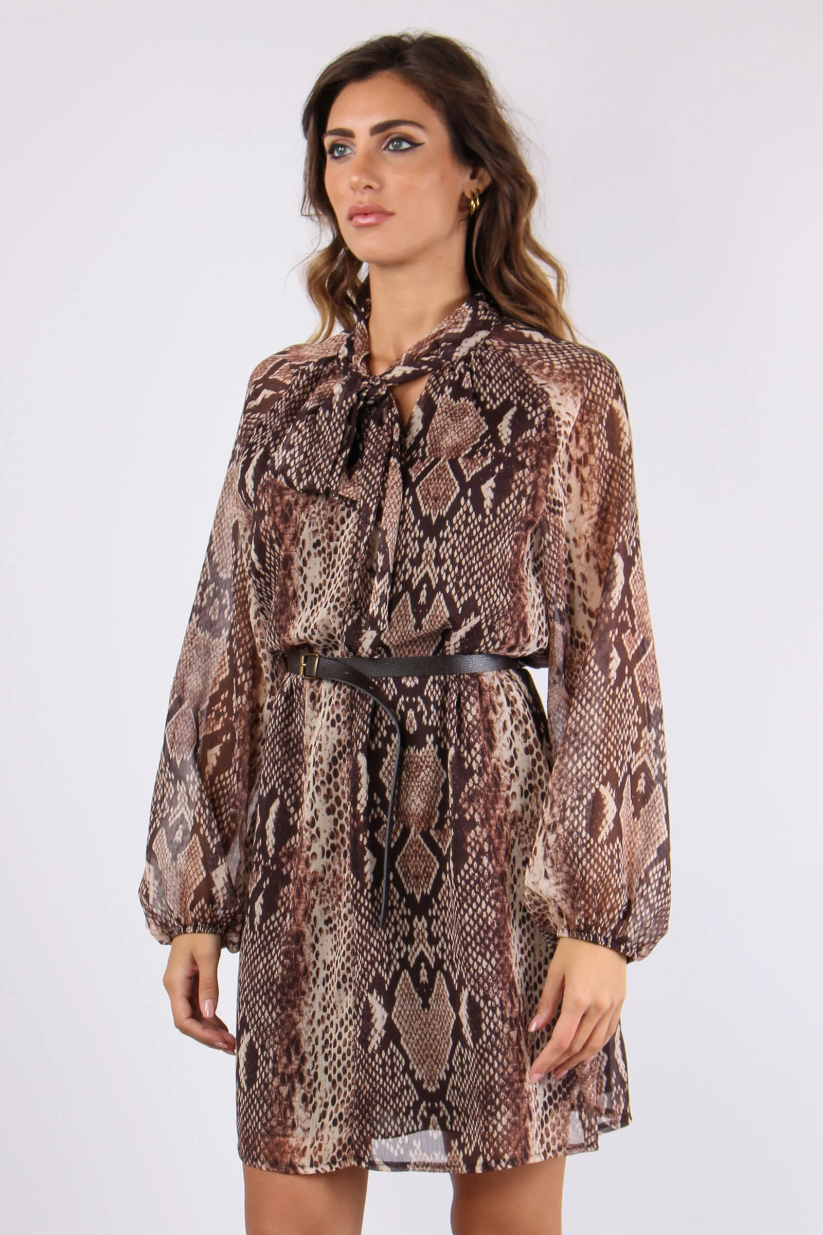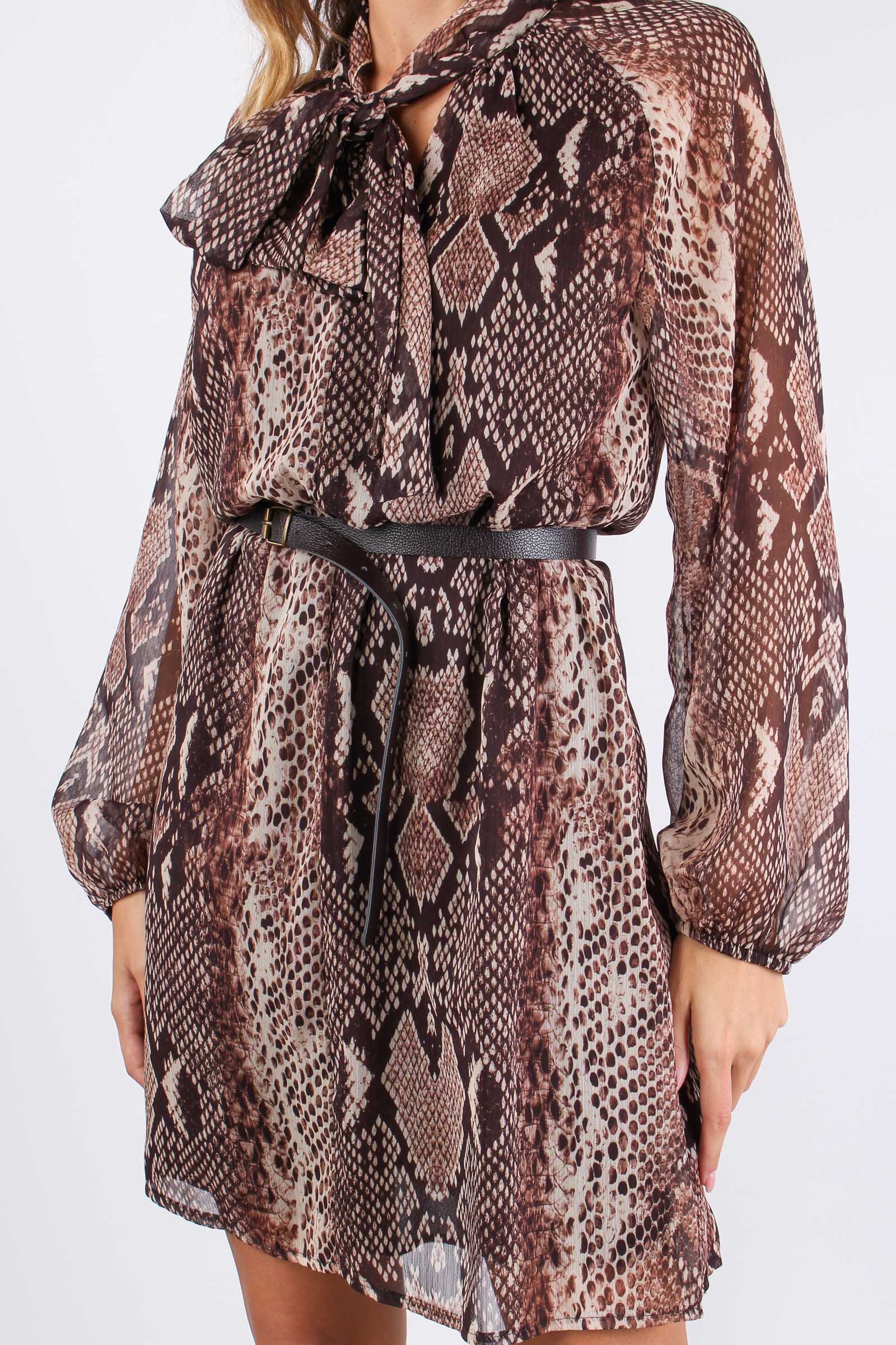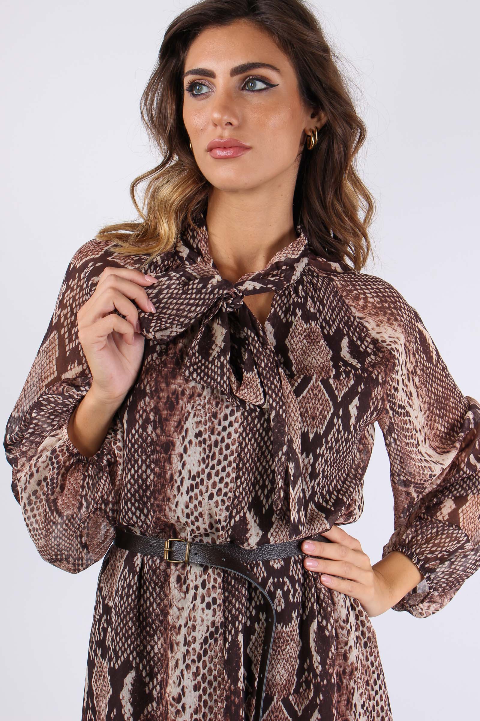 Abito stampa pitone con tessuto doppiato tinta unita moro per evitare la trasparenza. La vestibilità dell’abito è morbida e stringendo la cintura in vita si può avere un effetto sfiancato. Scollo a V arricchito dal fiocco regolabile attorno al collo.Le maniche terminano con un elastico nei polsi dan