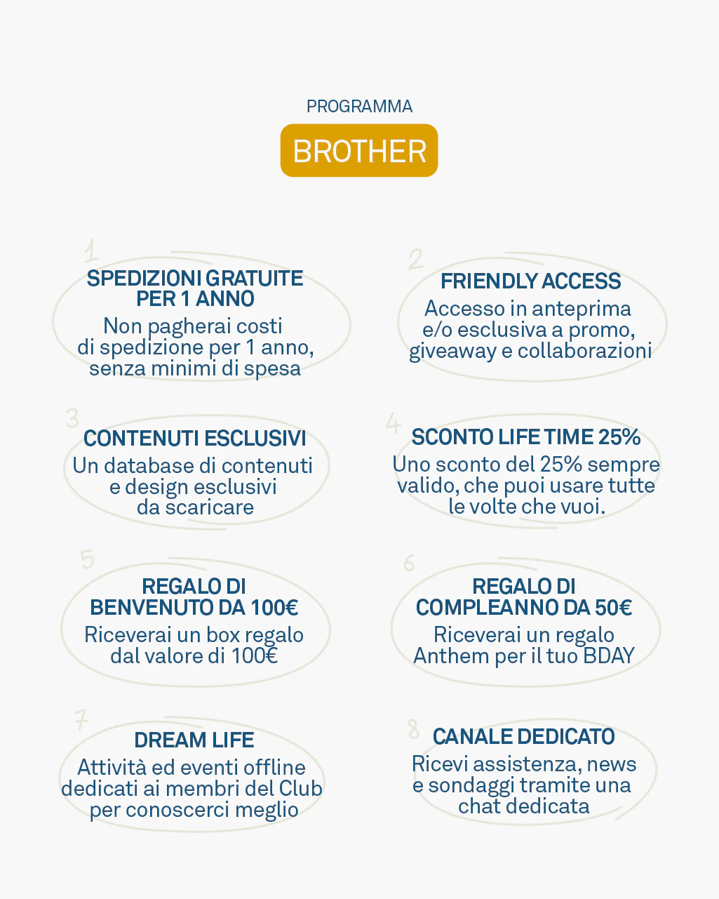 A seguito dell’abbonamento della quota annuale entrerai a far parte del Anthem Dreamers Club e riceverai una mail con tutte le informazioni per accedere ai seguenti vantaggi. Il programma Brother include: + Spedizioni gratuite 1 anno + Friendly Access + Contenuti esclusivi + Regalo di benvenuto 100€ + Sconto life time 25% + Regalo compleanno […]