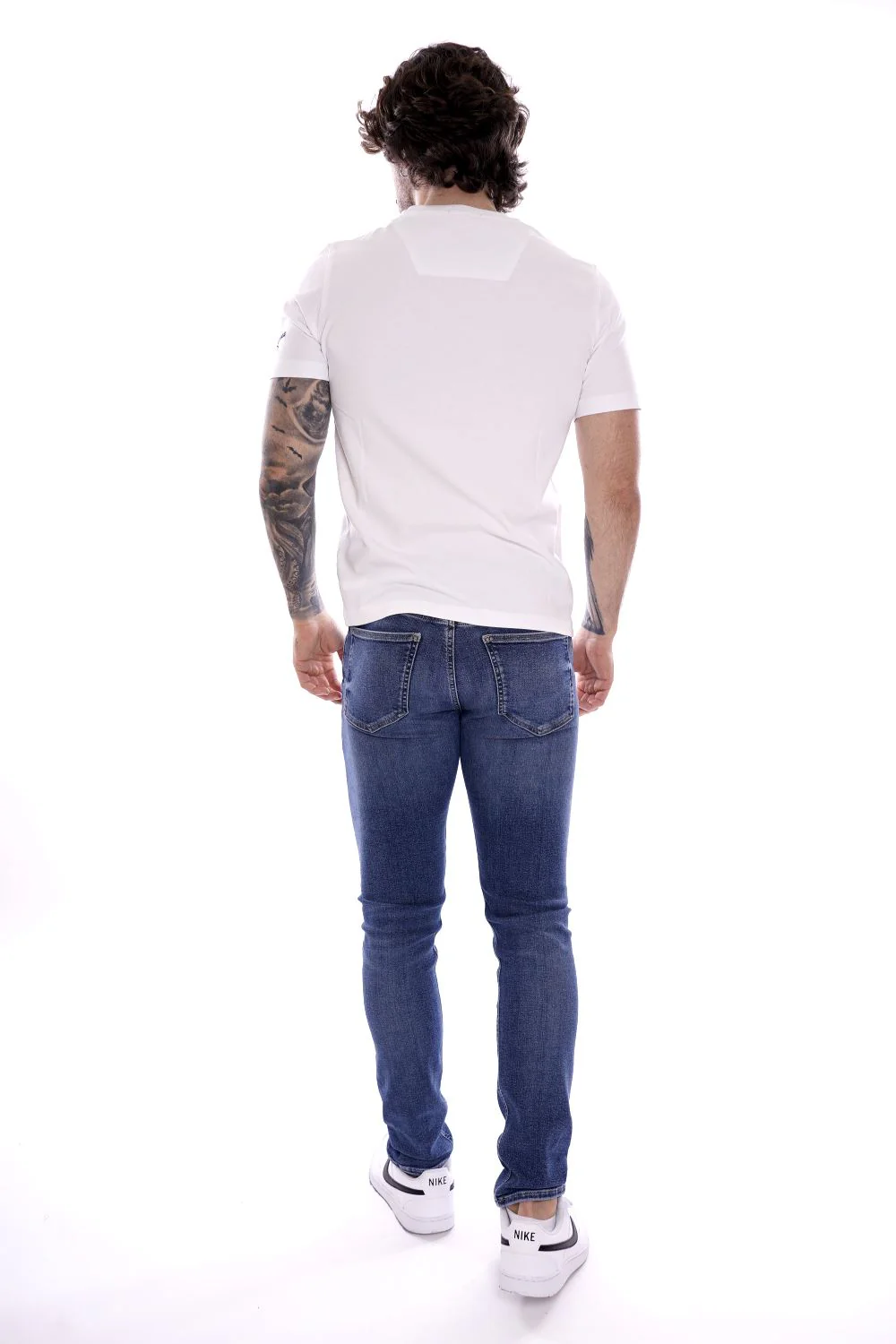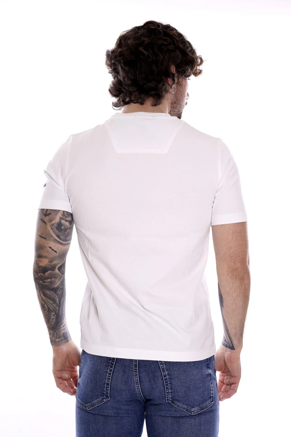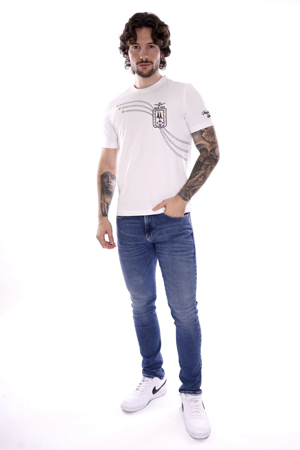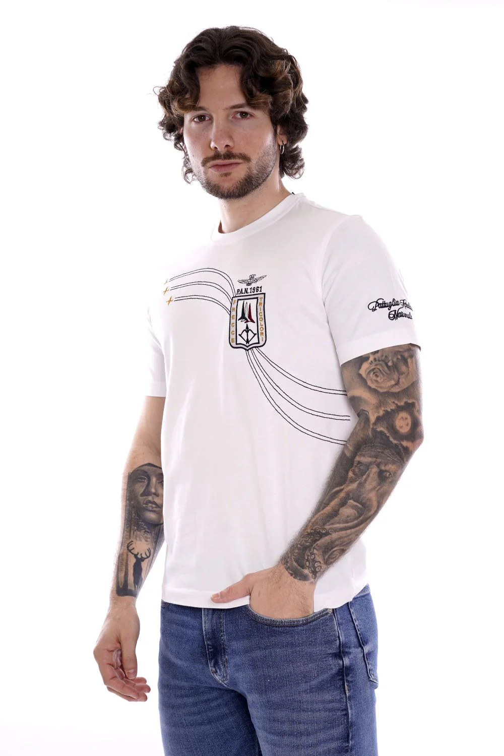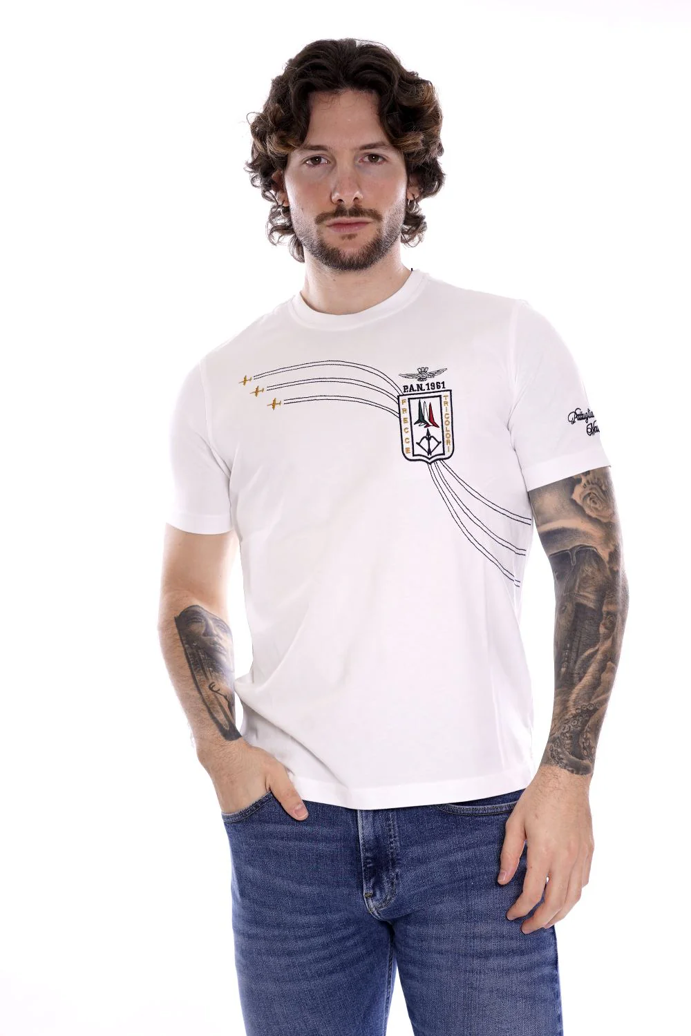 AERONAUTICA MILITARE Maglietta a girocollo e maniche corte bianca da uomo in cotone . Patch Frecce Tricolore e logo cucito sul petto