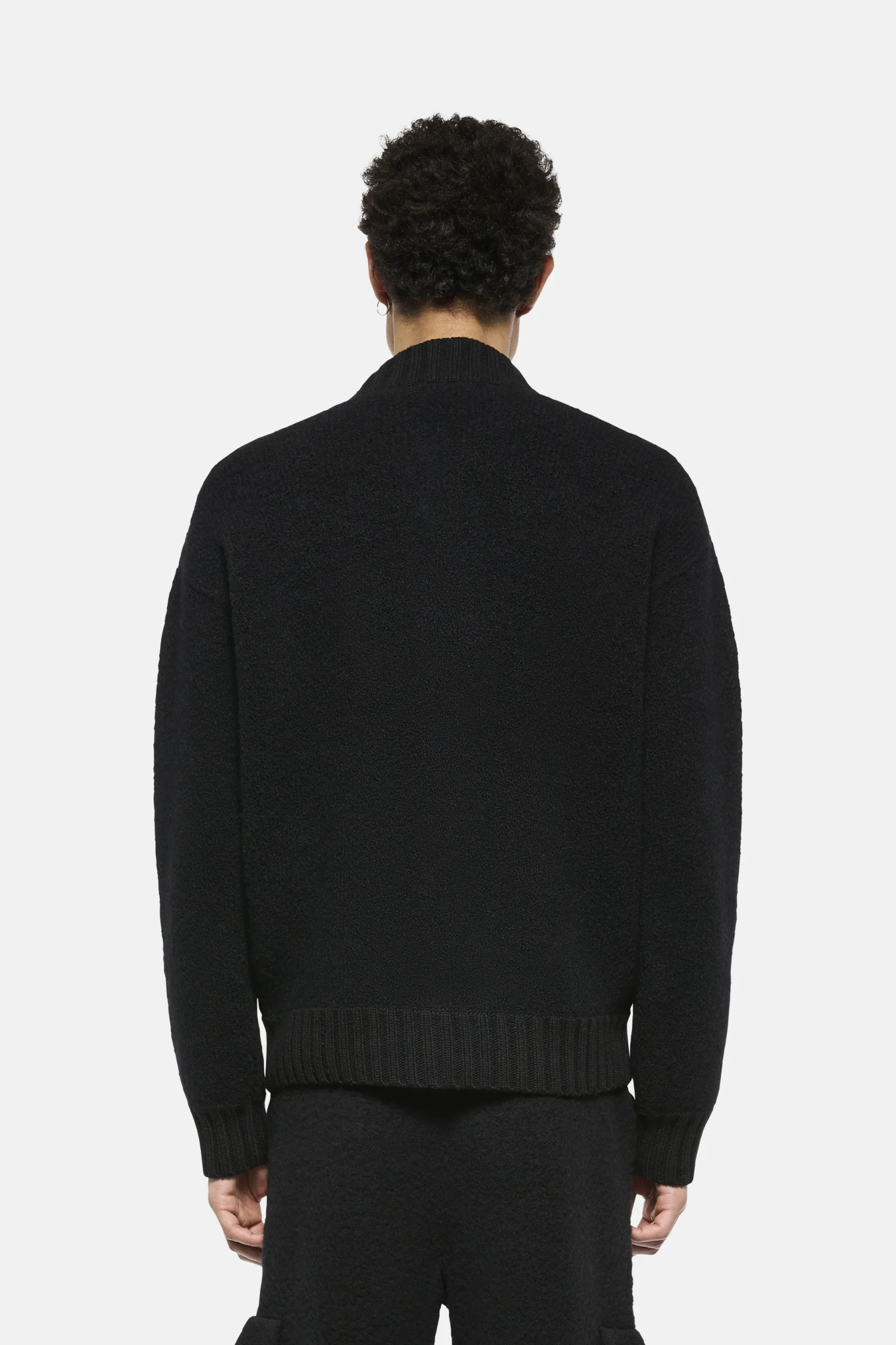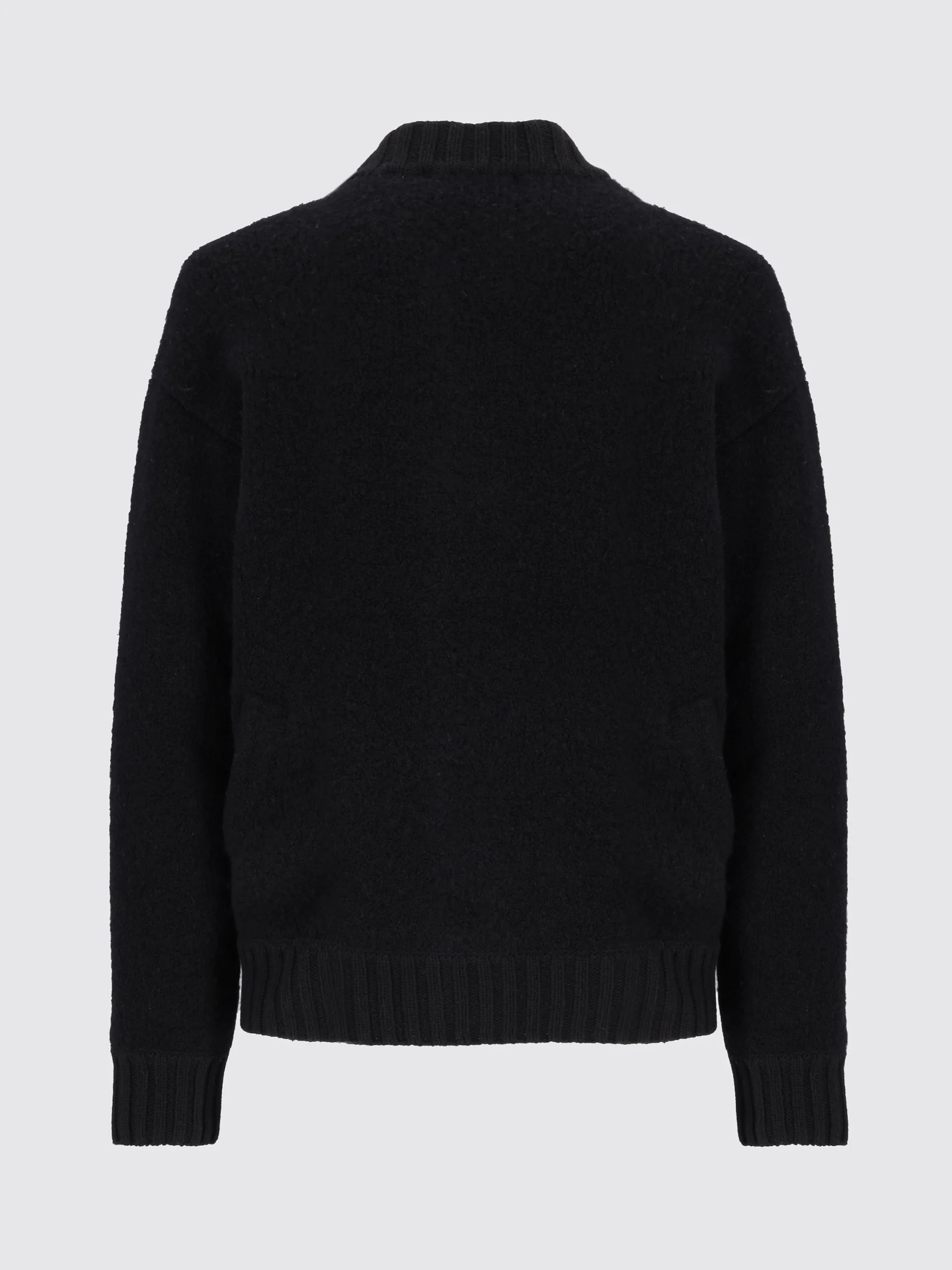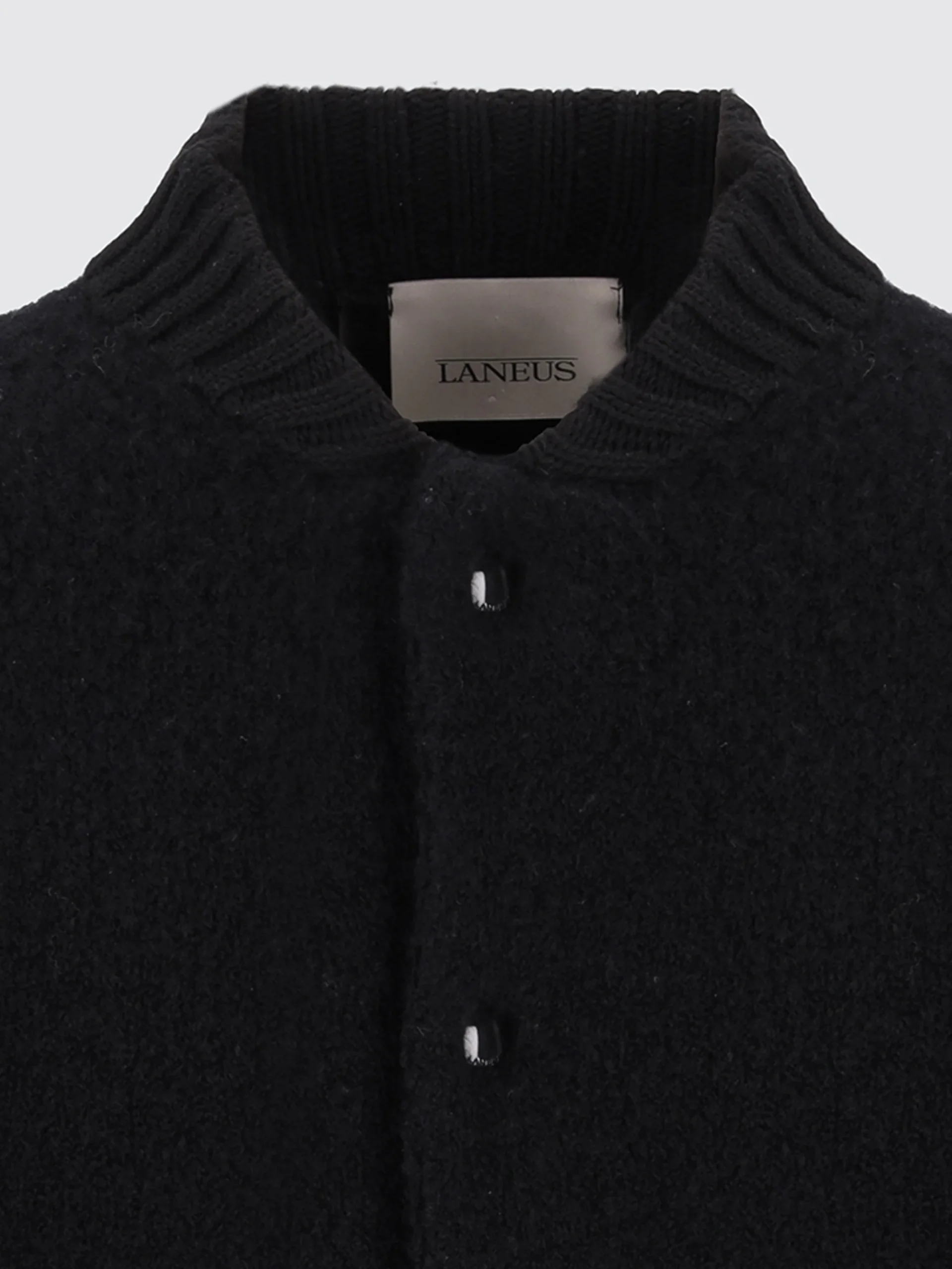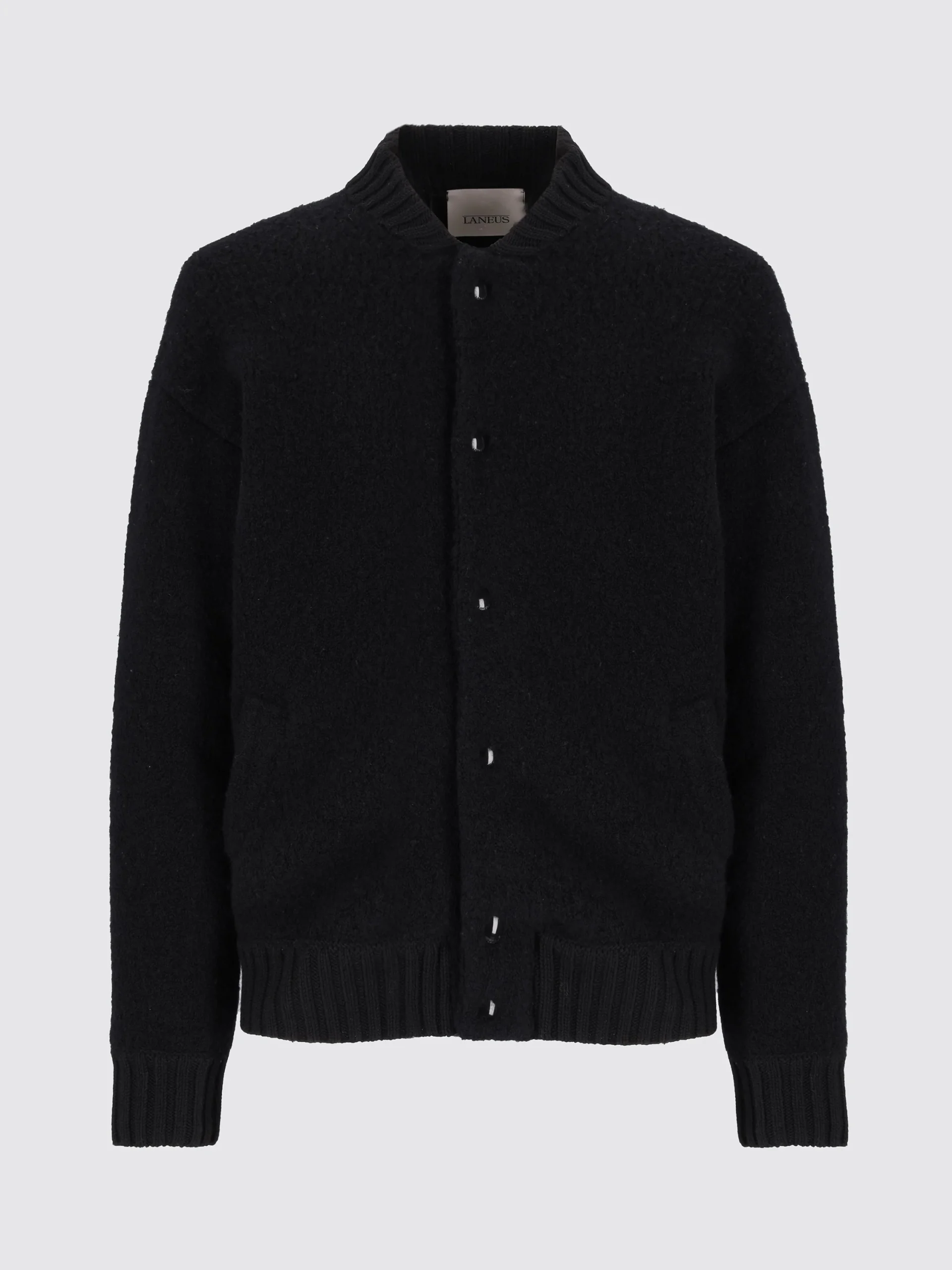Bomber in maglia firmato Laneus, realizzato in filato bouclé di lana Merinos. Caratterizzato da una silhouette regular, presenta chiusura frontale con bottoni snap e due tasche a letto. Collo, polsi e fondo rifiniti a costine completano il design essenziale. Made in Italy.