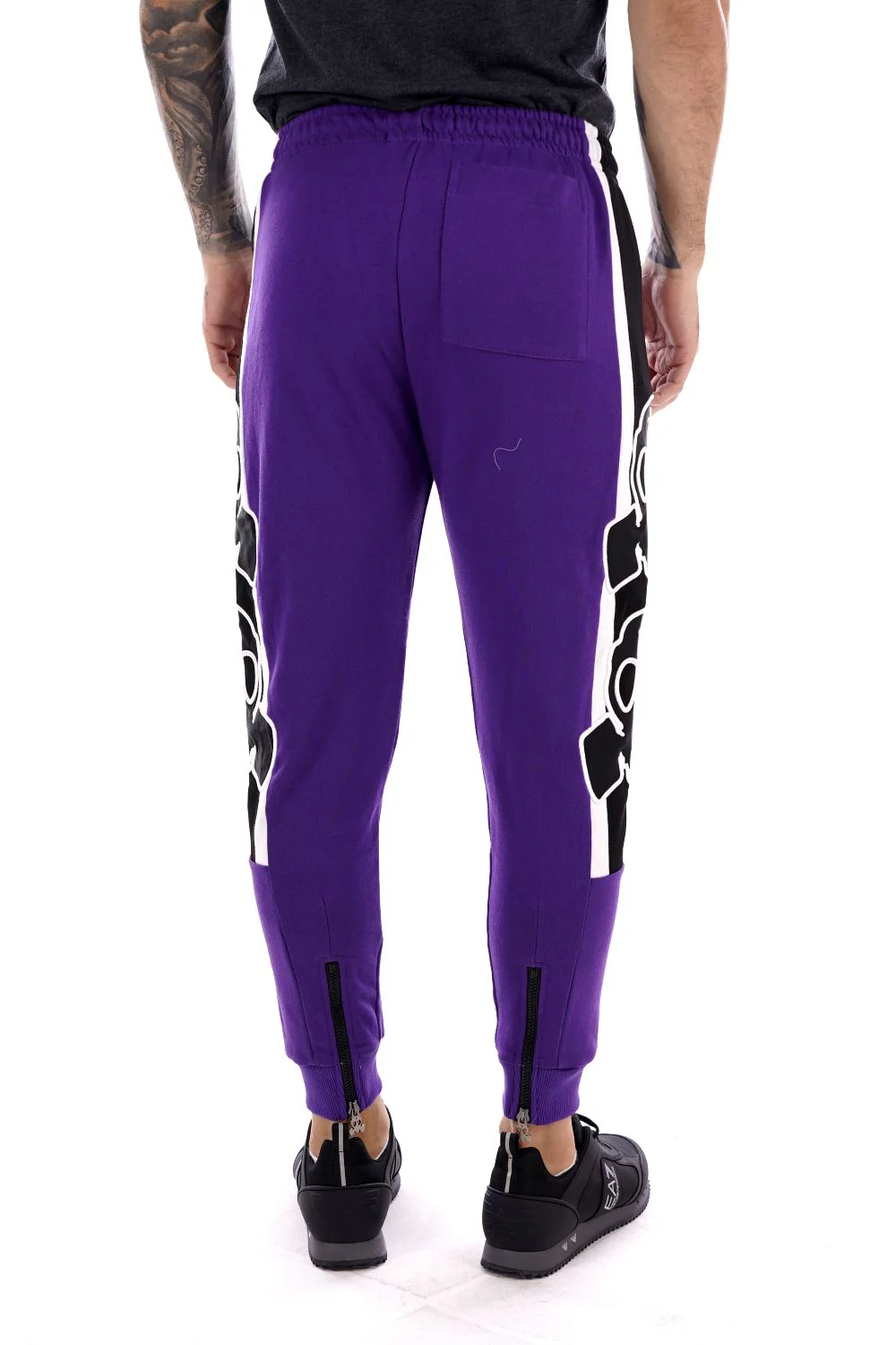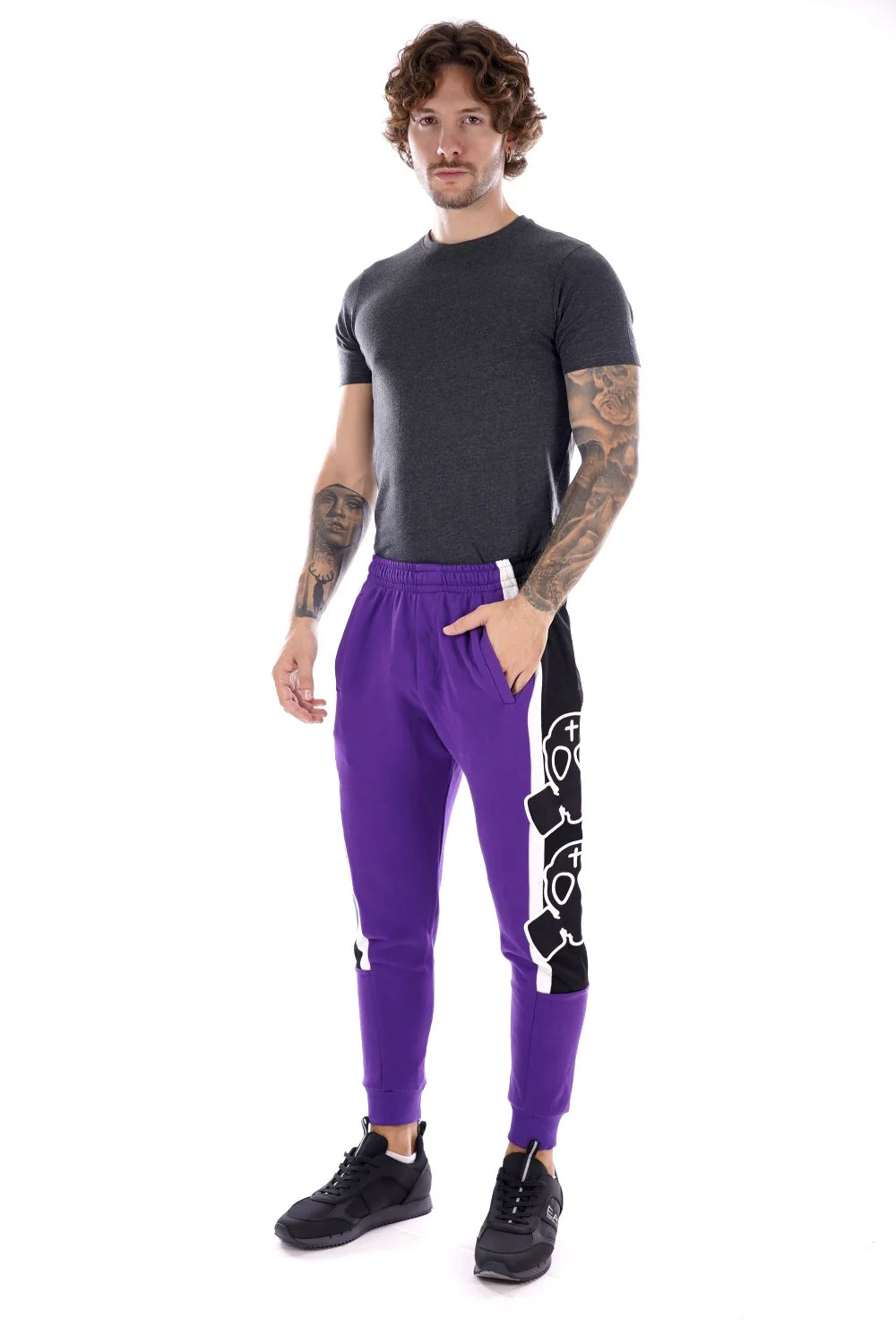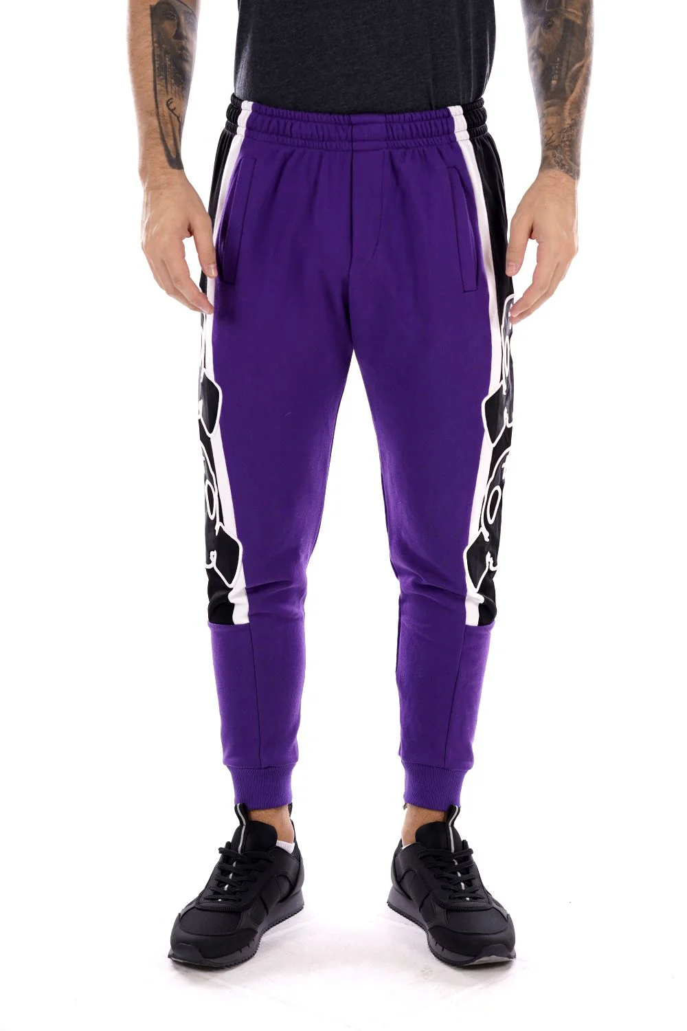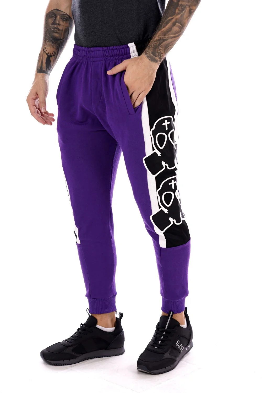 BUT NOT Pantalone di tuta viola da uomo , in cotone . Banda laterale con iconica maschera a gas
