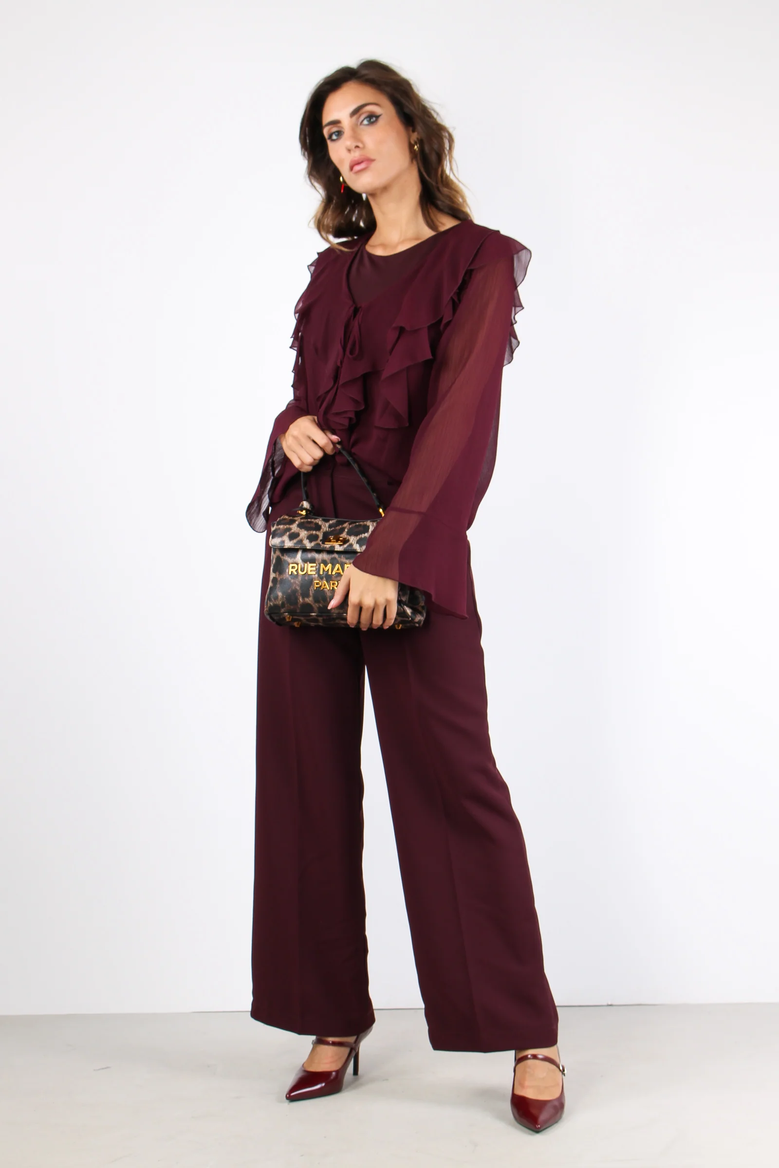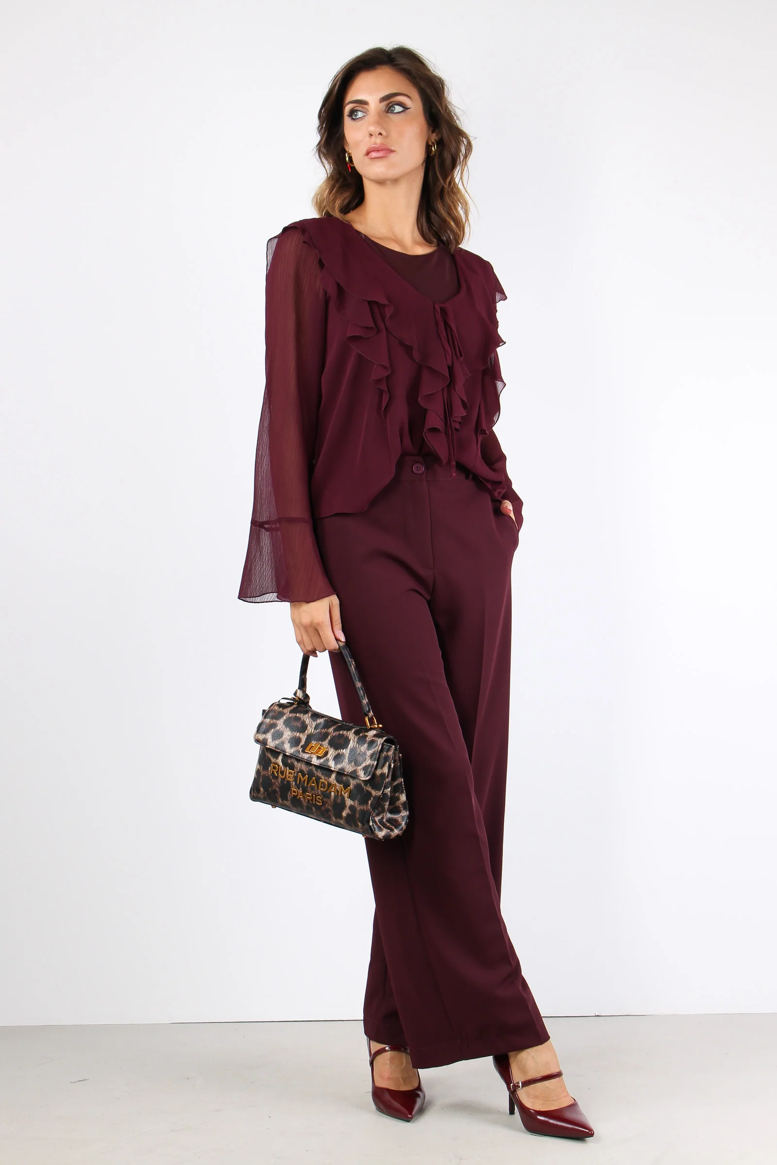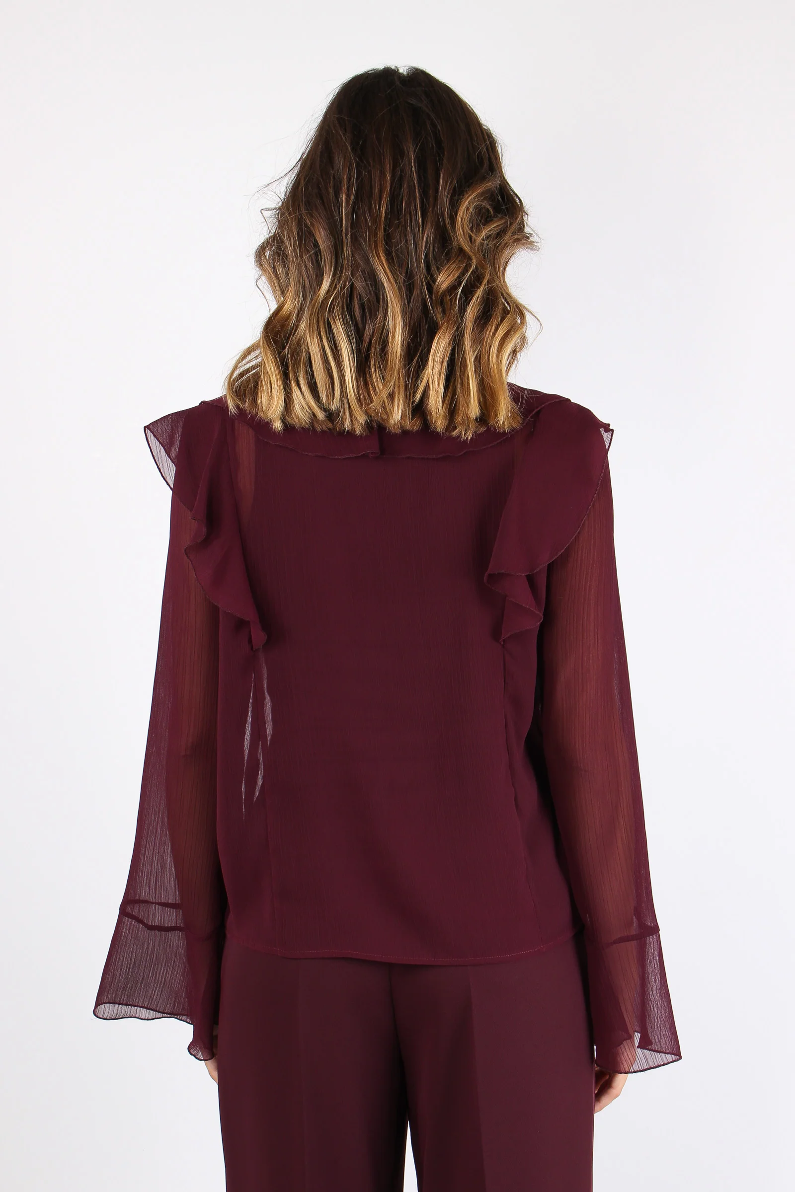 Camicia in tessuto fluido con rouge applicate che danno movimento alla linea pulita della camicia. Lo scollo a V è chiuso al termine con un laccetto regolabile. Le maniche terminano con una forma a ventaglio. Composizione articolo: 100% poliestere La modella è alta 1 75 e indossa una tg. S.