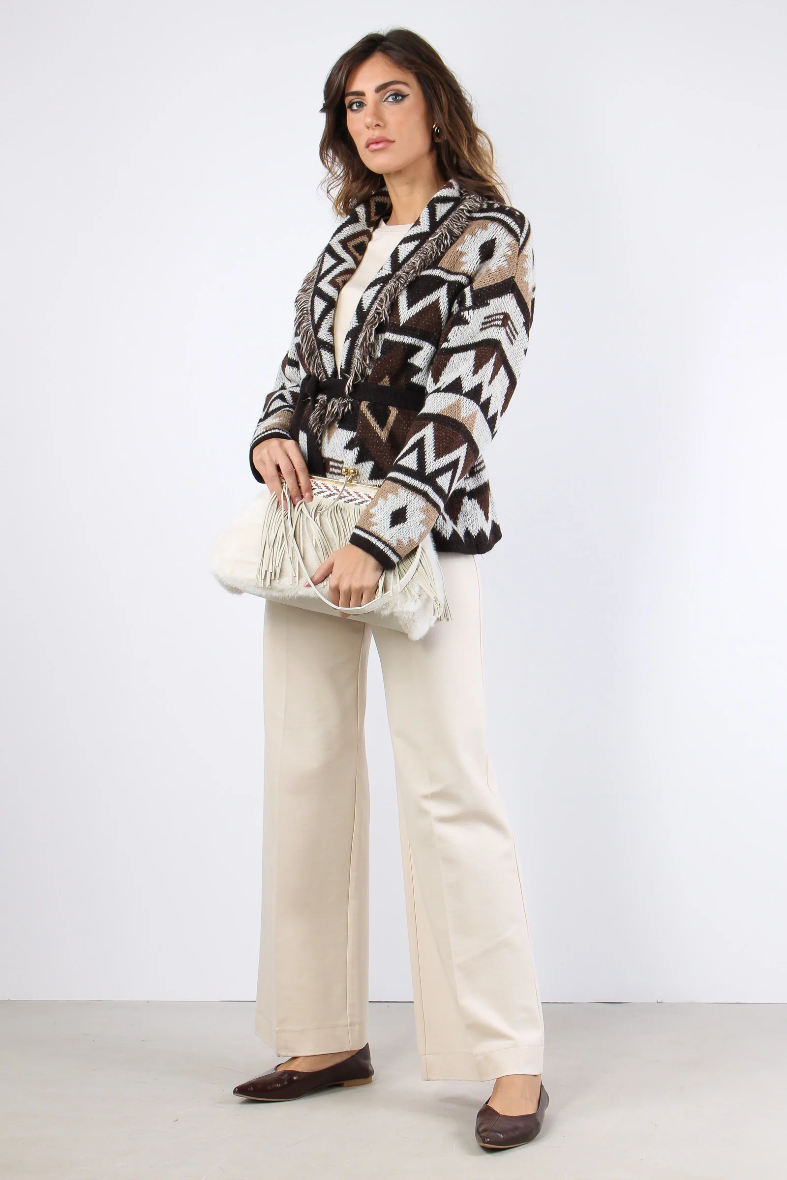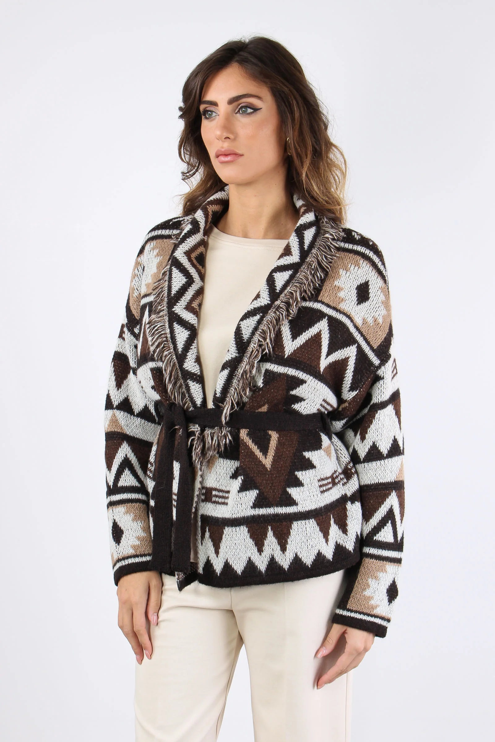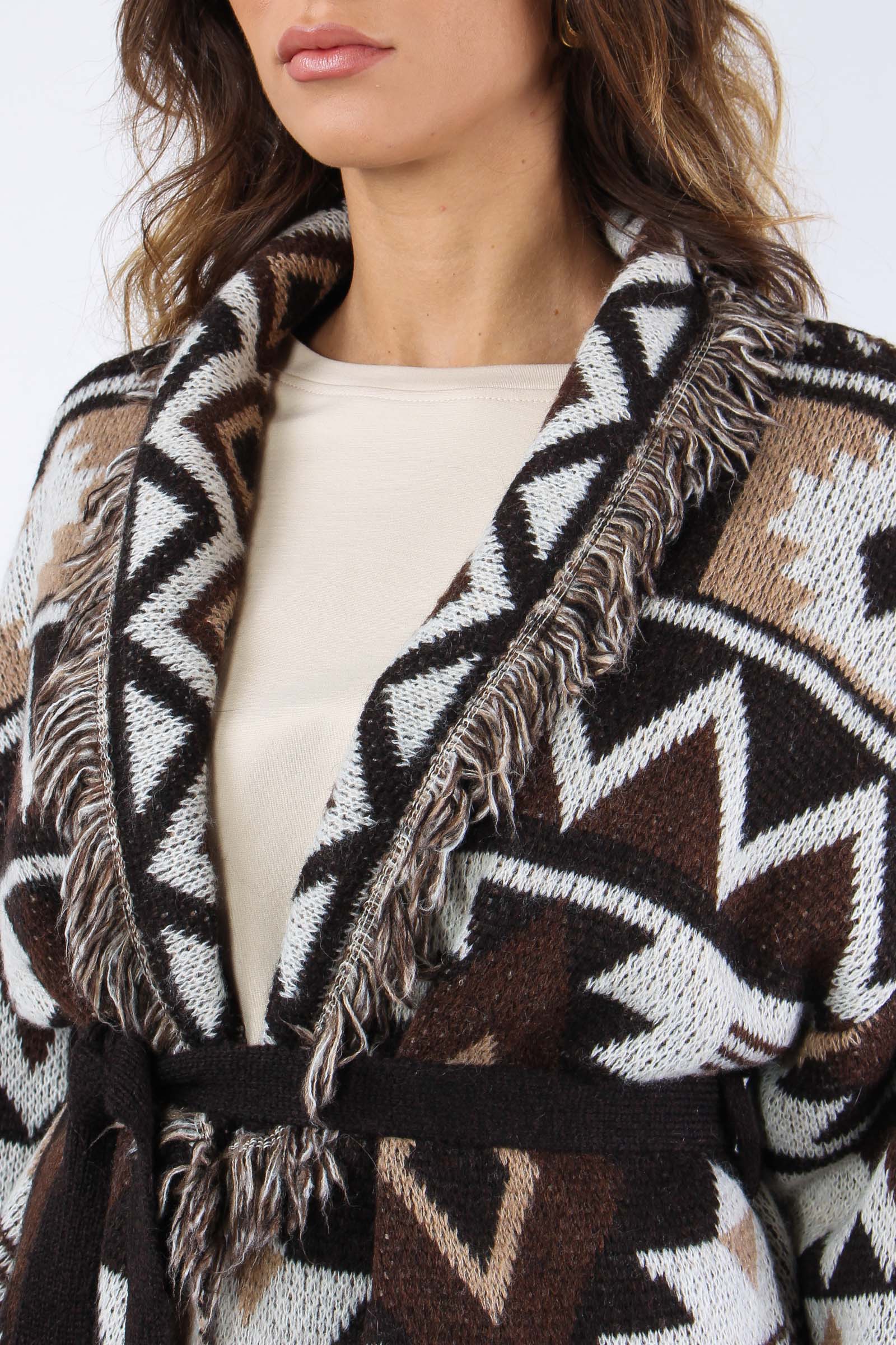 Cardigan in maglia pesante con stampa peruviana nei toni del moro beige e burro. La fusciacca color moro definisce il punto vita. Le frange applicate coronano la tua figura dandoti volume e sicurezza. Composizione articolo: 57% acrilico 29% poliammide 7% lana 7% viscosa La modella è alta 1