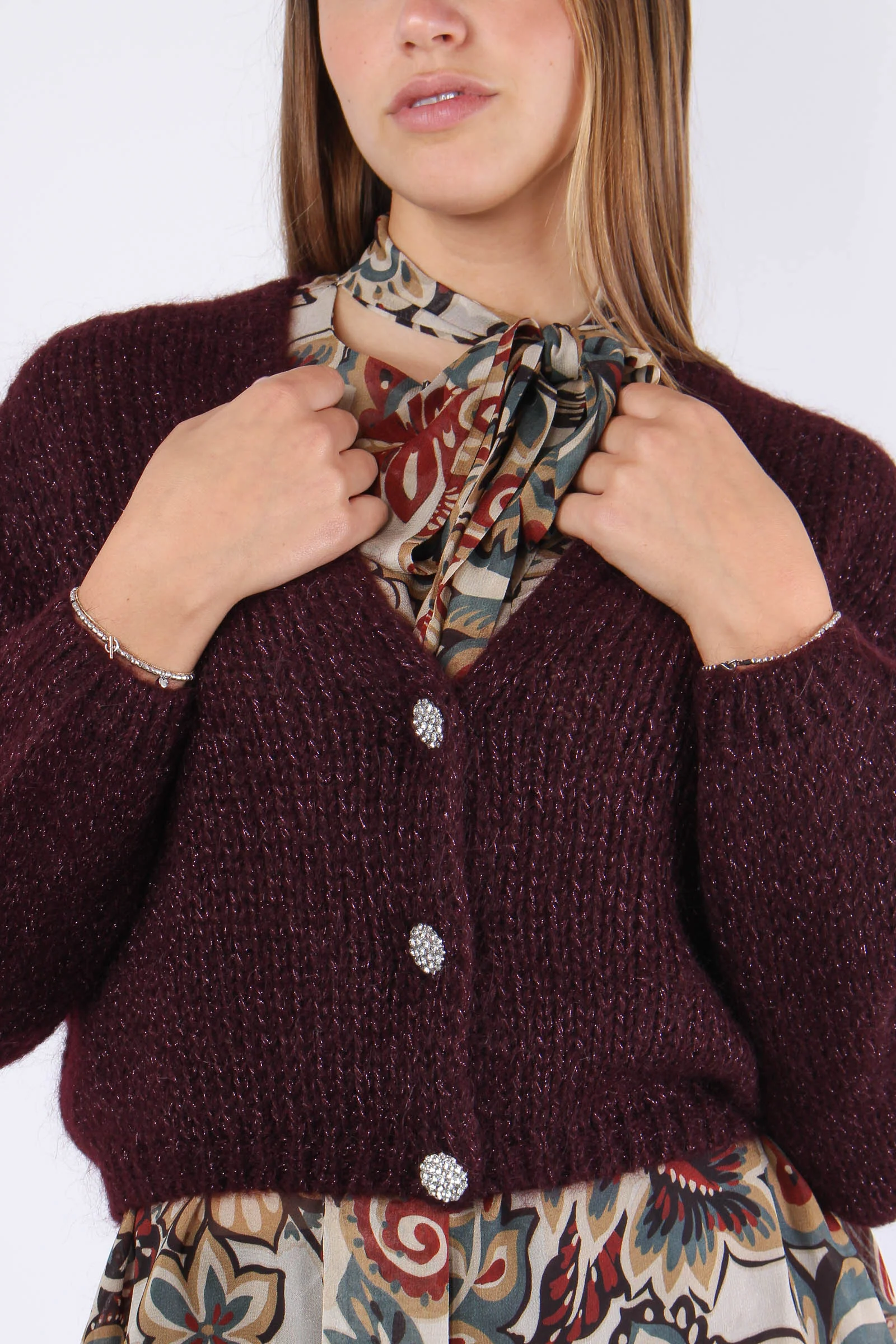 Cardigan misto mohair color vino con filatura lurex impreziosito da tre bottoni gioiello. Il taglio cropped ti permetterà di indossarlo inoutfit casual ed eleganti. Composizione articolo: 37% acrilico 32% poliamide 23% mohair 5% lana 3% fibre metalliche La modella è alta 1 75 e indossa