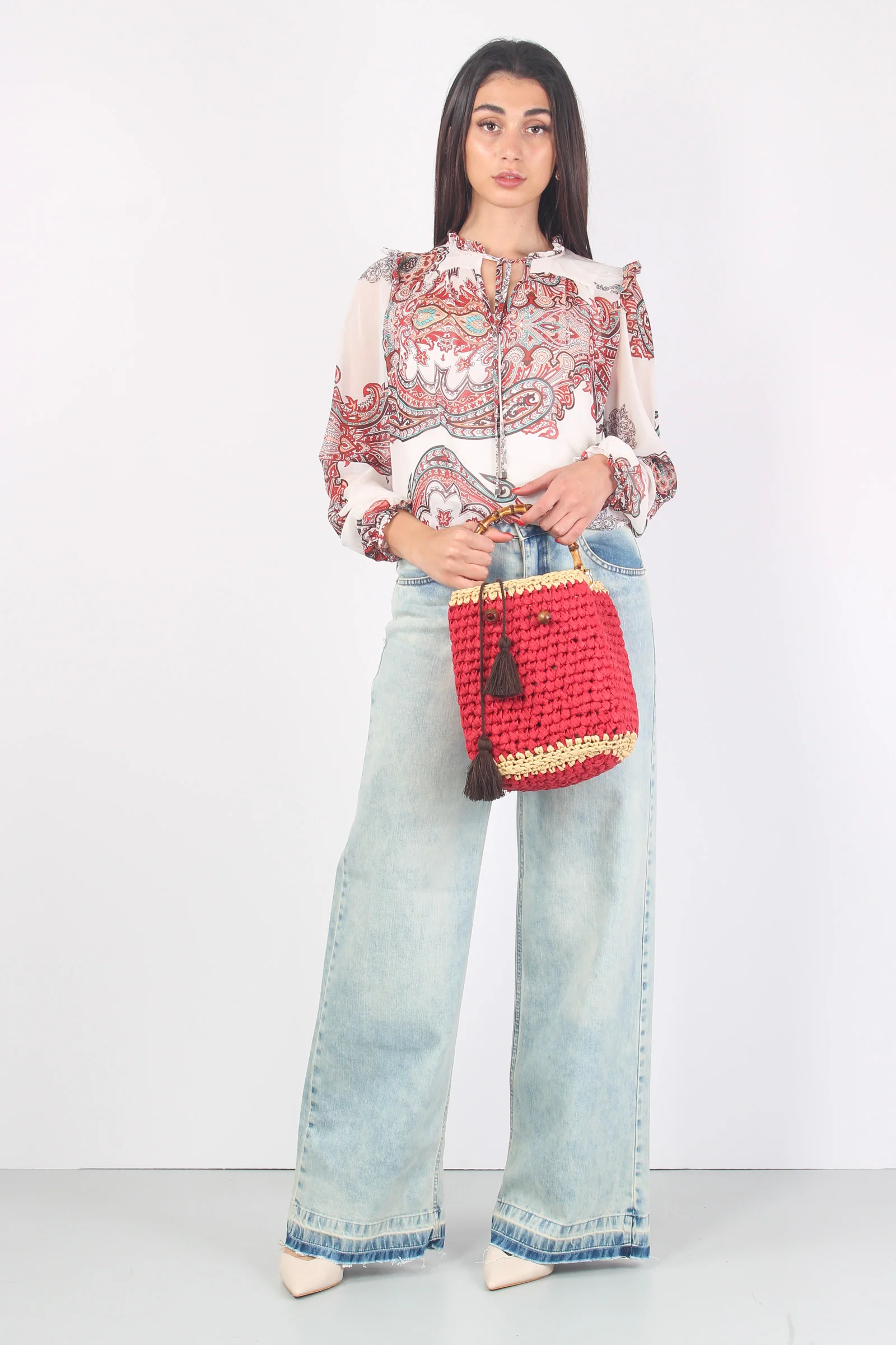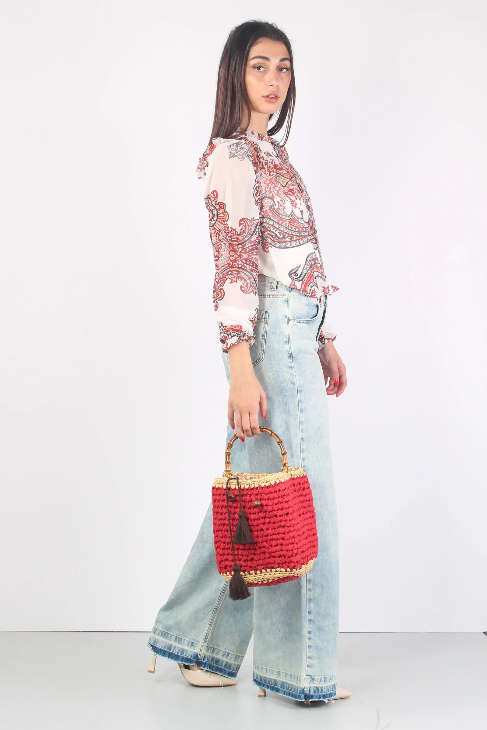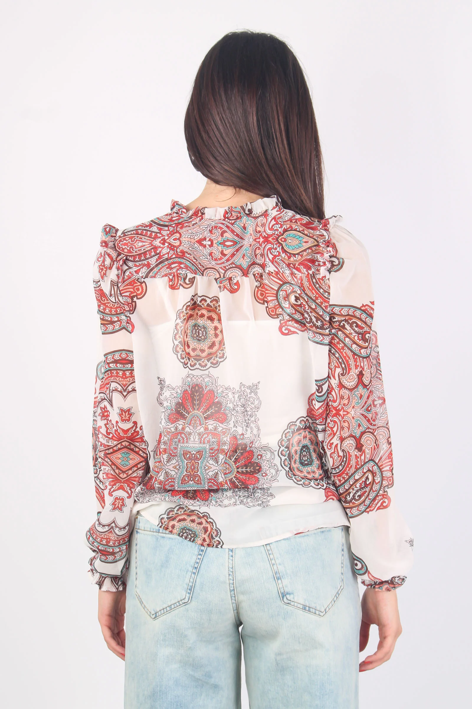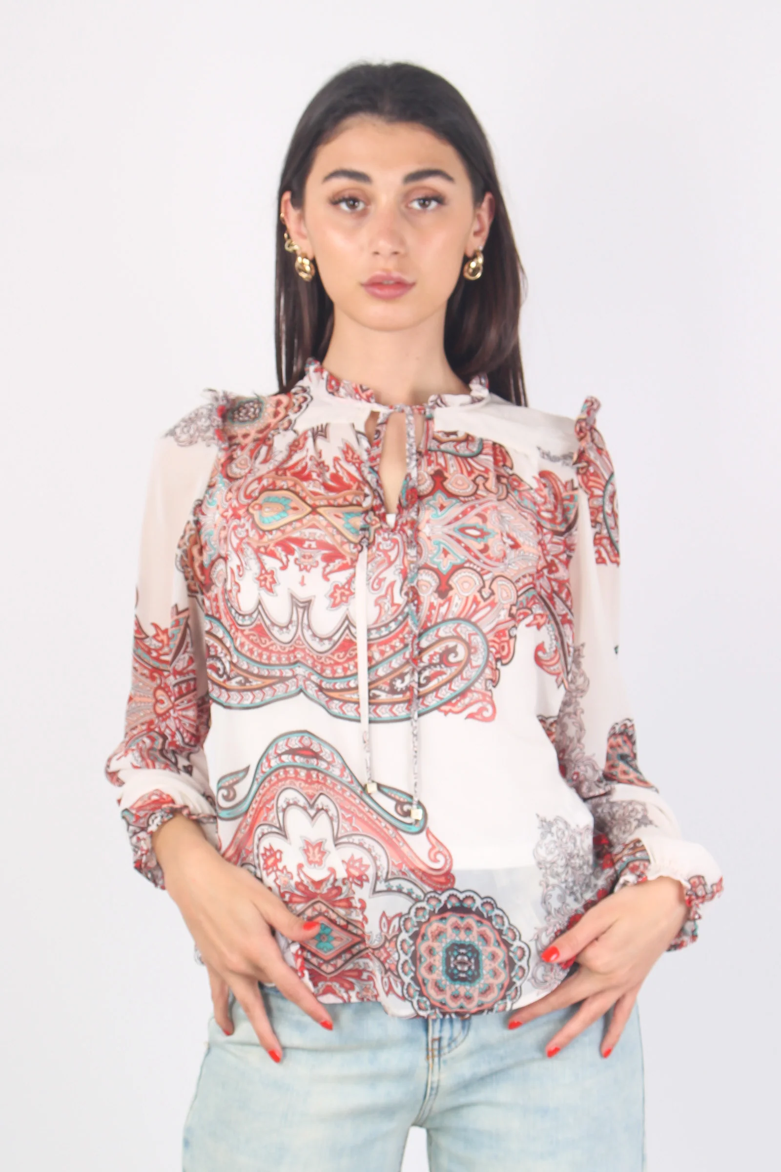 Casacca fantasia in georgette presenta un polsino alto arricciato che aggiunge un tocco di femminilità e raffinatezza alle maniche. La casacca è arricchita da una rouge bassa nel colletto conferendo un delicato movimento al capo e da laccetti sul finale che possono essere lasciati sciolti per un