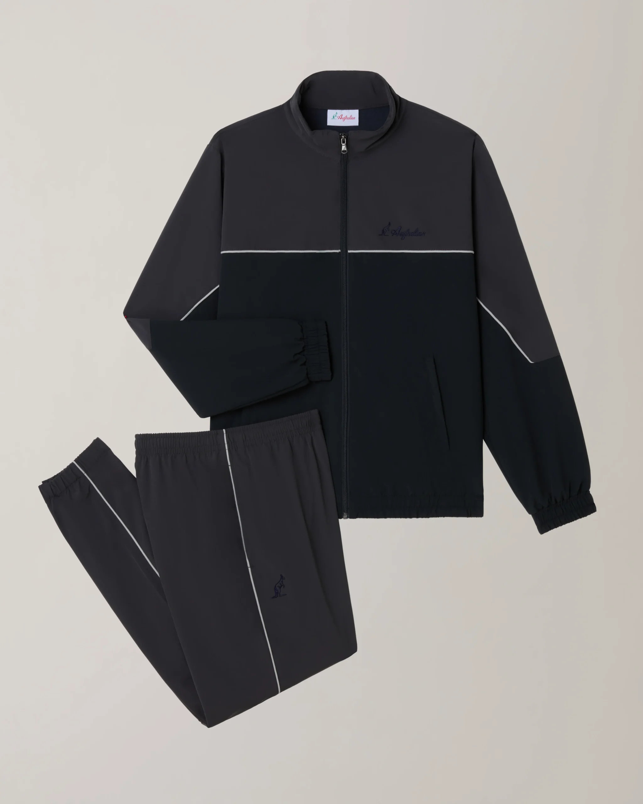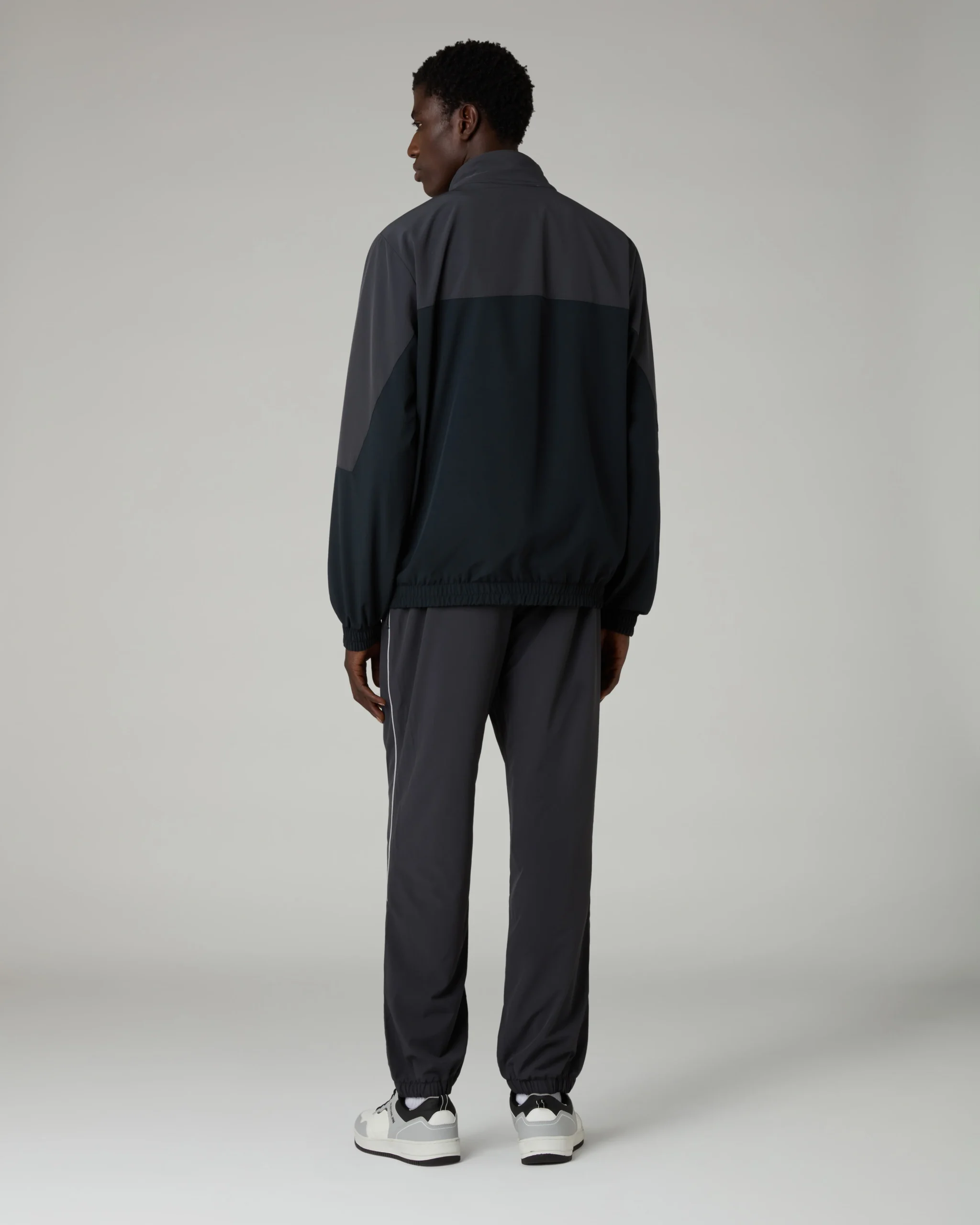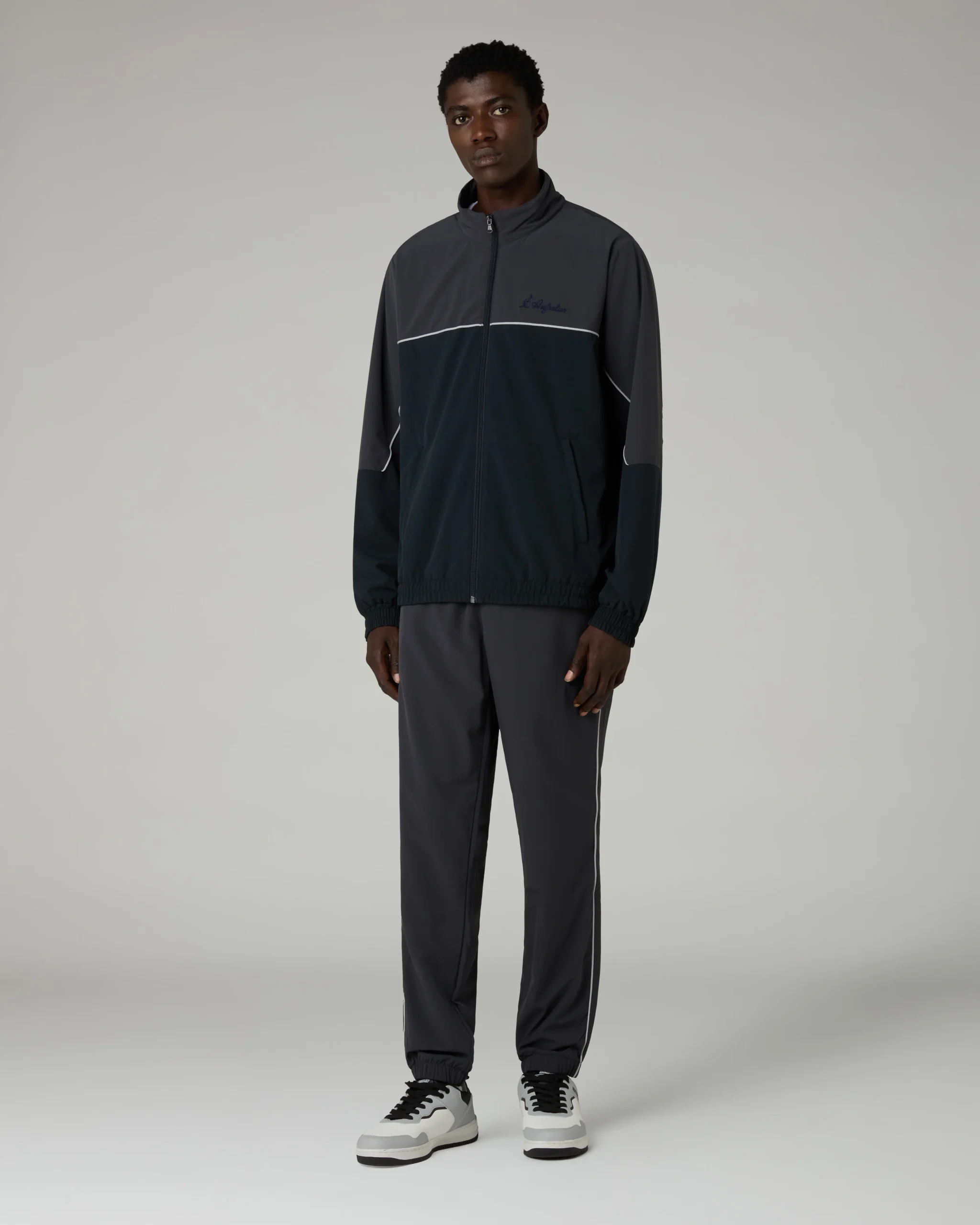 Tuta in tessuto tecnico “slam” foderataGiacca:– Inserti in contrasto sul davanti e maniche– Piping in contrasto– Full zip frontale in contrasto– Tasche con zip– Bordo e polsi elasticizzati– Logo ricamatoPantalone:– Elastico in vita con coulisse regolabile– Piping in contrasto sui fianchi– Fondo elasticizzato– Logo ricamatoMade in Italy