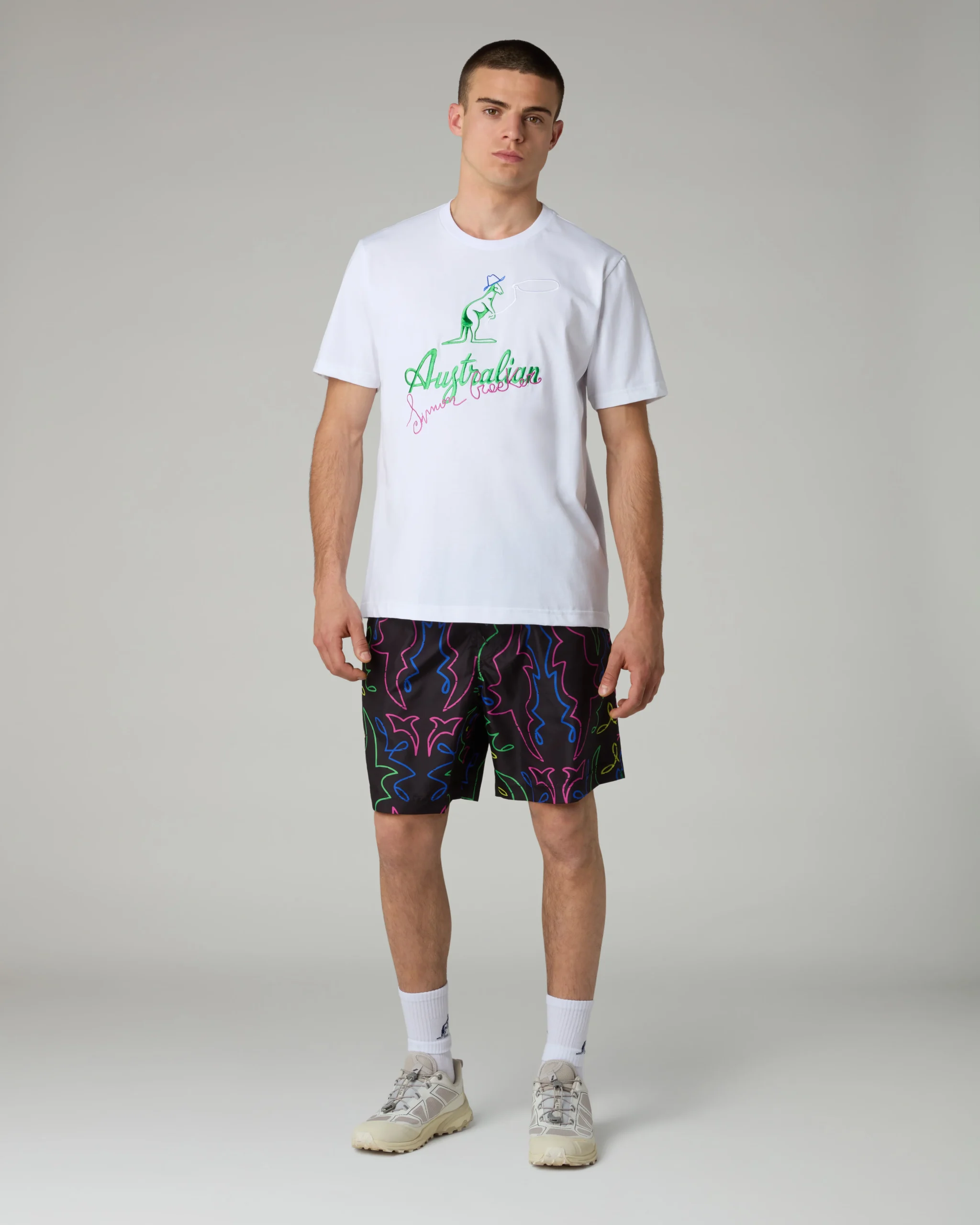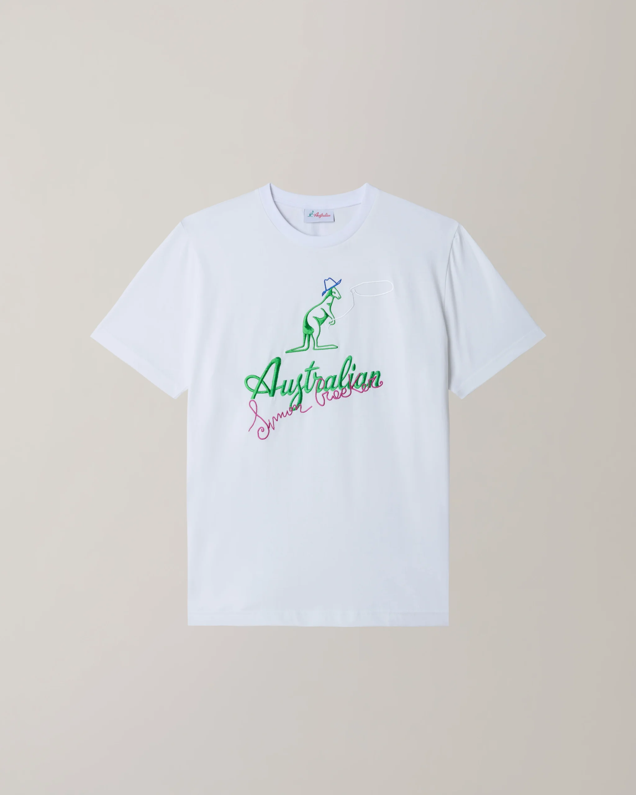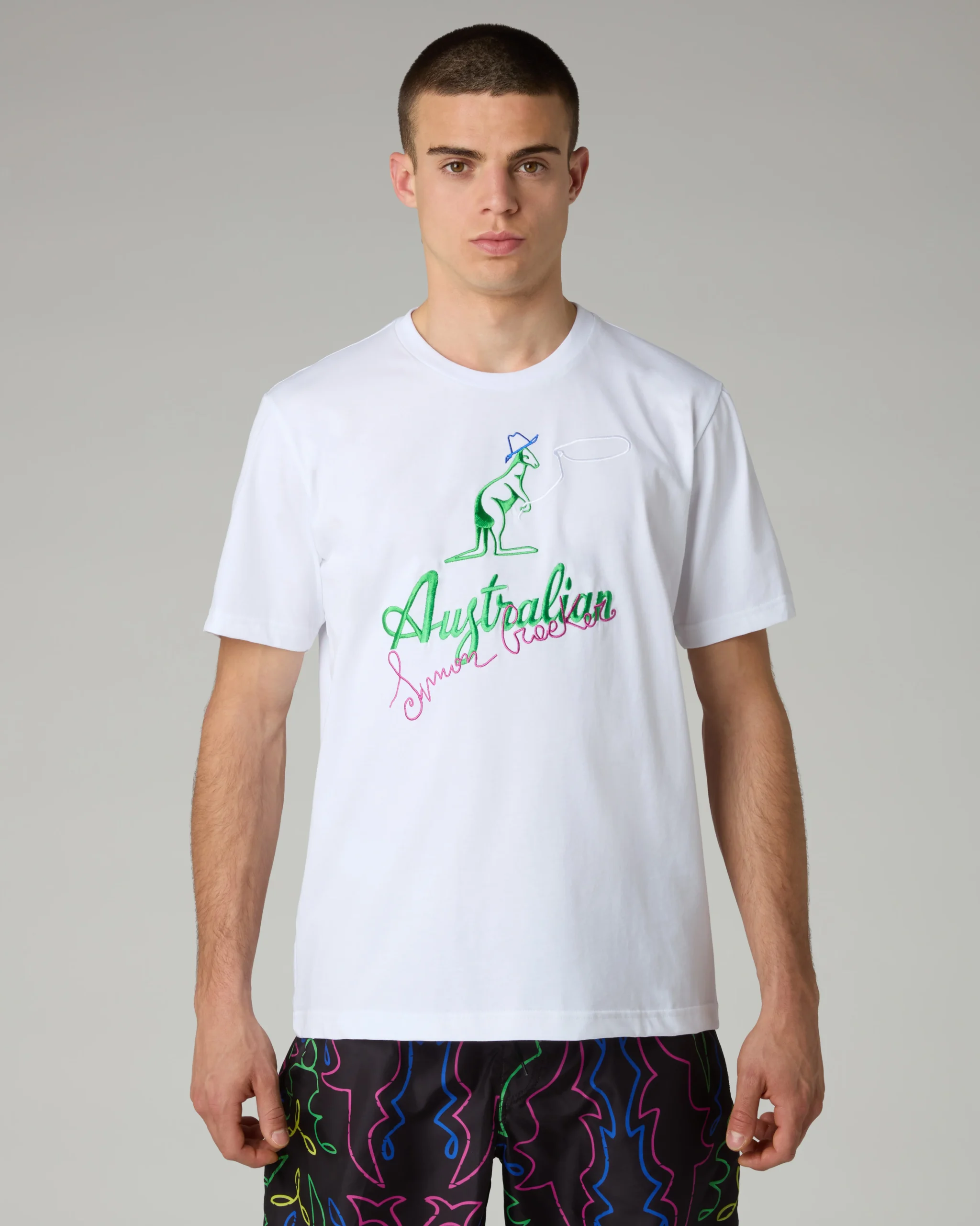 – T-shirt in cotone– Collo in costina elasticizzata – Regular fit– Logo Australian + Simon Cracker ricamato – Made in Italy
