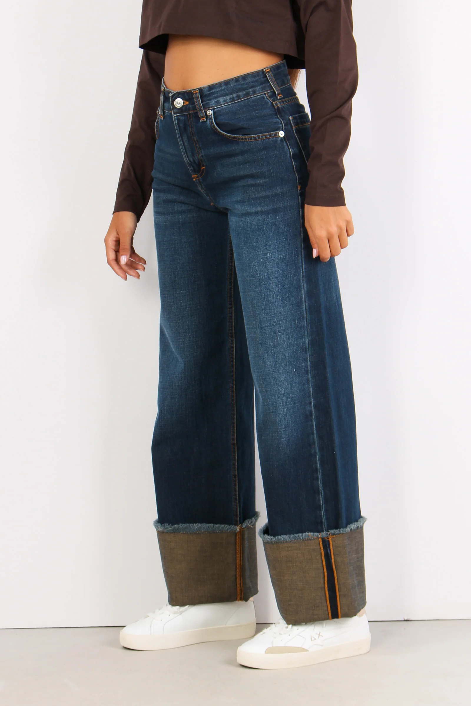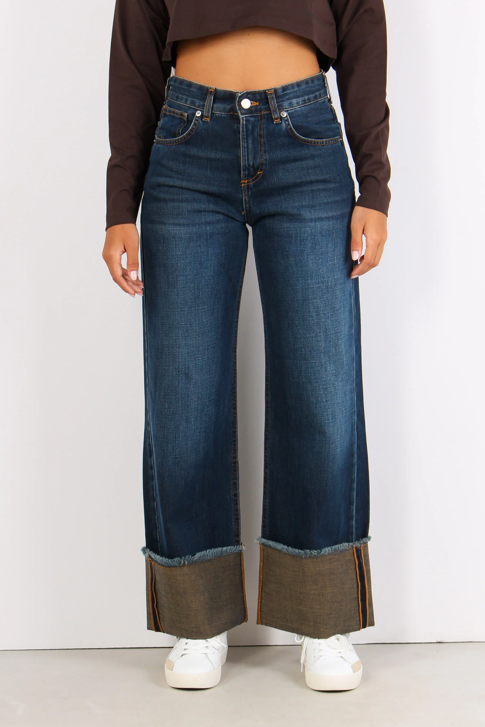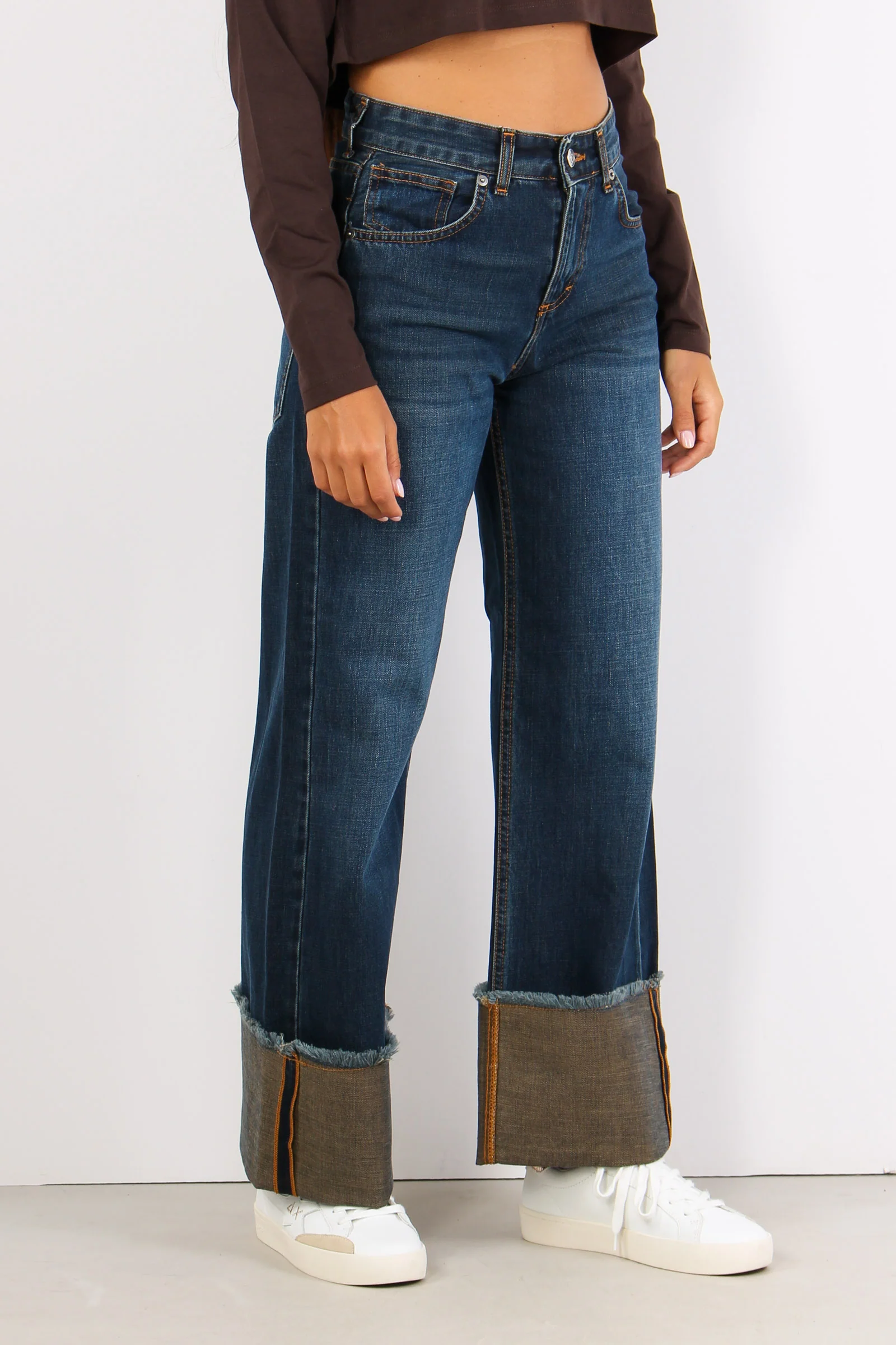 Denim gamba dritta con maxi risvolto terminato con un taglio sfrangiato e una base colore ramata che riprende tutte le cuciture del denim in contrasto. Maxi tasca dietro. Un denim davvero di tendenza che ti accompagnerà tutti i giorni. Composizione articolo: 100% cotone La modella è alta 1 75 e