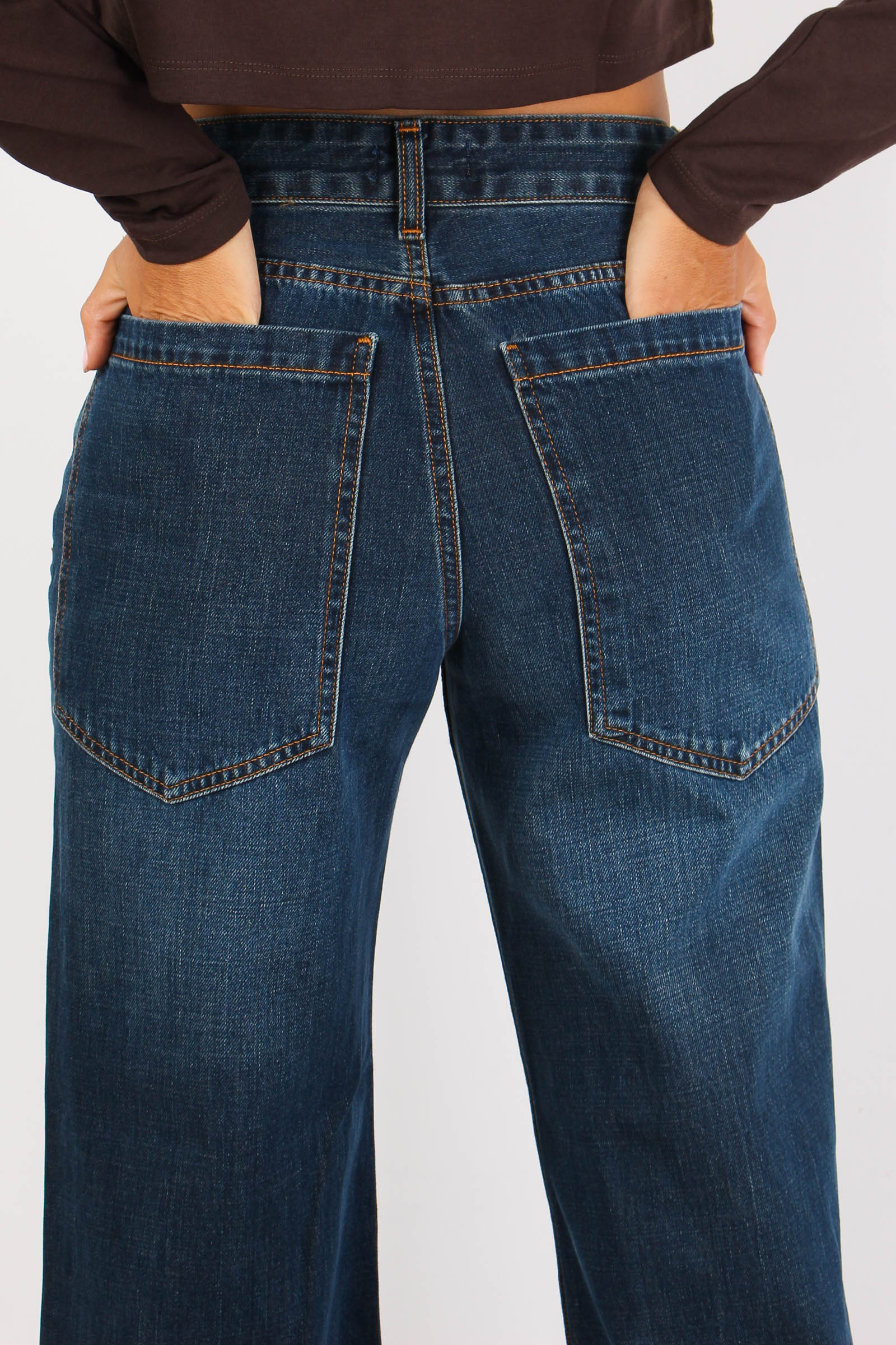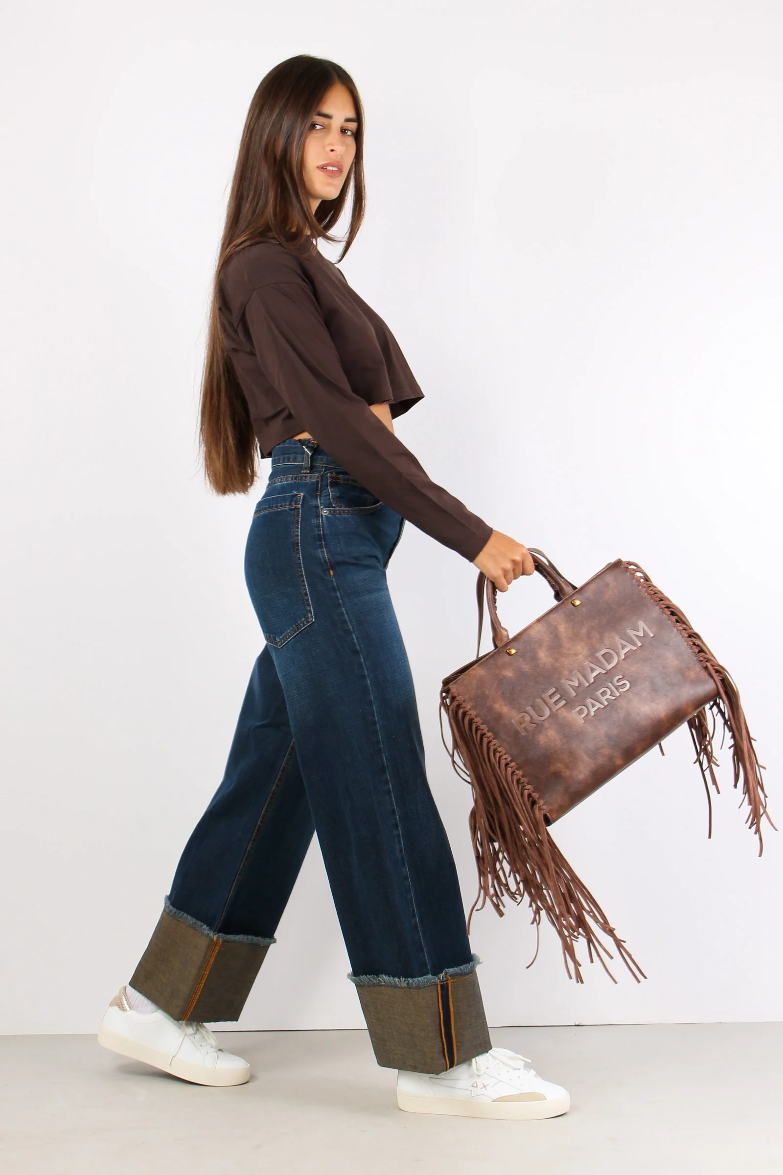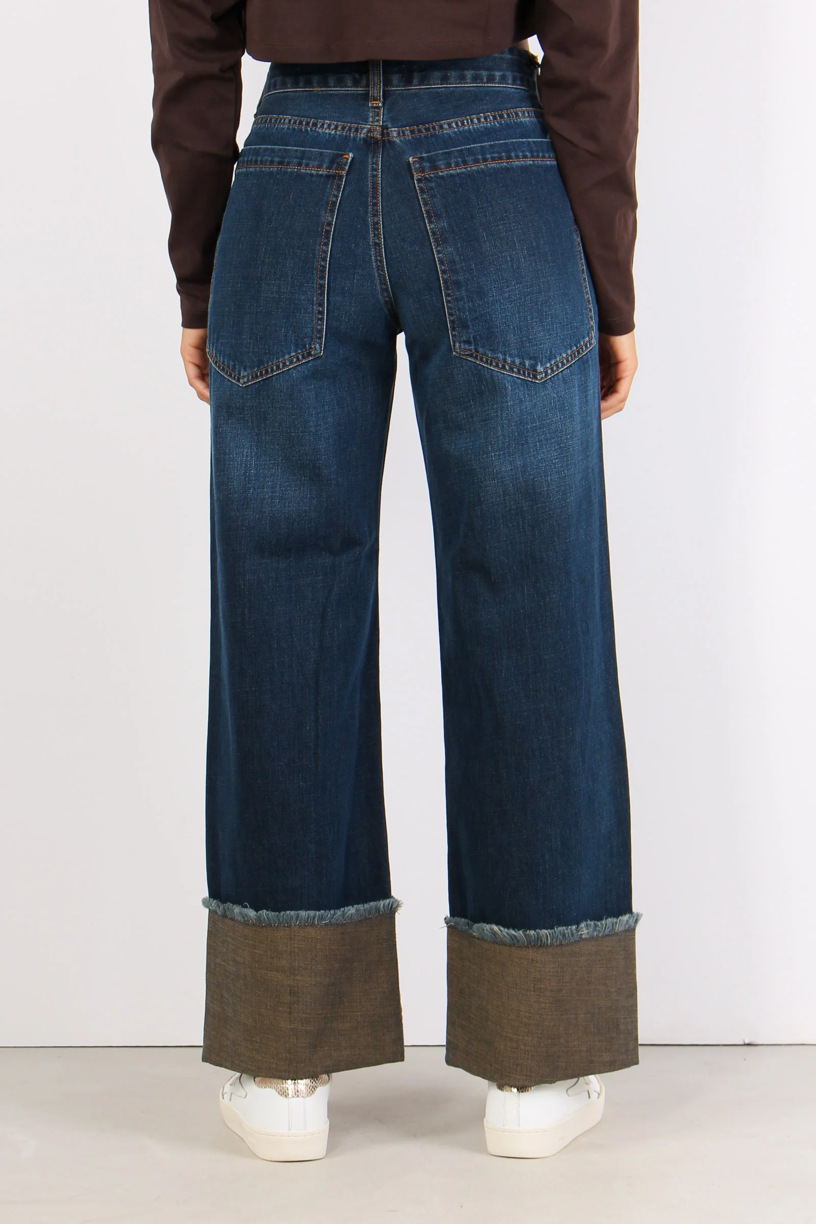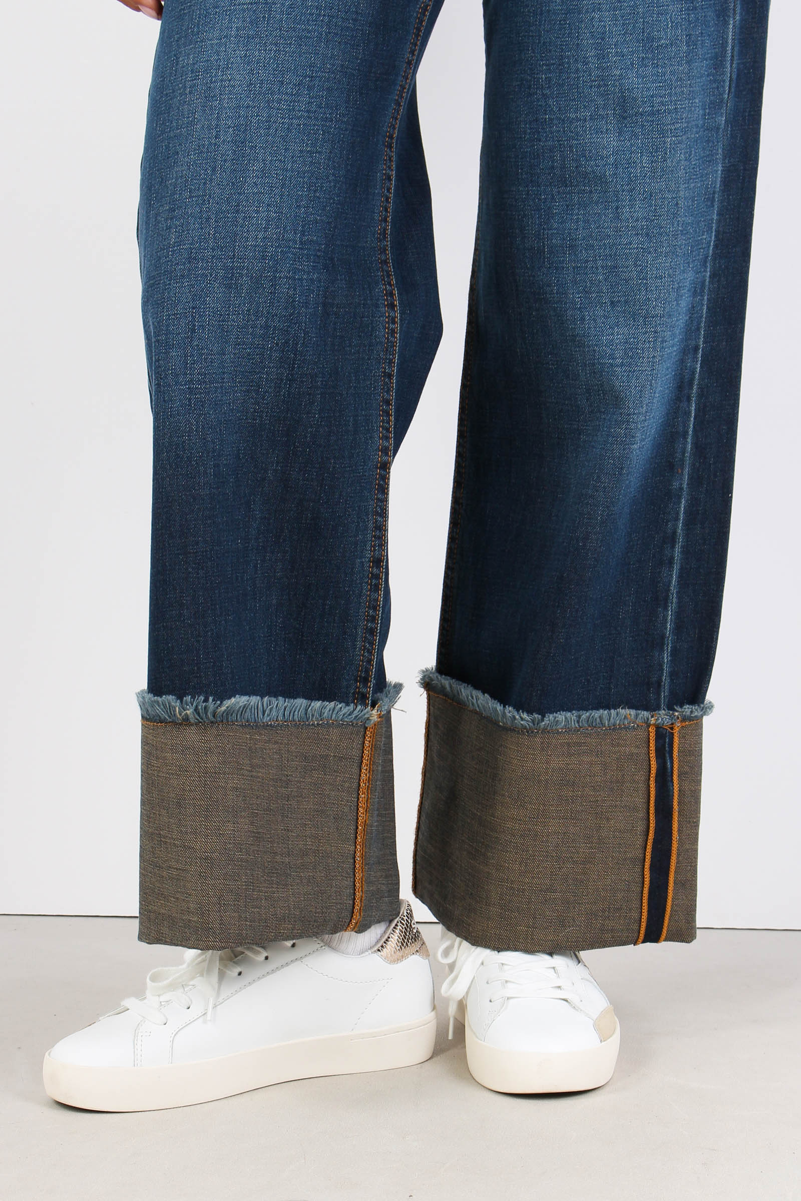 Denim gamba dritta con maxi risvolto terminato con un taglio sfrangiato e una base colore ramata che riprende tutte le cuciture del denim in contrasto. Maxi tasca dietro. Un denim davvero di tendenza che ti accompagnerà tutti i giorni. Composizione articolo: 100% cotone La modella è alta 1 75 e