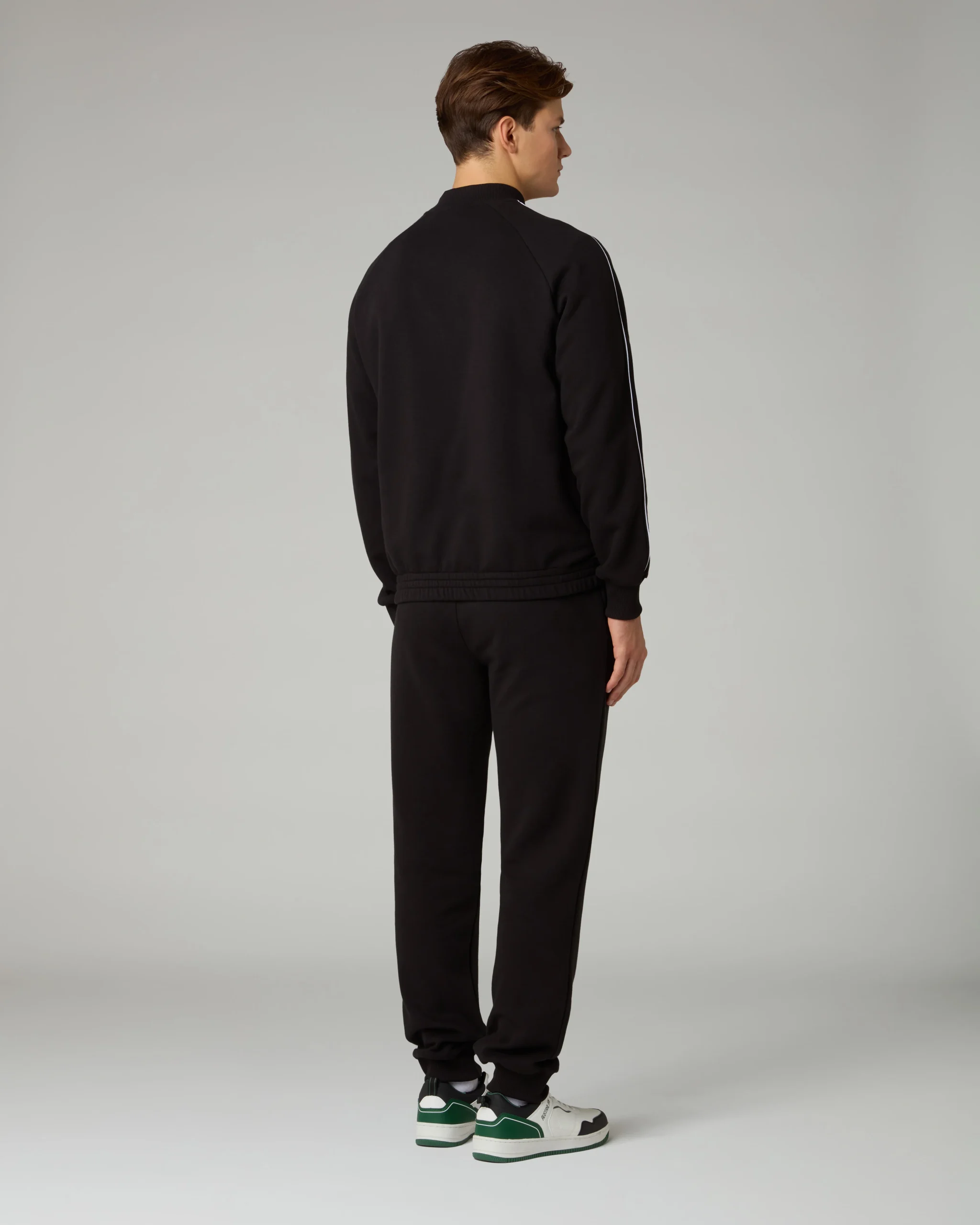 Tuta in calda felpa invernaleGiacca:– Piping in contrasto sulle maniche– Bordo vita in elastico– Polsi in costina– Full zip frontale– Tasche con zipPantalone:– Elastico in vita con coulisse regolabile– Fondo in costina– Logo ricamatoMade in Italy