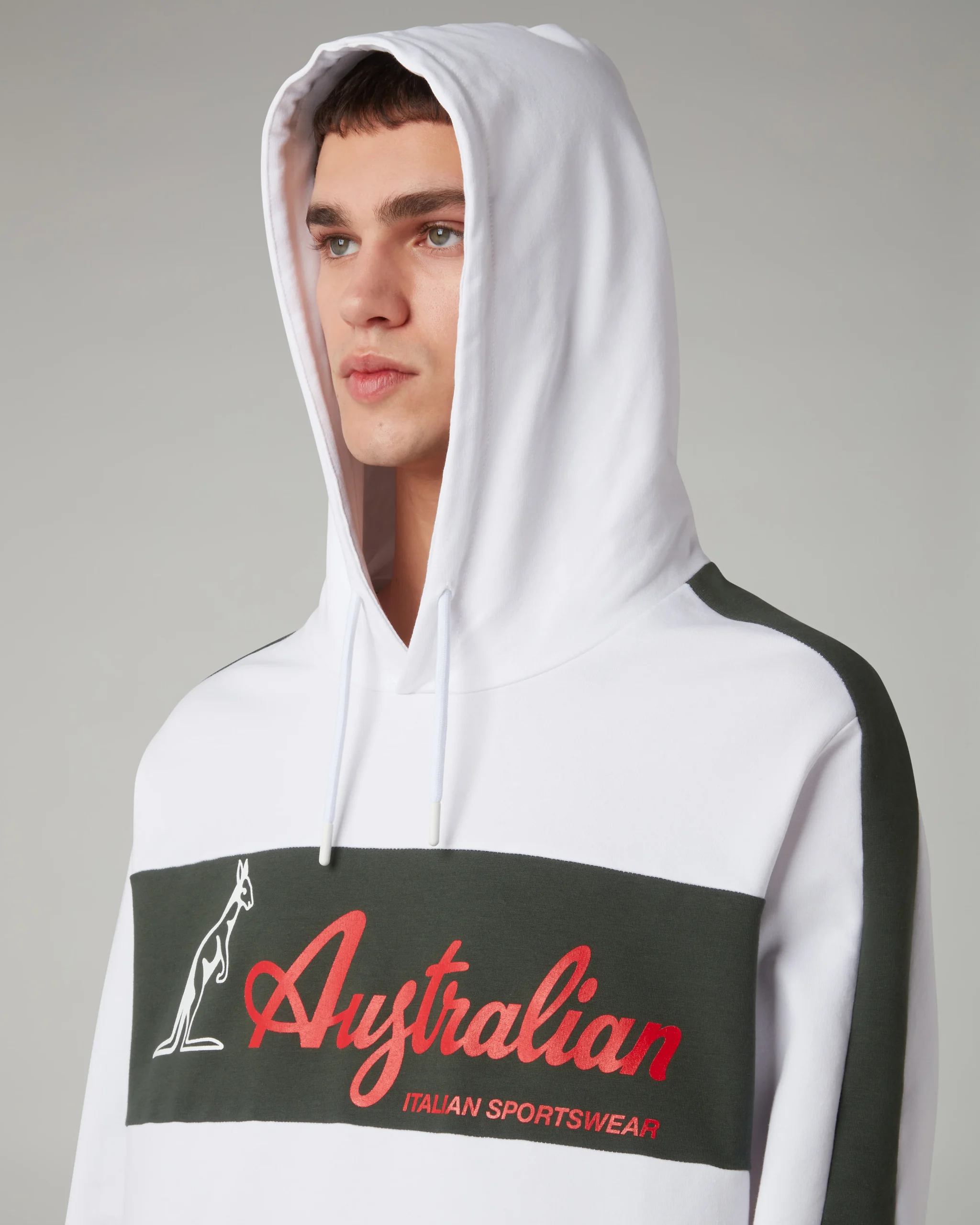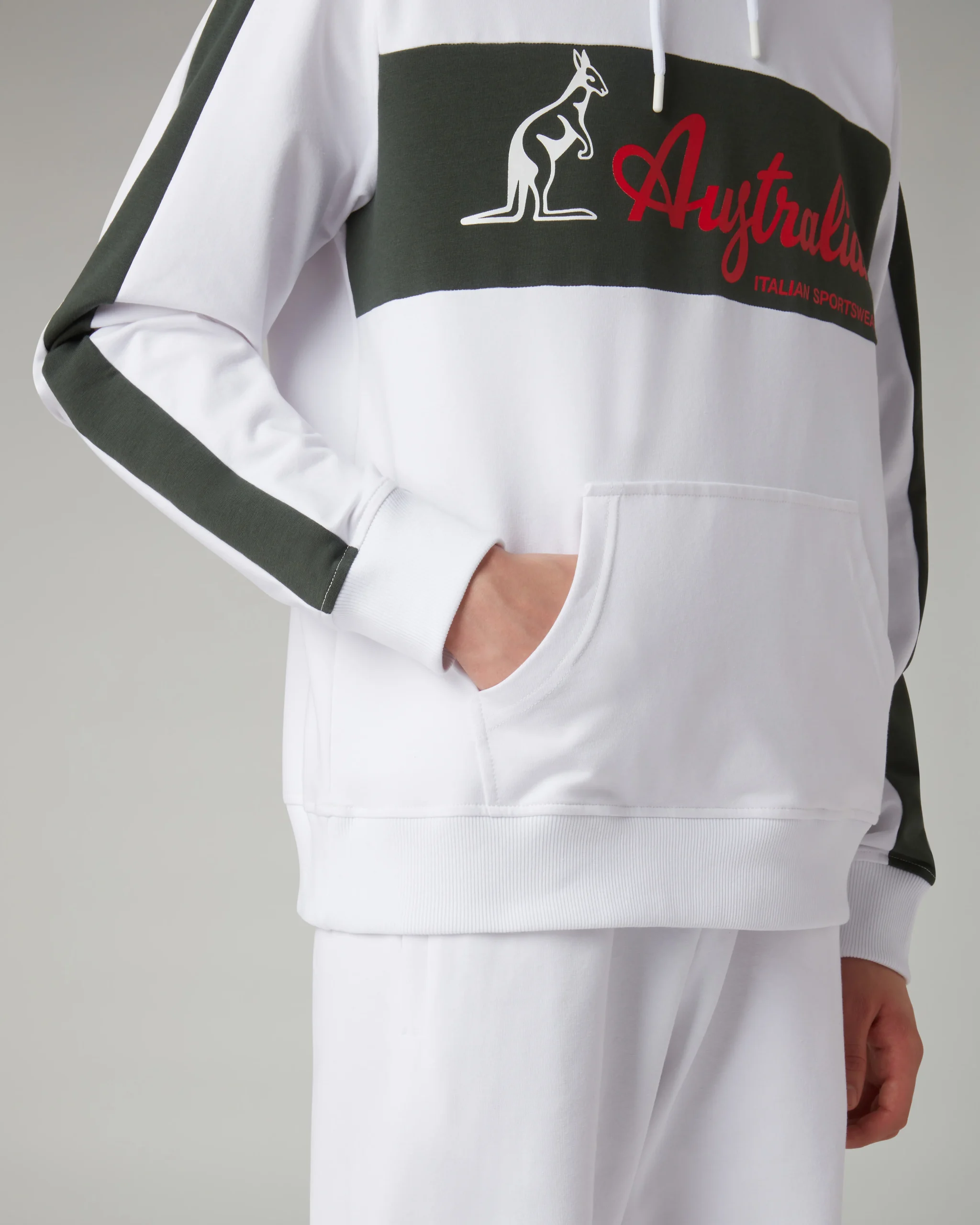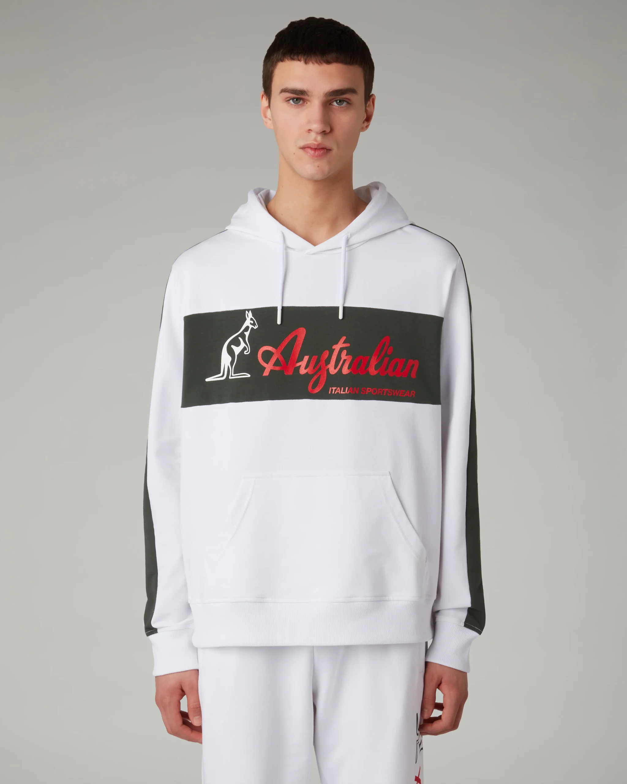 – Felpa con cappuccio elasticizzata– Cappuccio con coulisse regolabile– Inserti in contrasto– Tasca applicata a marsupio– Stampa serigrafica sul petto– Bordo e polsi in costina elasticizzata– Made in Italy