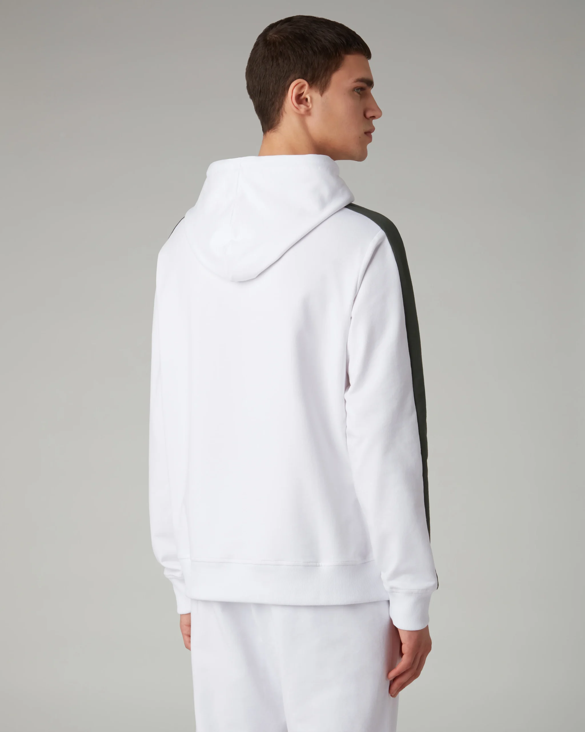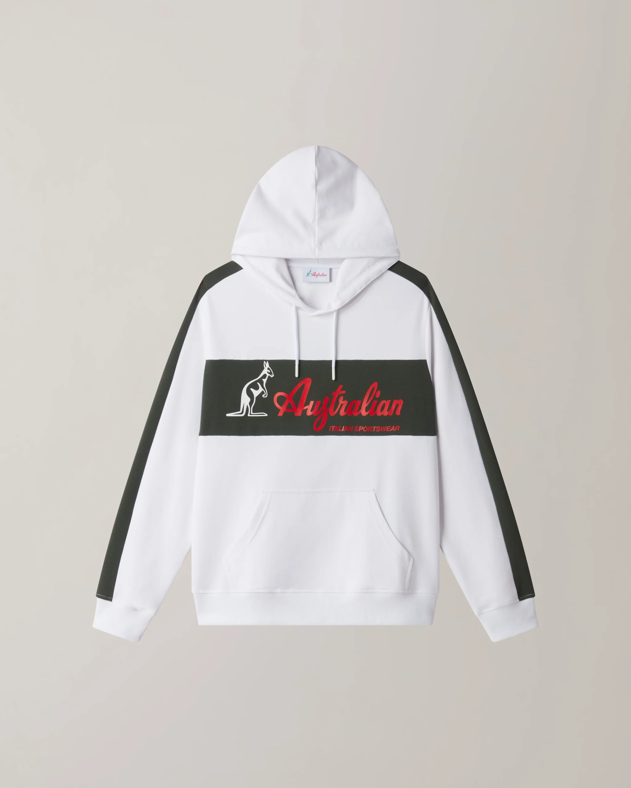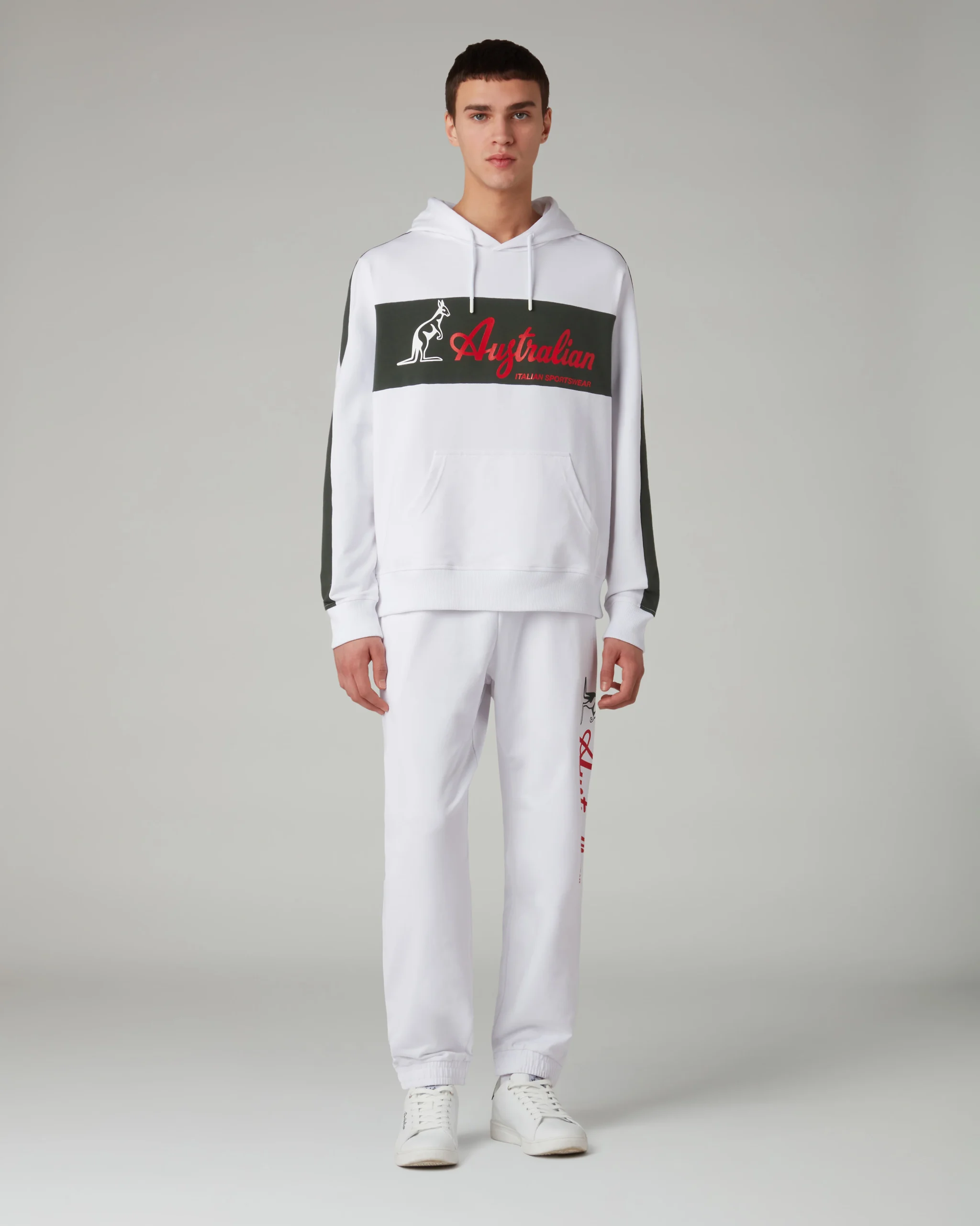 – Felpa con cappuccio elasticizzata– Cappuccio con coulisse regolabile– Inserti in contrasto– Tasca applicata a marsupio– Stampa serigrafica sul petto– Bordo e polsi in costina elasticizzata– Made in Italy