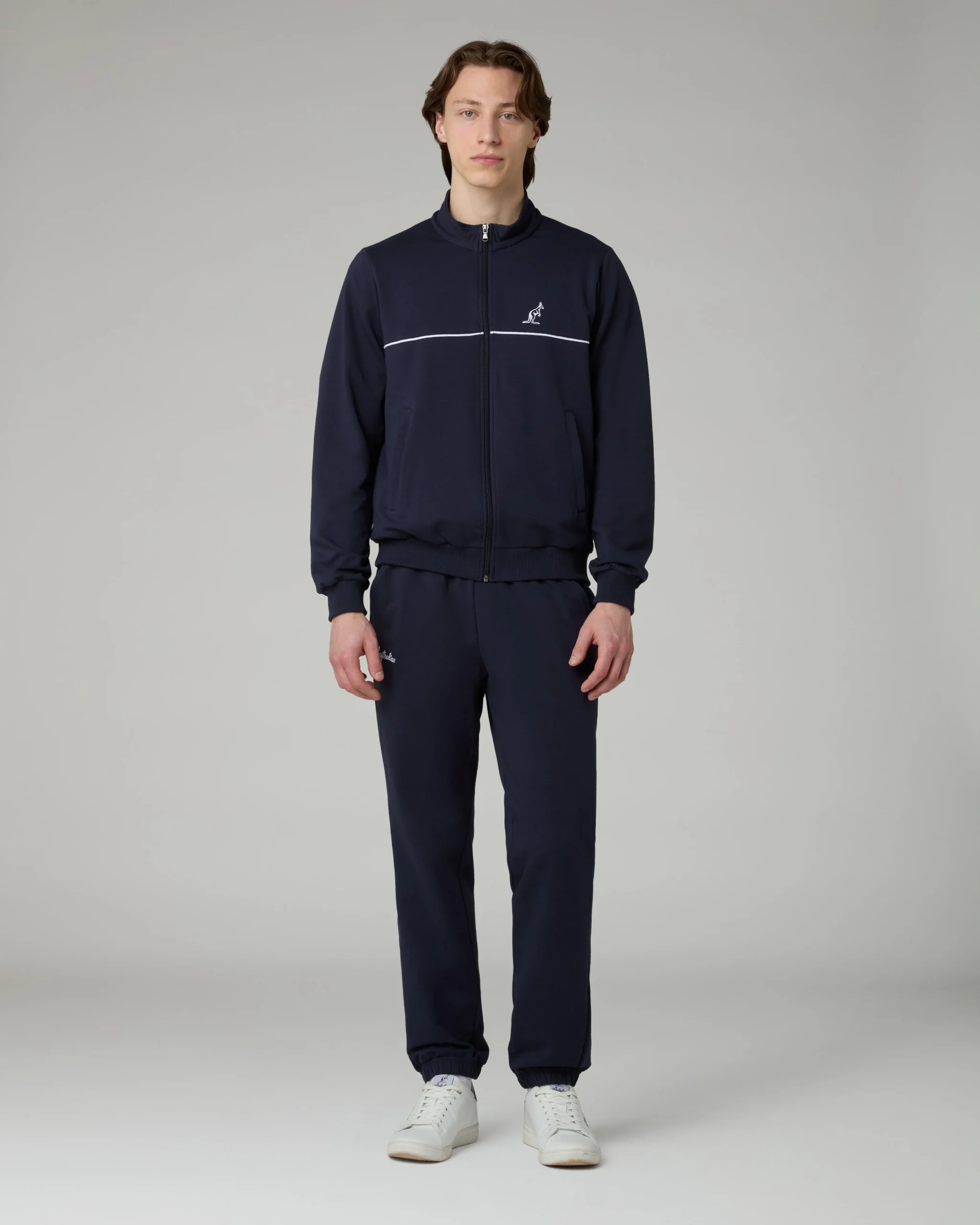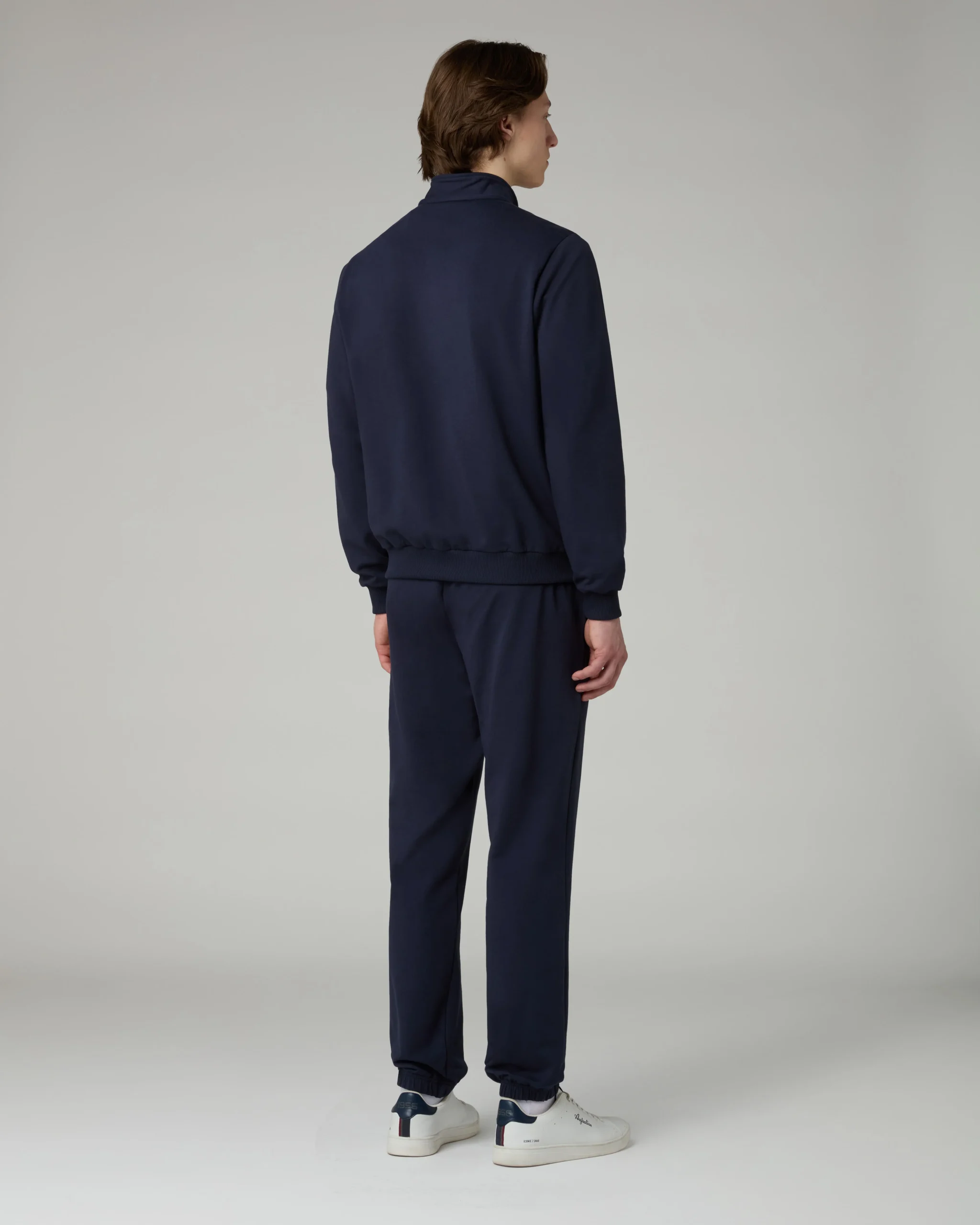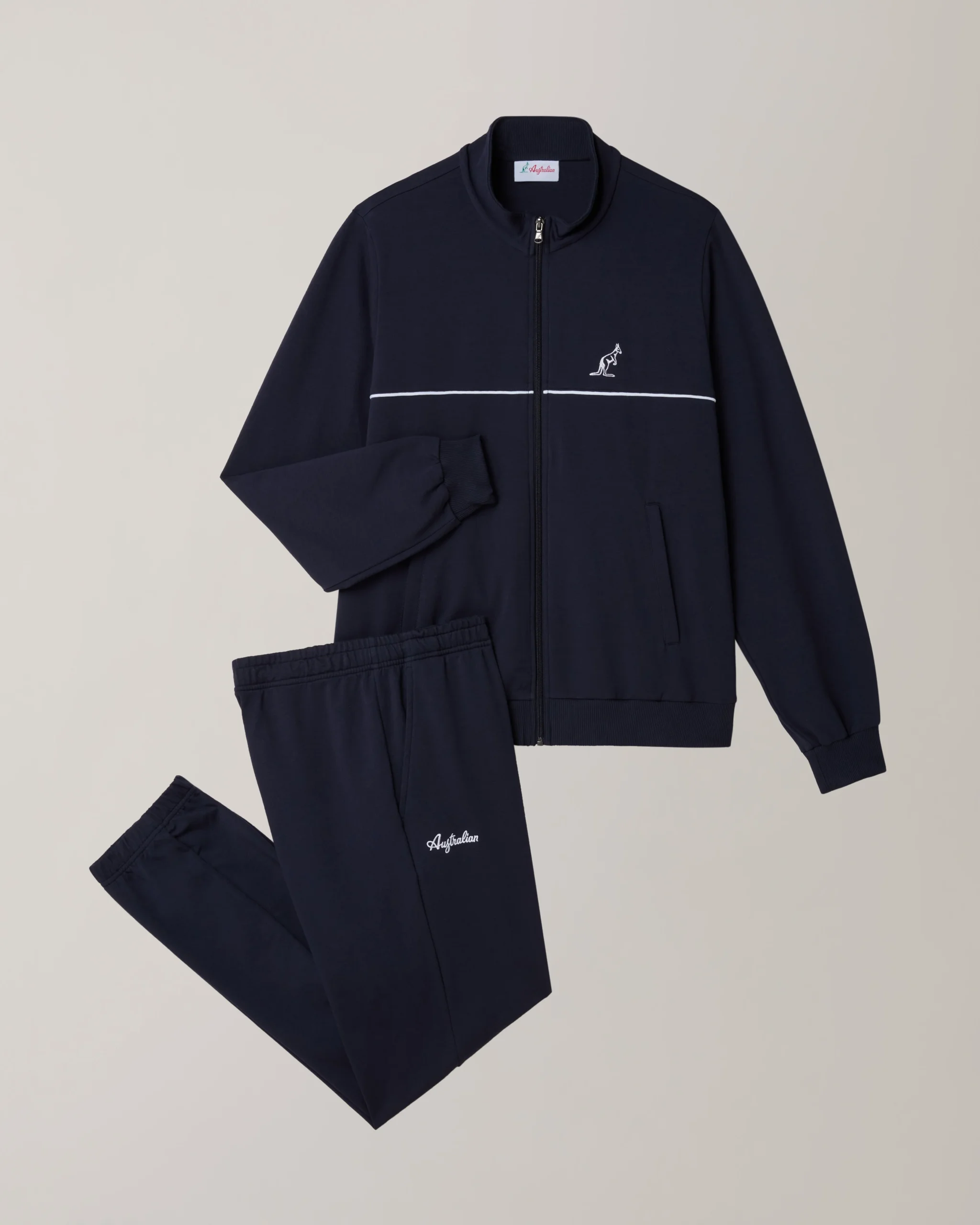 Tuta in felpa elasticizzata Giacca:– Piping in contrasto sul davanti– Full zip frontale– Tasche laterali con zip– Bordo e polsi in costina– Logo ricamatoPantalone:– Elastico in vita con coulisse regolabile– Fondo elasticizzato– Logo ricamatoMade in Italy
