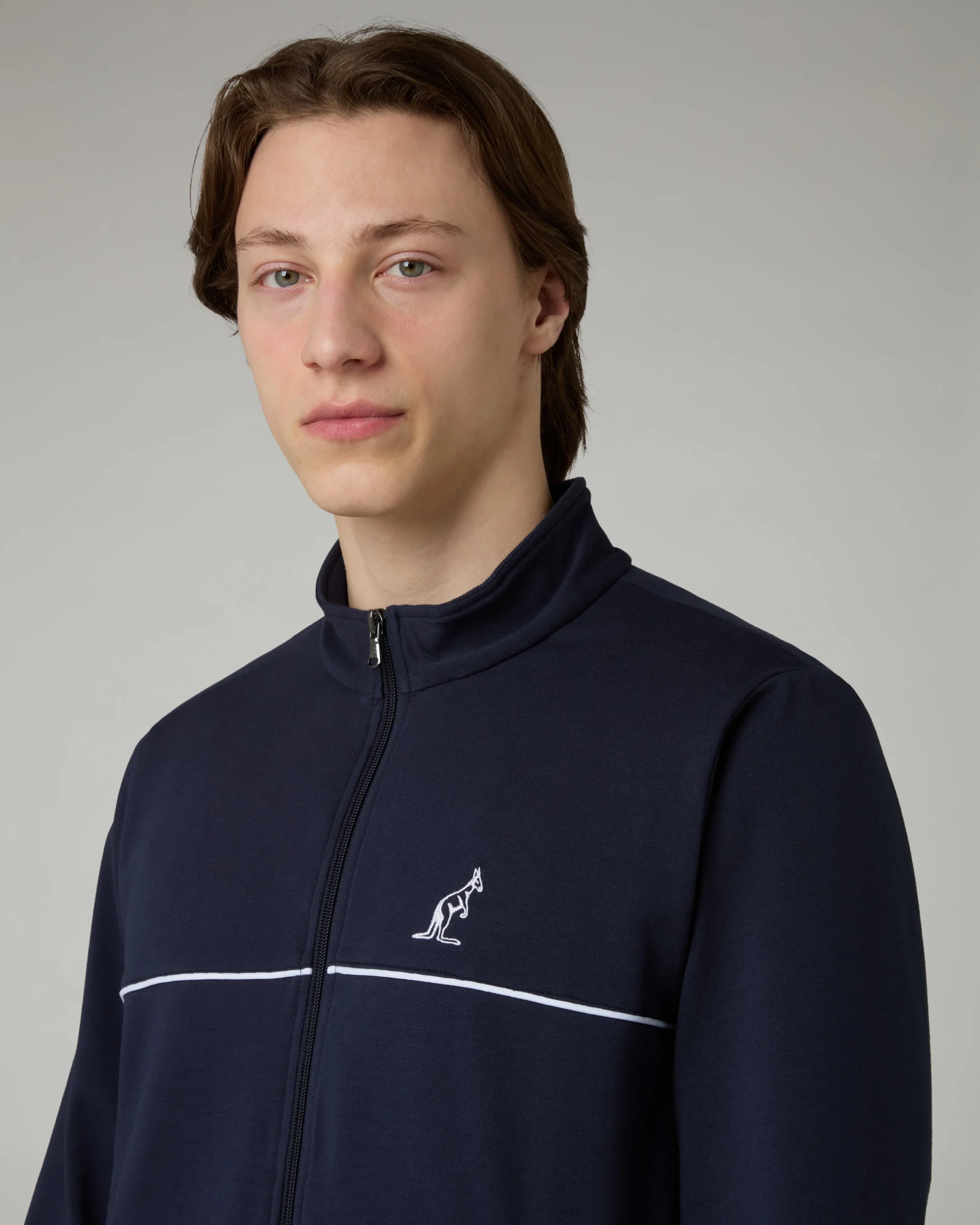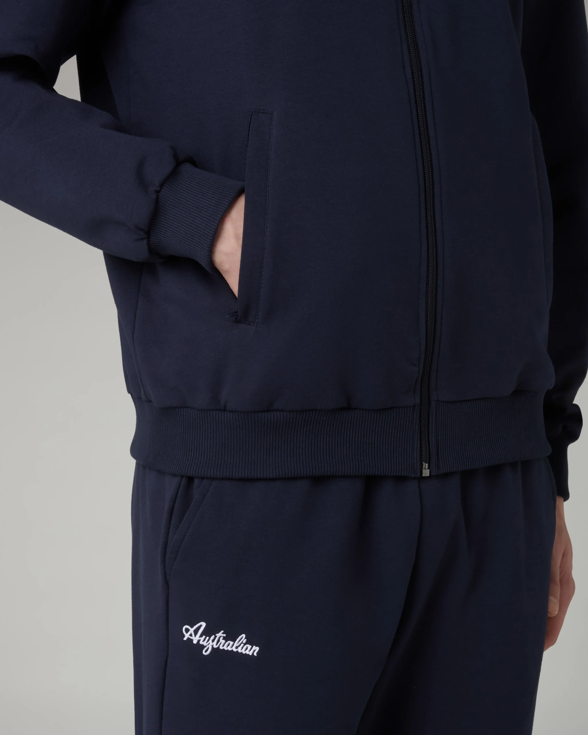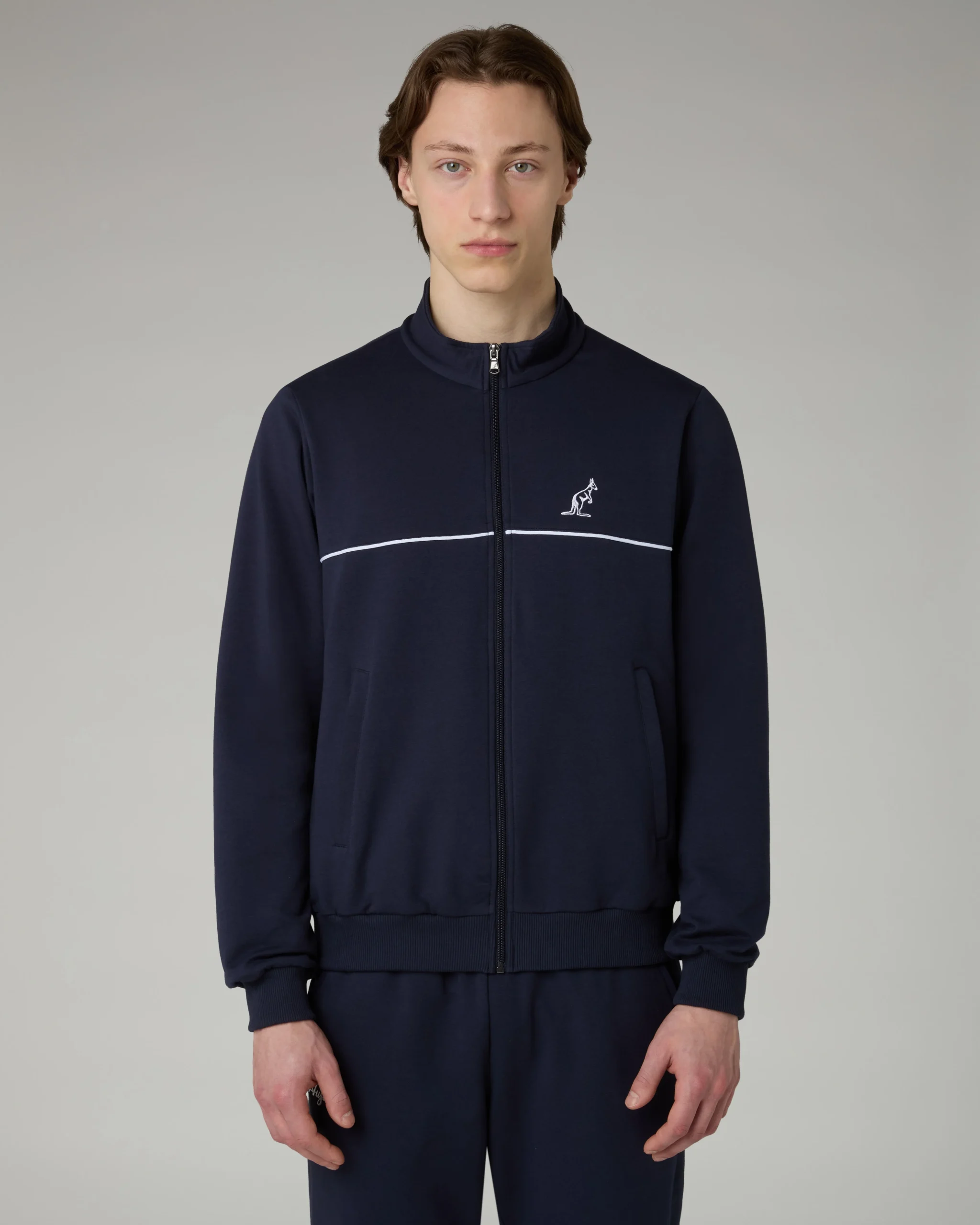 Tuta in felpa elasticizzata Giacca:– Piping in contrasto sul davanti– Full zip frontale– Tasche laterali con zip– Bordo e polsi in costina– Logo ricamatoPantalone:– Elastico in vita con coulisse regolabile– Fondo elasticizzato– Logo ricamatoMade in Italy