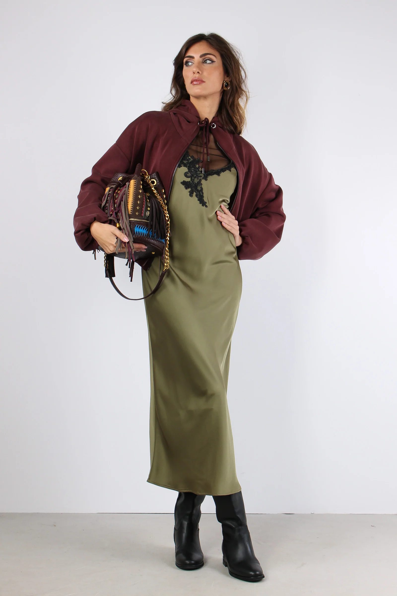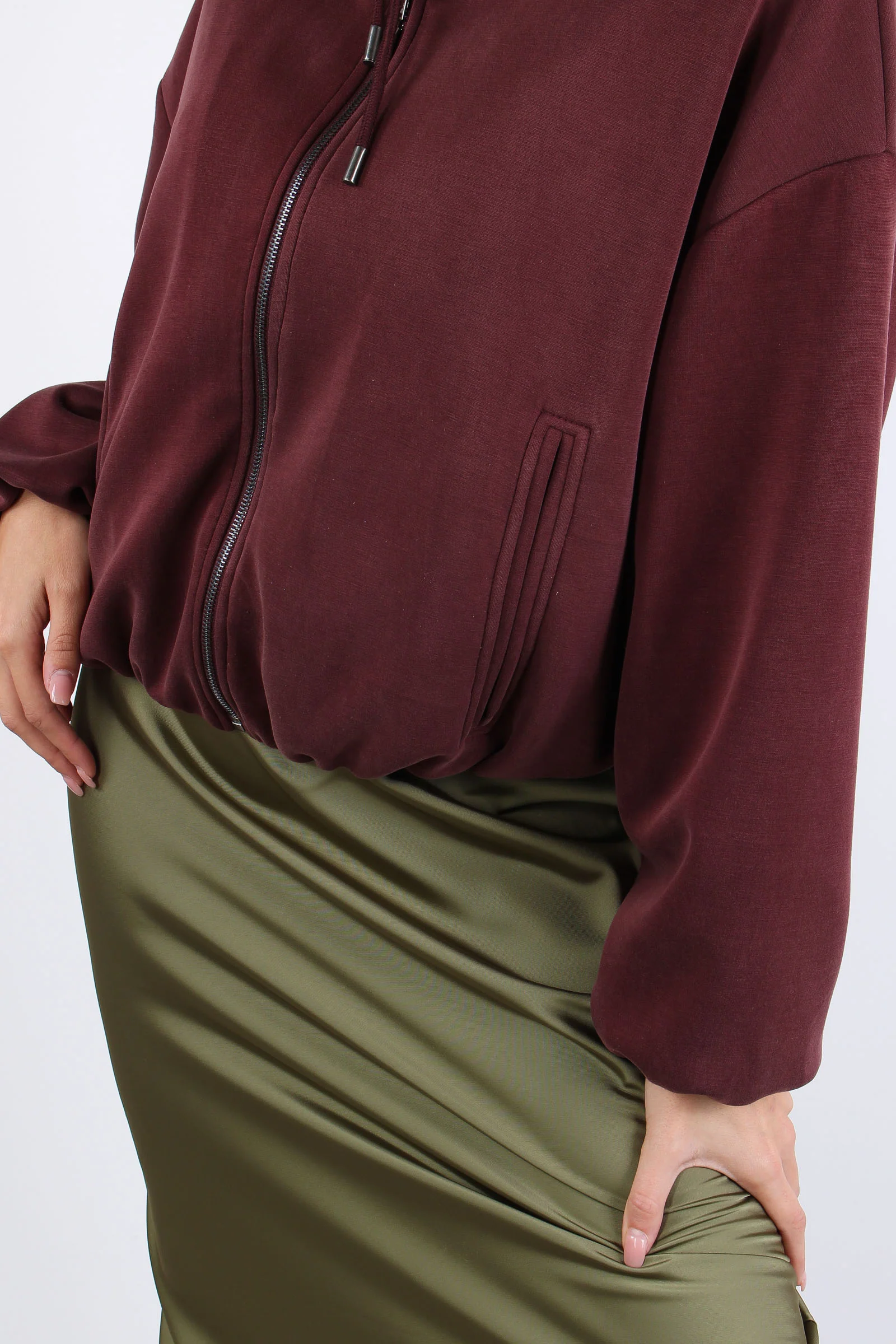 Felpa in modal effetto bomber con cappuccio e chiusura zip. L’interno di questa felpa è totalmente foderato dandoti la possibilità di utilizzarla anche come capo spalla. Composizione articolo: 49% poliestere 44% viscosa 07% elastan La modella è alta 1 75 e indossa una tg. S.