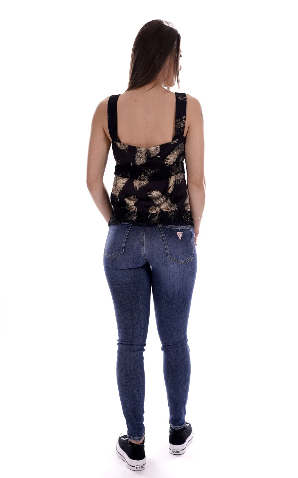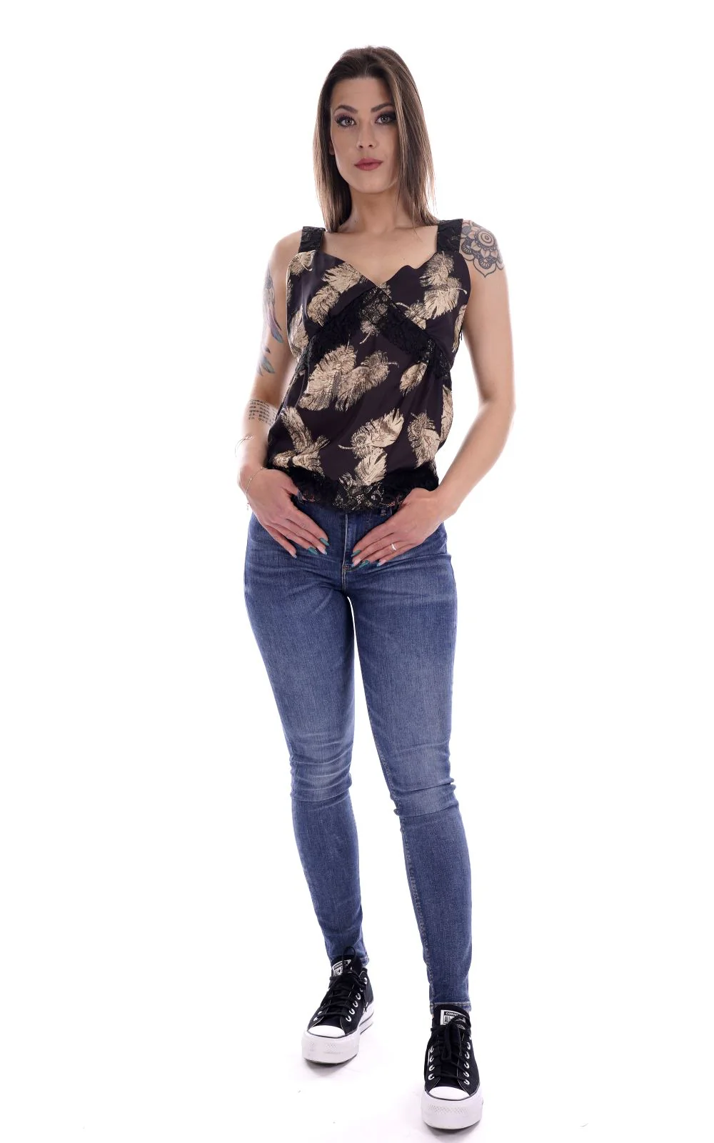 GAELLE Top a canotta nero da donna , in raso . Stampa foglie beige con dettagli in pizzo