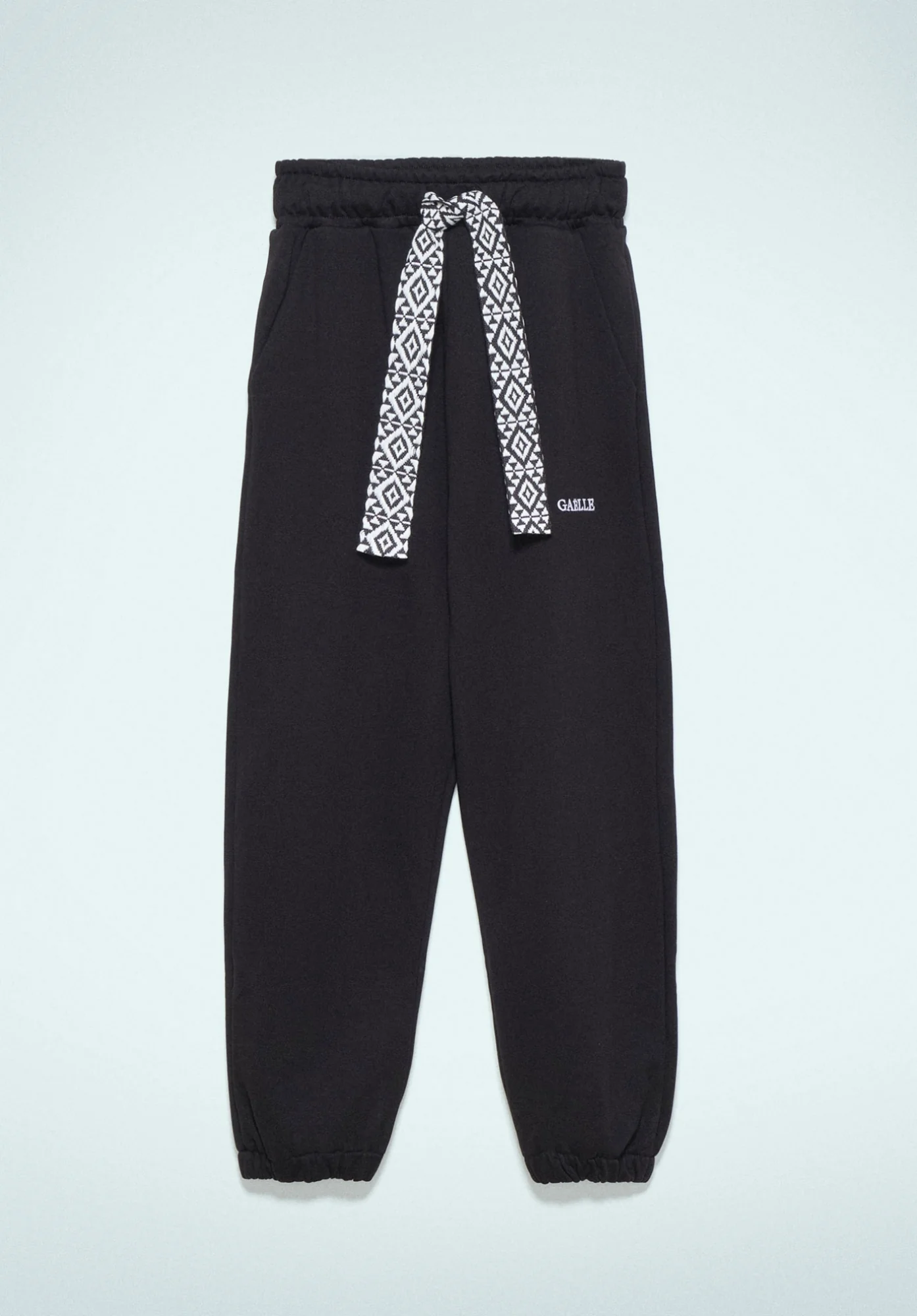 GAELLE Pantalone di tuta nero da donna in cotone felpato . Modello con polsini , nastro bianco in vita con stampa atzeca e due tasche . Logo Gaelle sulla gamba sinistra . Vestibilita’ oversize