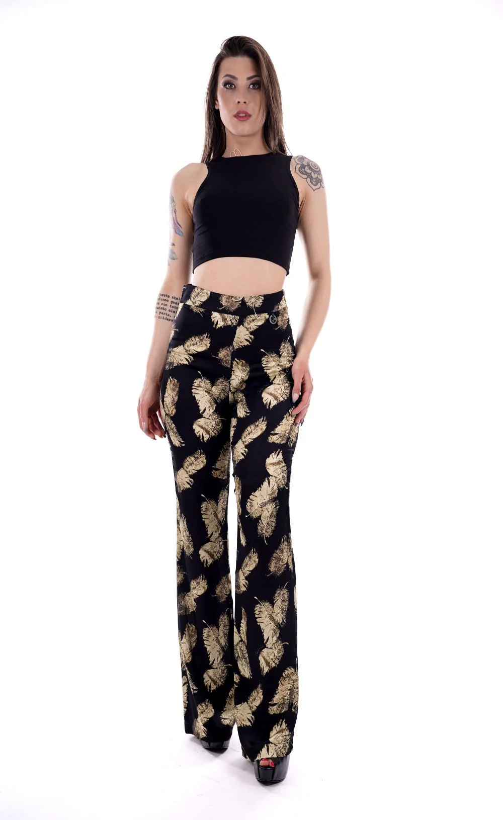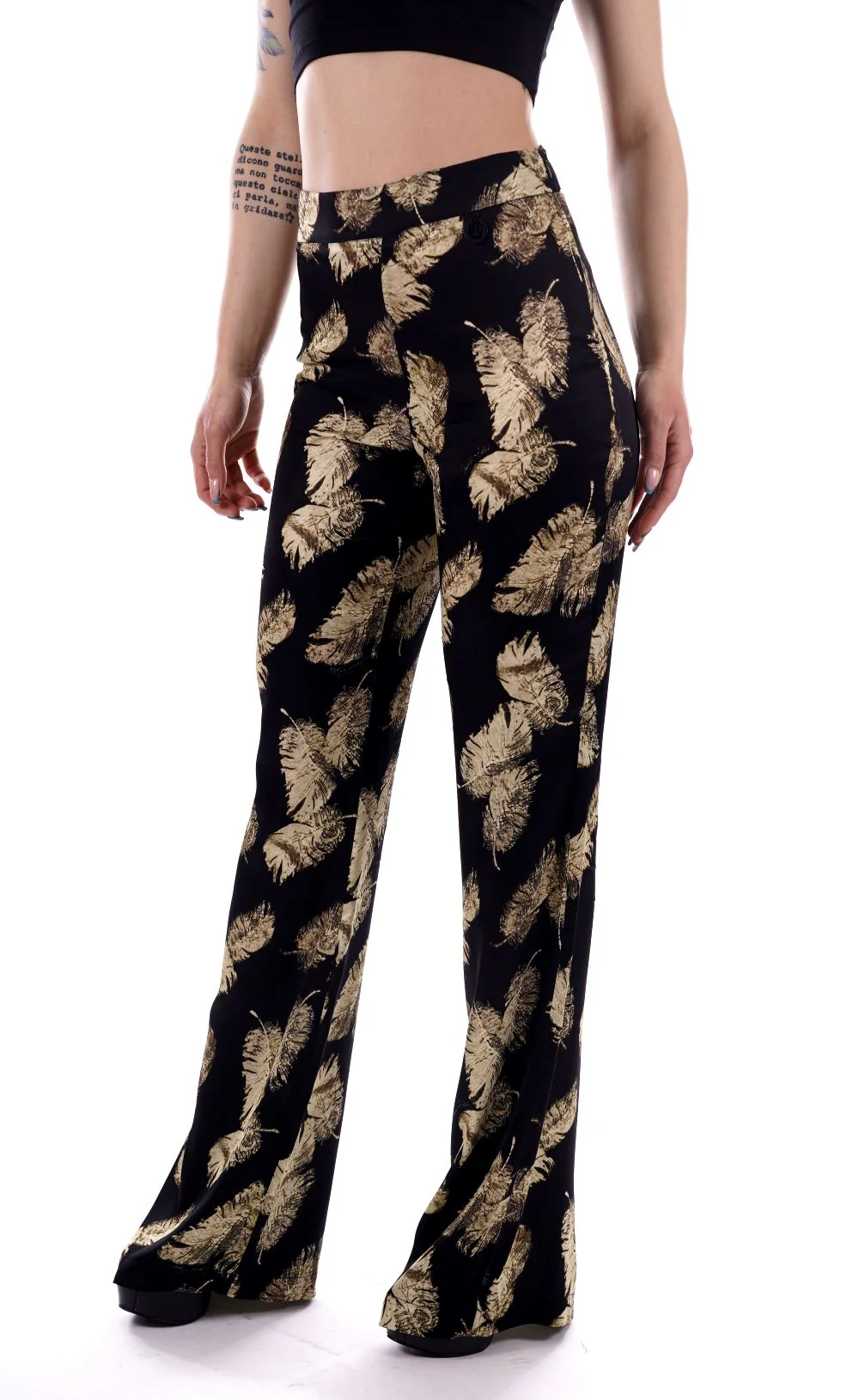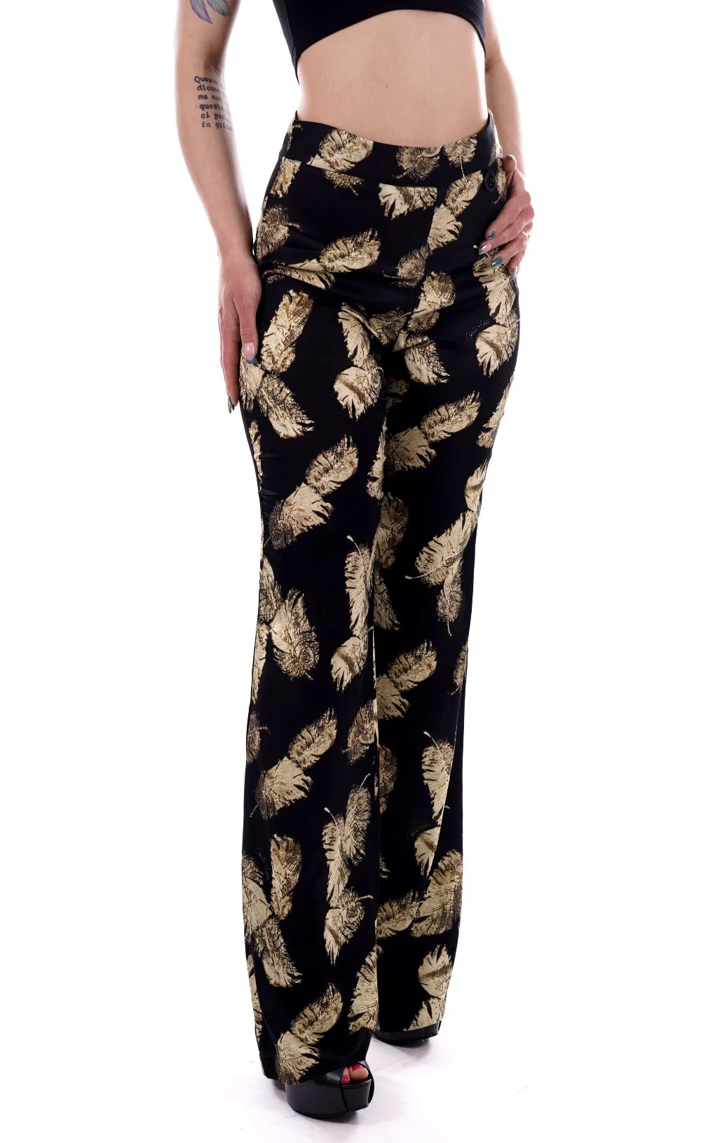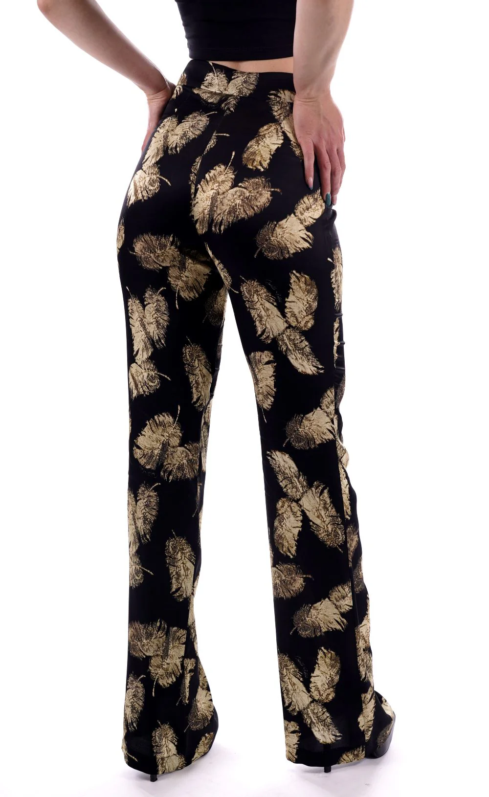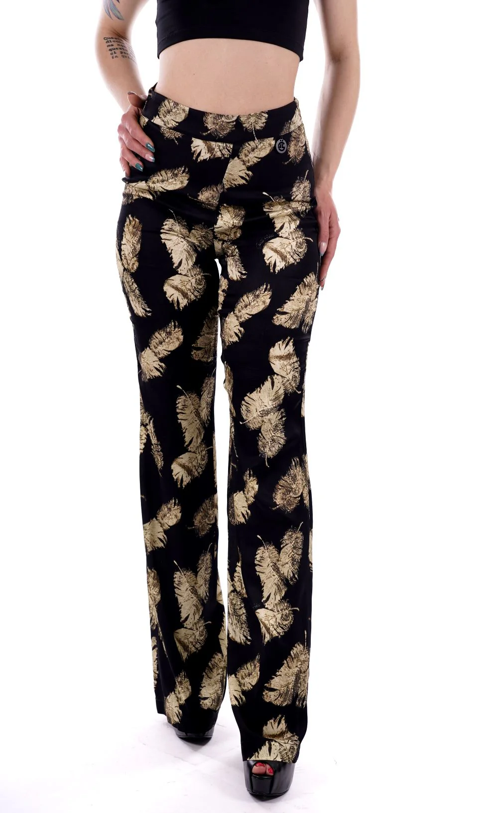 GAELLE Pantalone nero da donna in raso , con stampa foglie . Gamba dritta e larga