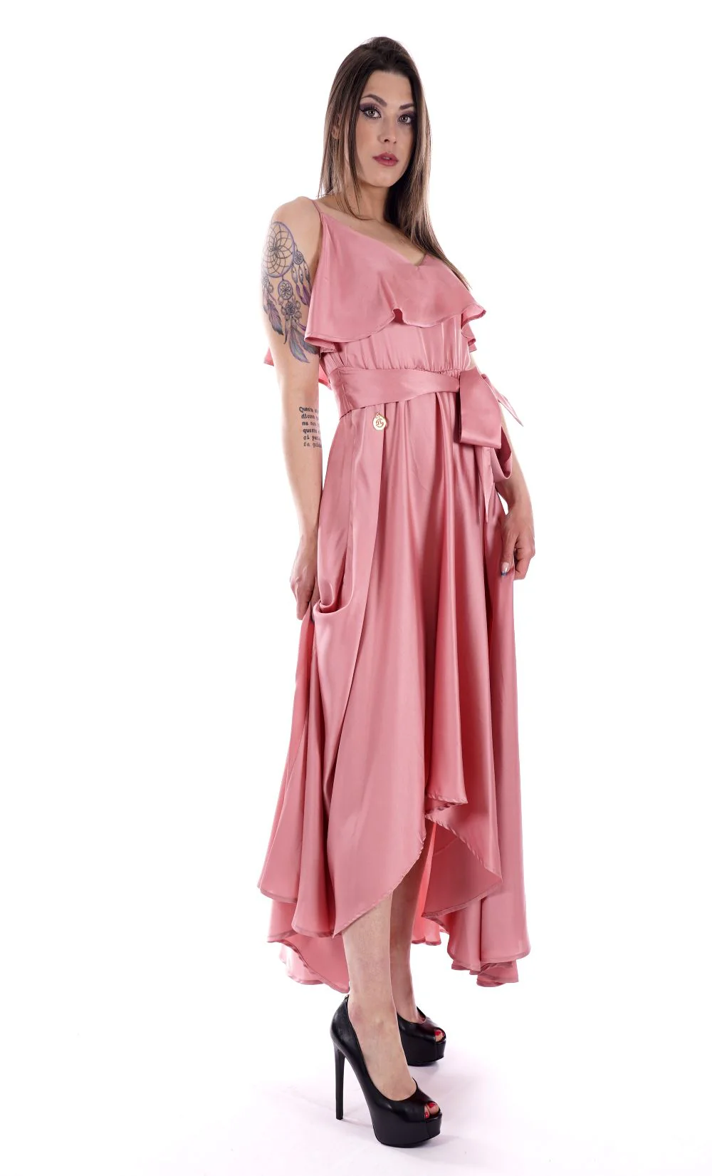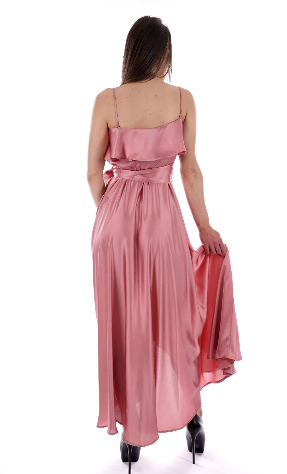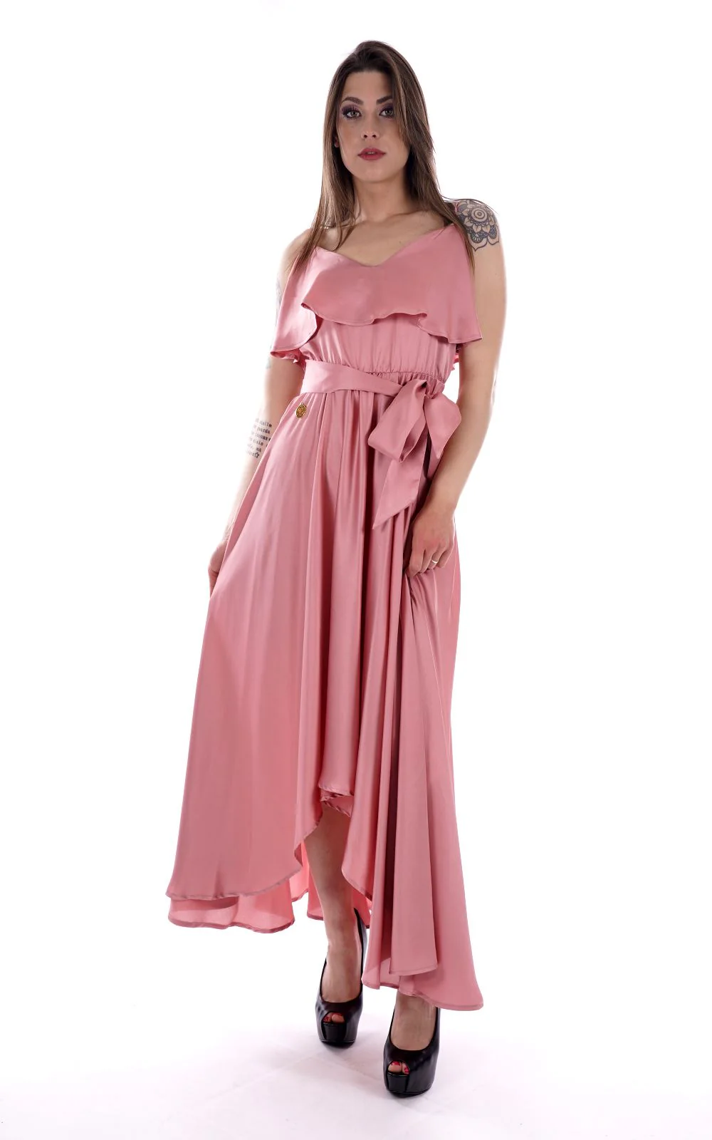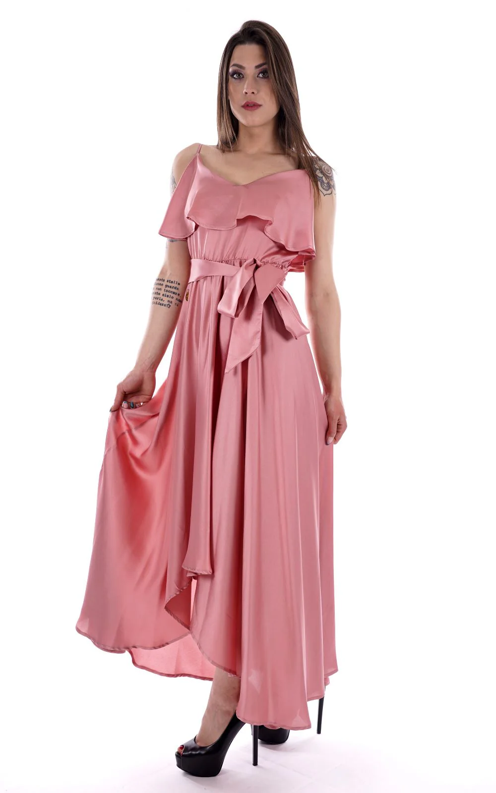 GAELLE Vestito lungo rosa antico da donna , in raso . Stondato con balza . Bretella sottile . Cintura con fiocco in vita