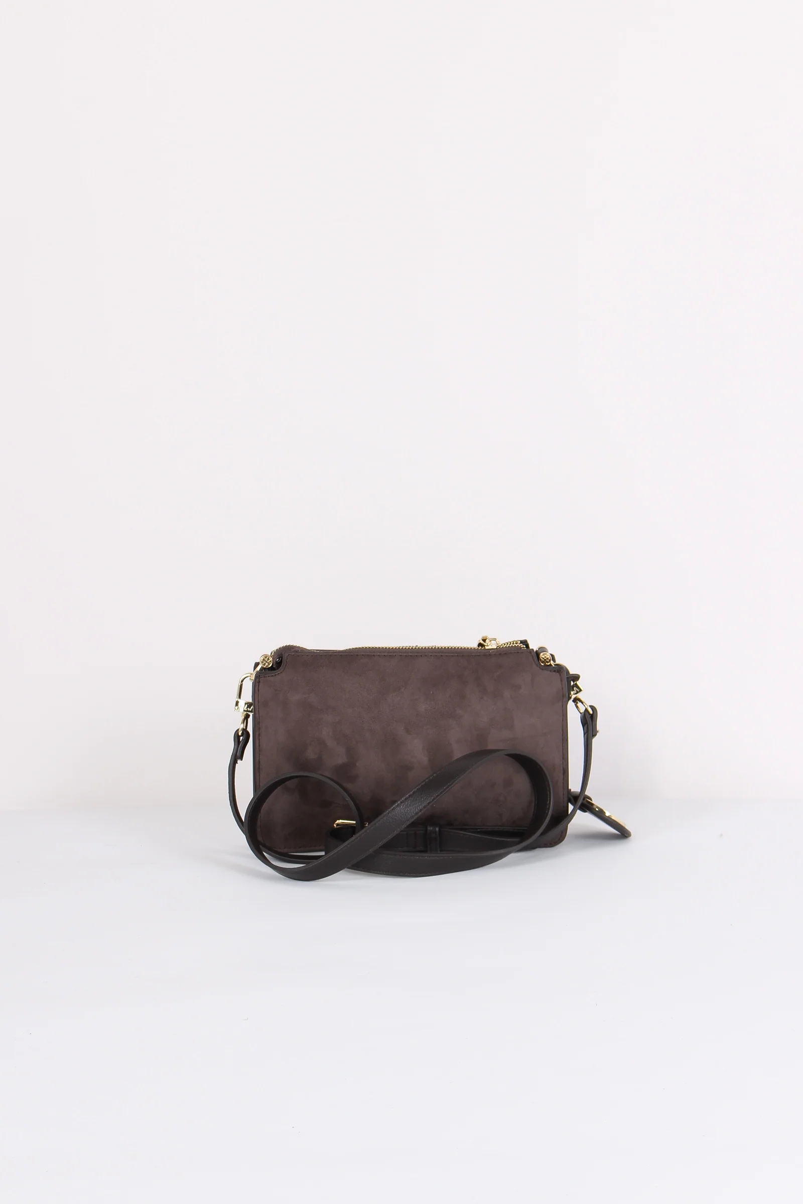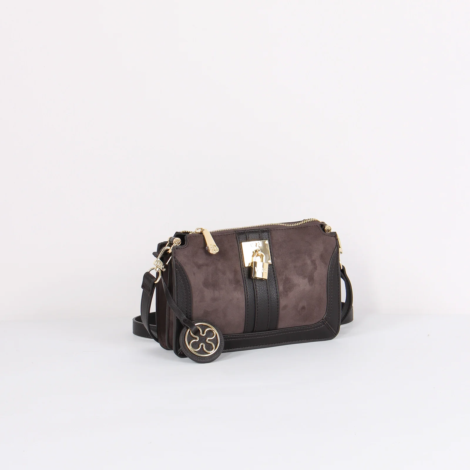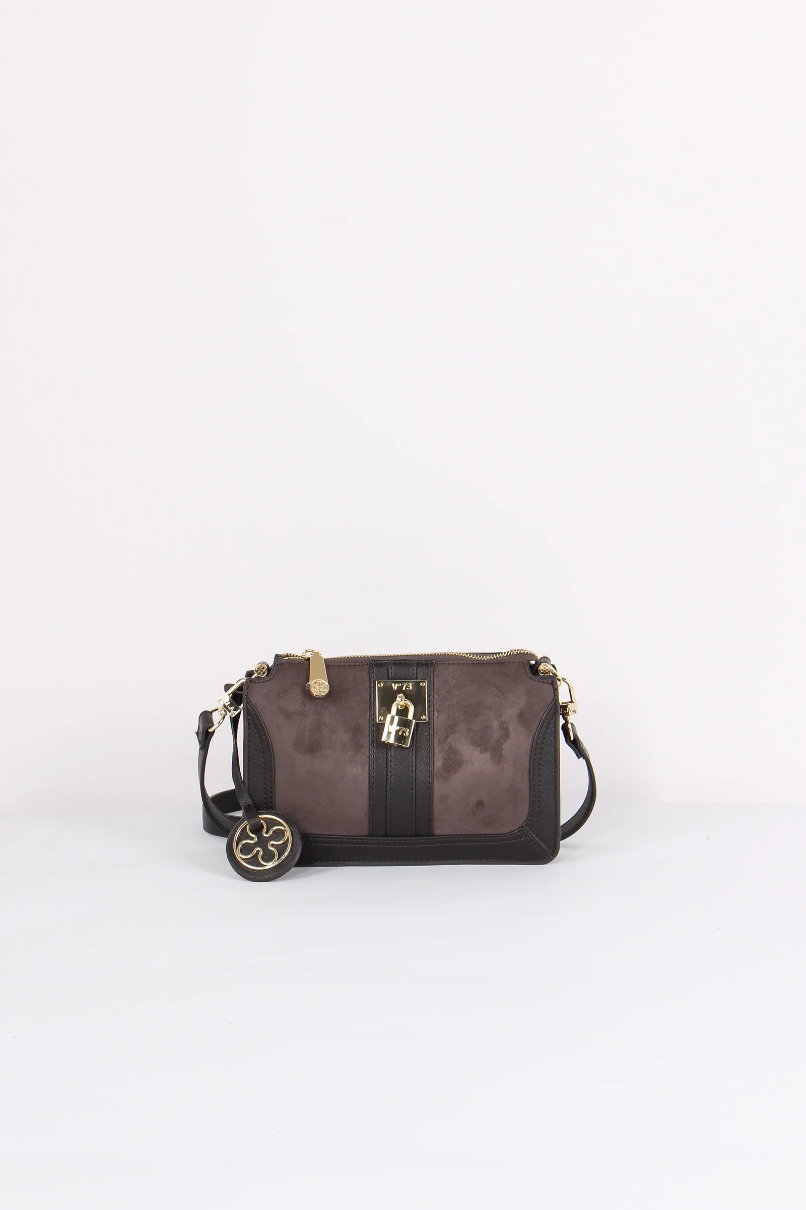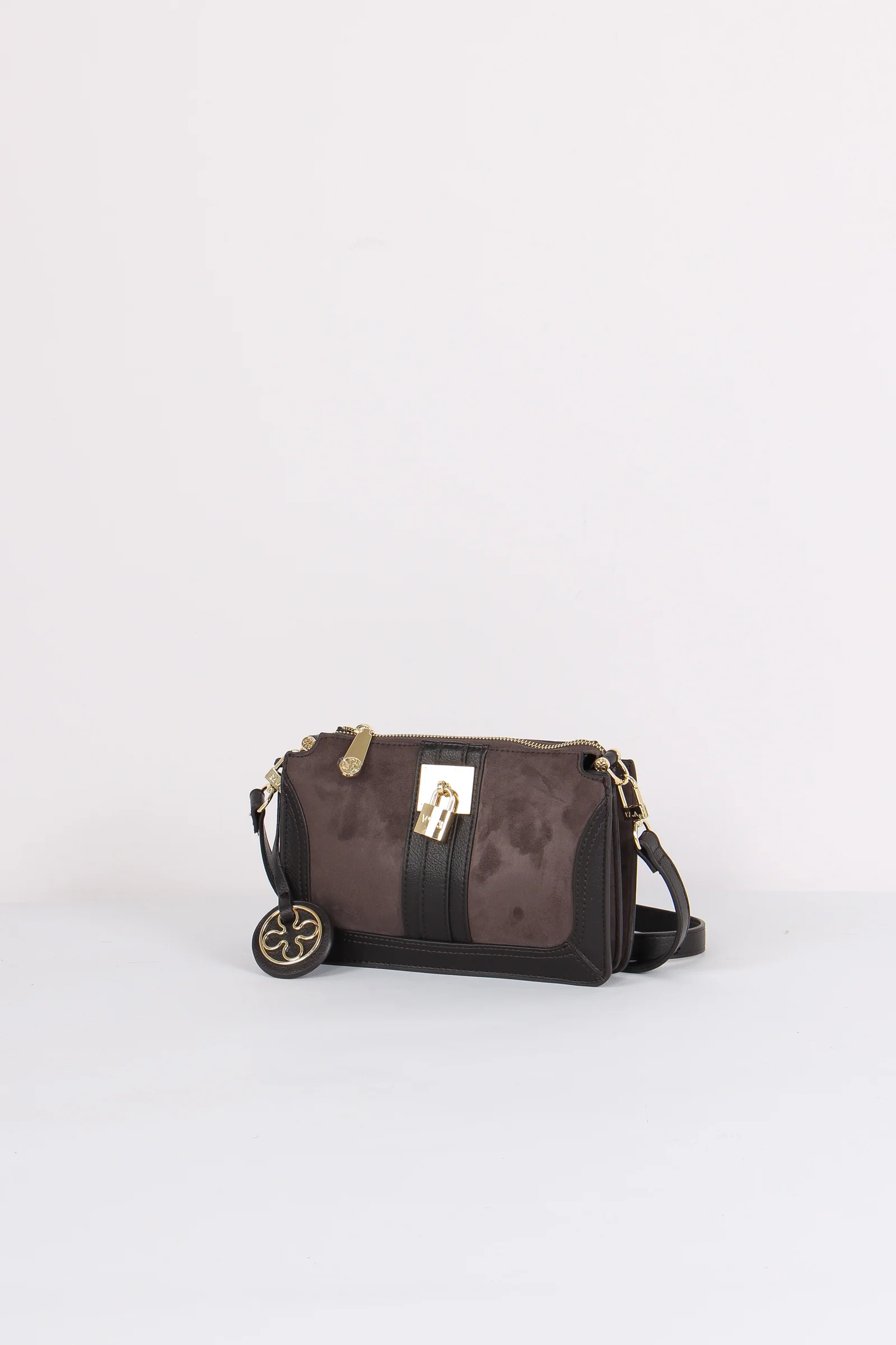 Materiale: 70% poliestere e 30% poliuretano. chiusura: zip tracolla: si dettagli: Borsa a spalla realizzata in materiale effetto camoscio. Lucchetto e scriscia centrale nastro con logo inciso. Charm fiore in metallo che richiama il logo. Tracolla regolabile e removibile. Interno foderato con scom