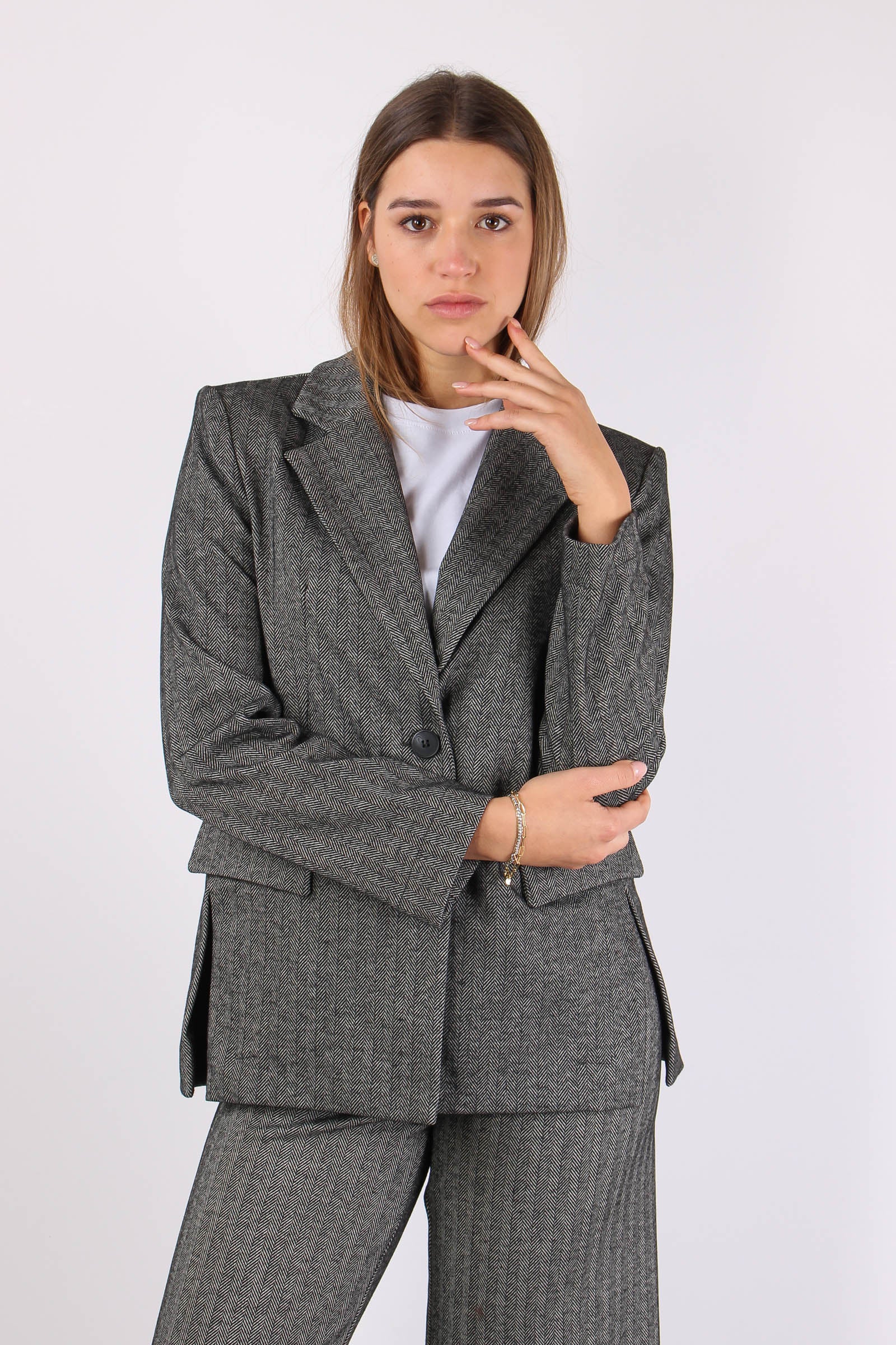 Giacca over con lavorazione resca nei toni del moro/nero chiusura monopetto con rever classico. Sfoderata internamente con spalline imbottite. Ai lati due spacchetti che scivoleranno ai tuoi fianchi. Composizione articolo: 85% poliestere 10% viscosa 5% elastan La modella è alta 1 75 e indossa