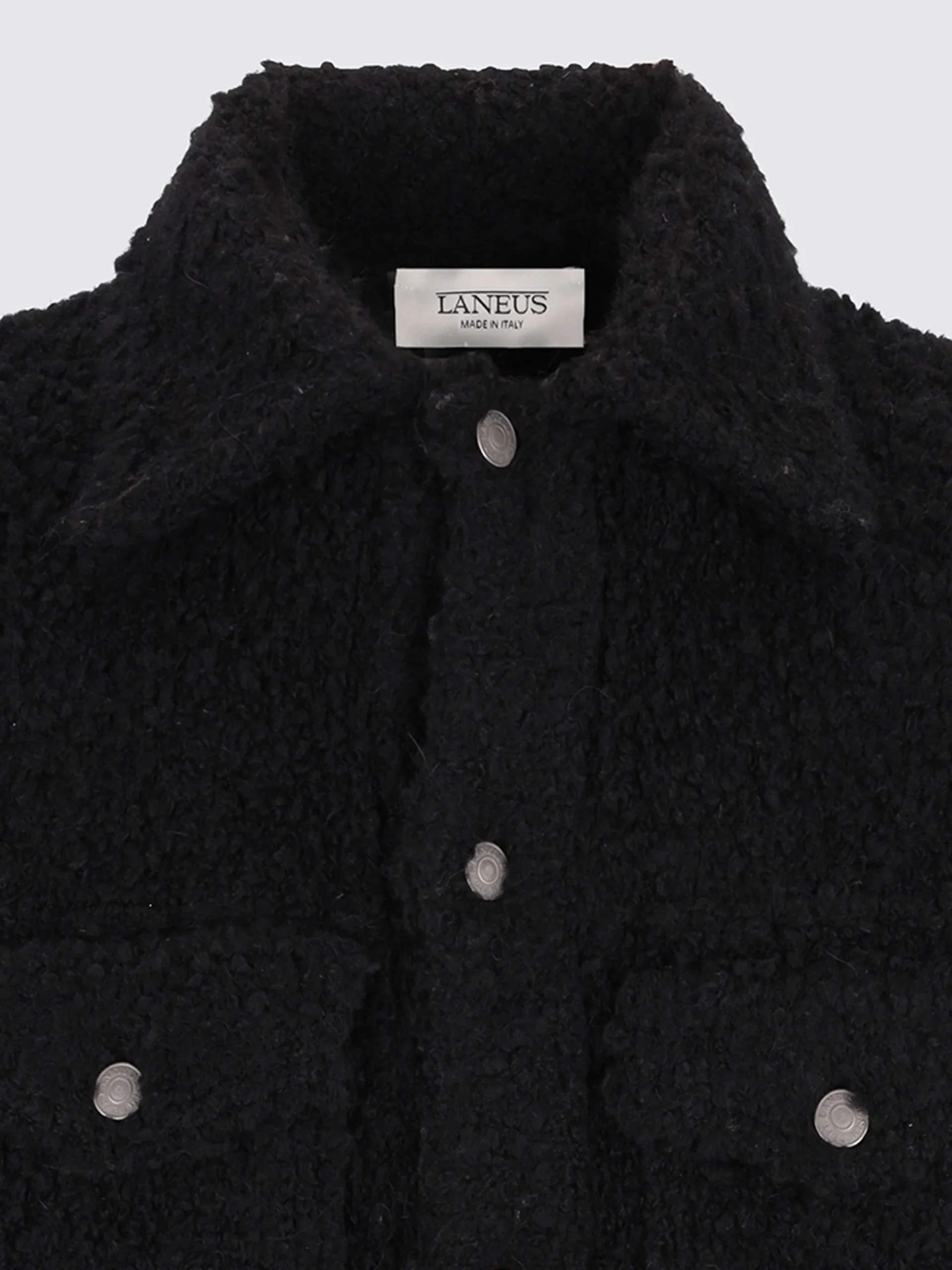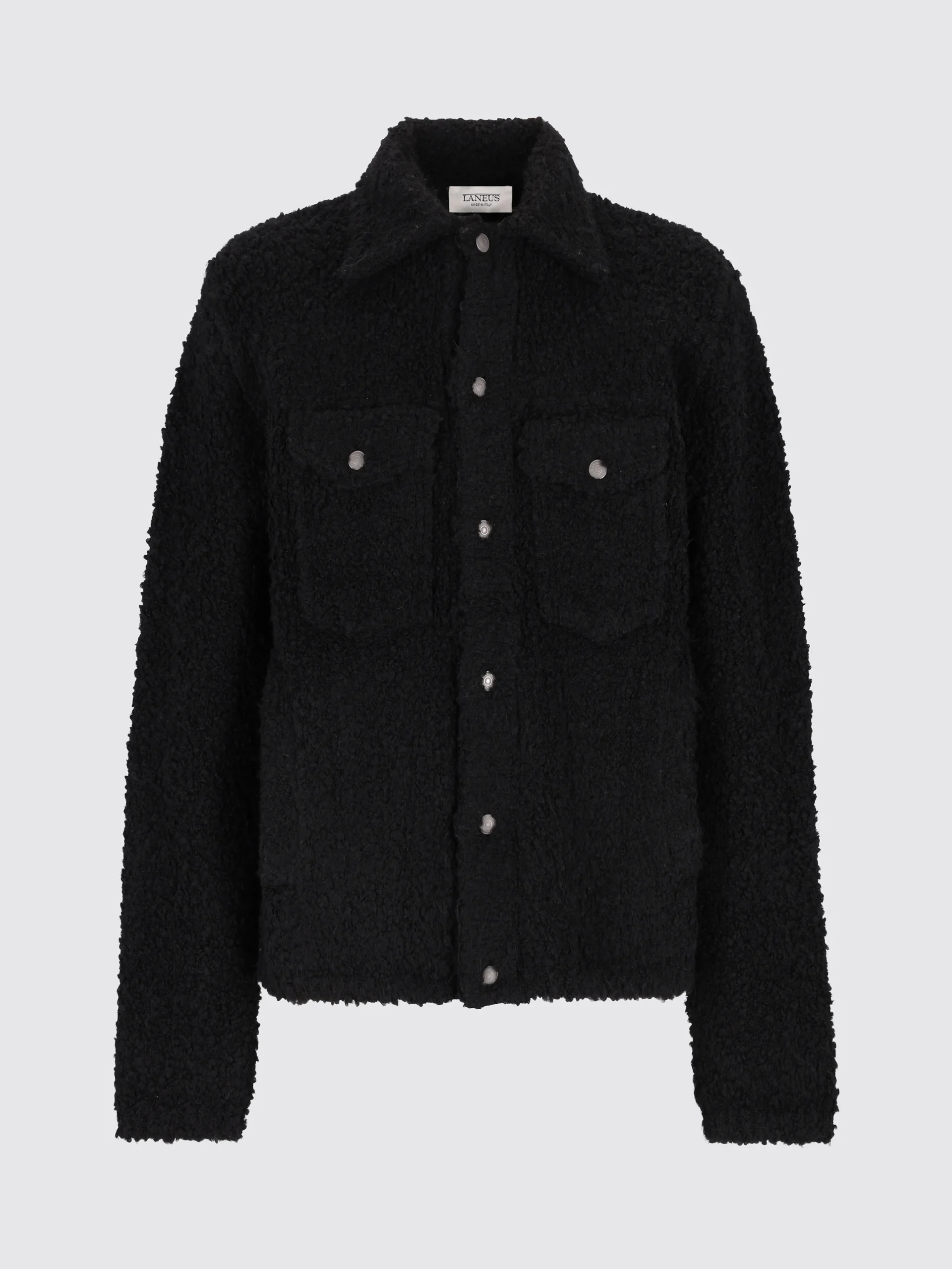Volumi over e texture materica per questa giacca trucker firmata Laneus. Realizzata in maglia lavorata con filo bouclé, presenta una chiusura con bottoni metallici stile chiodo, tasche a filetto sui fianchi e due tasche con pattina e bottone sul petto. Un capo dall’attitude urban, che reinterpreta il classico trucker con un twist soft e contemporaneo. Made in Italy.