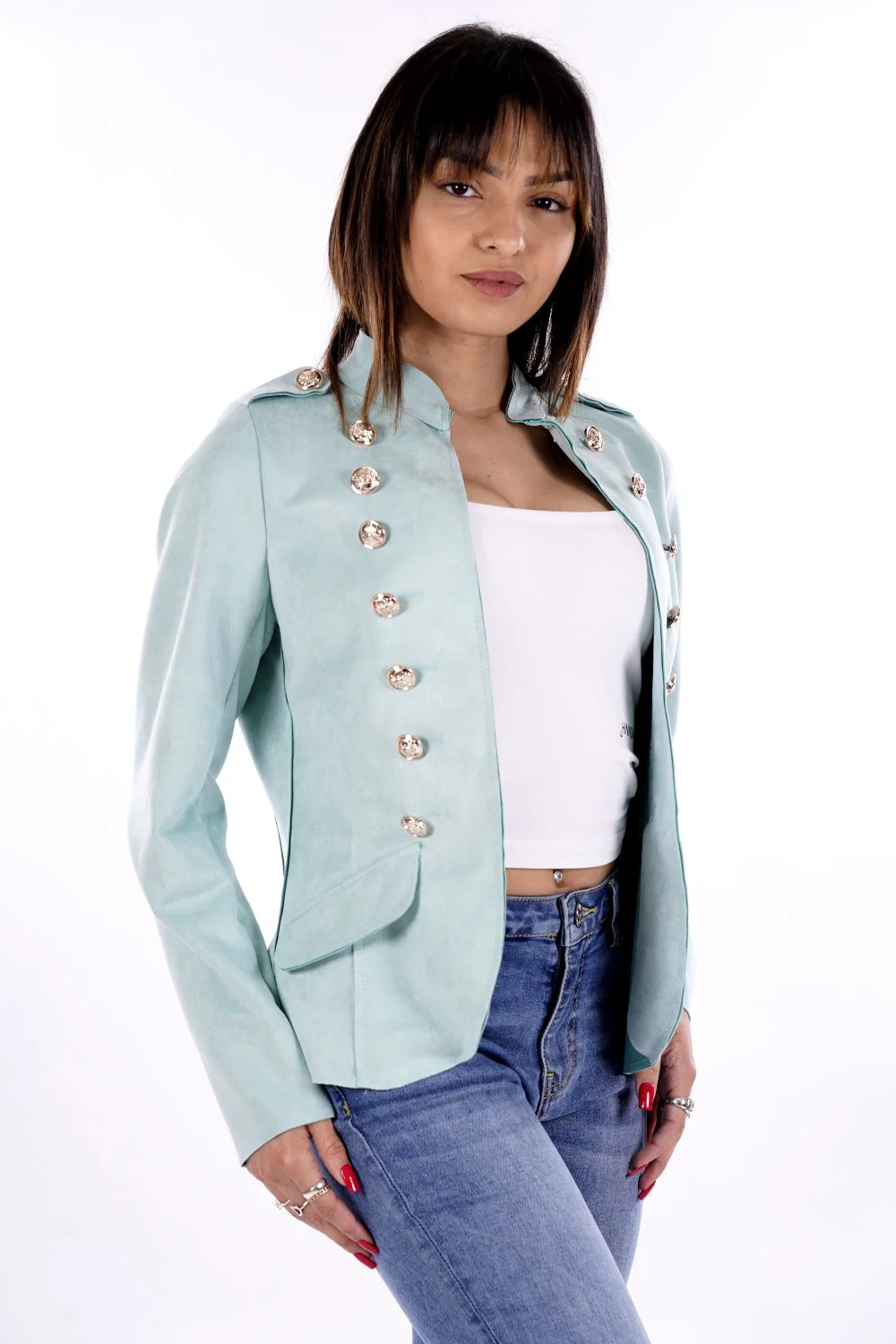 MOLLY BRACKEN Giacca da donna in rennino sintetico color tiffany da donna , modello army aperta sul davanti .