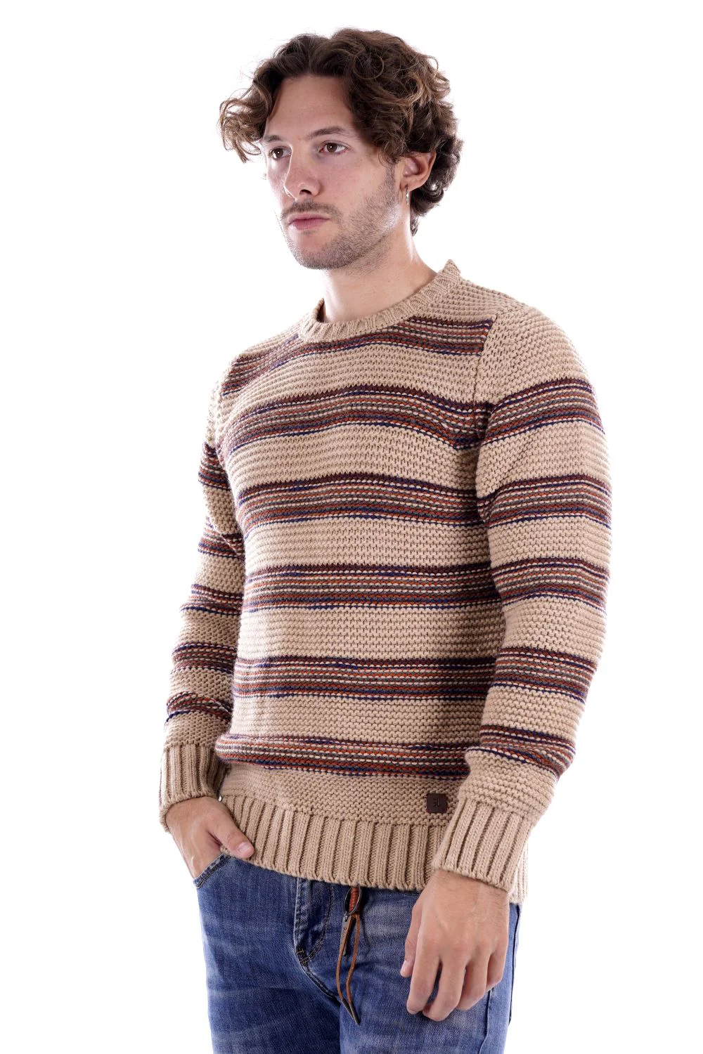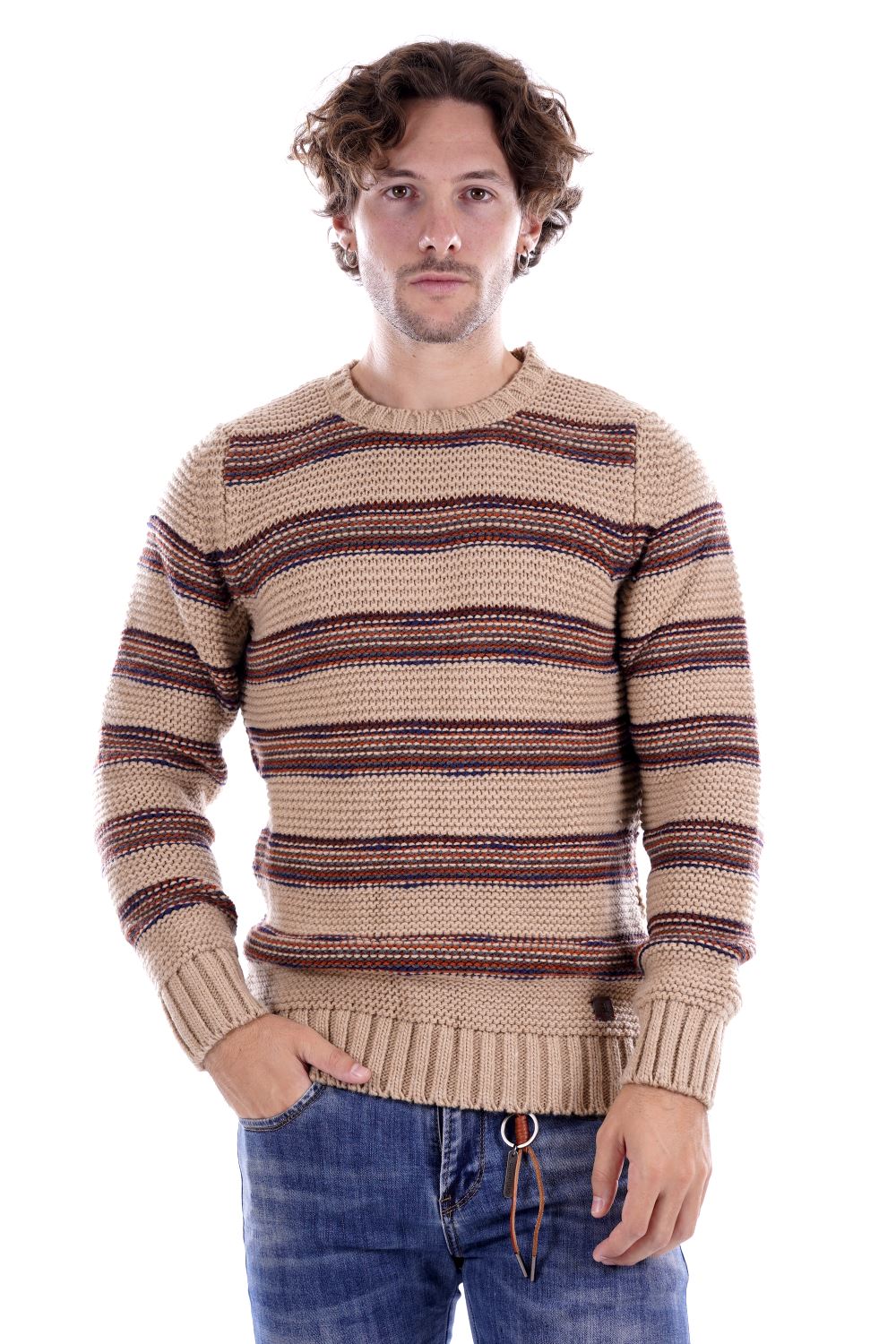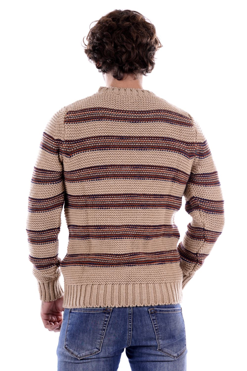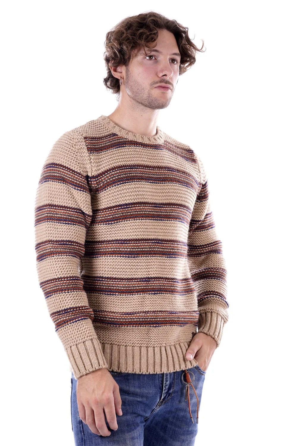 GIANNI LUPO Maglione pesante , in misto lana , da uomo , a righe beige e nocciola , girocollo