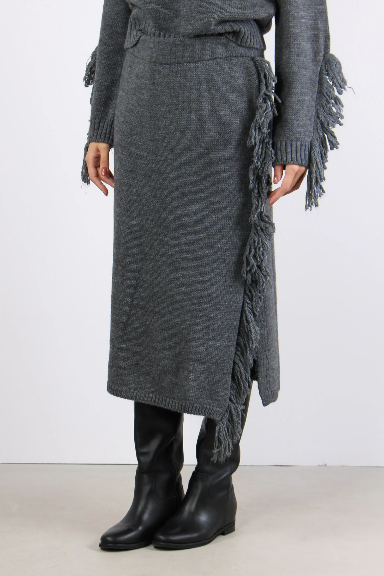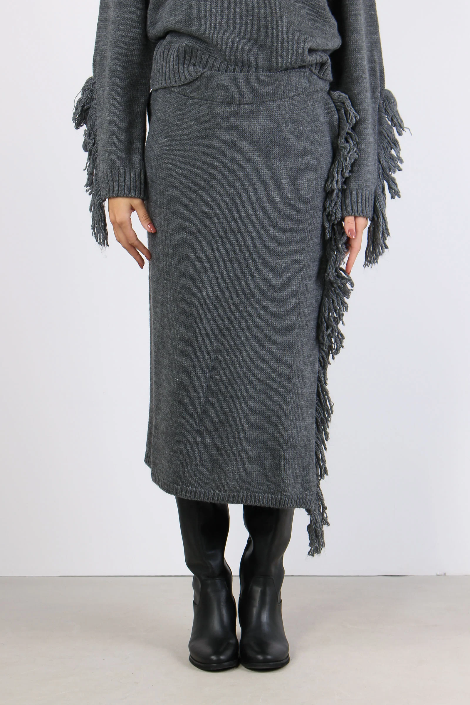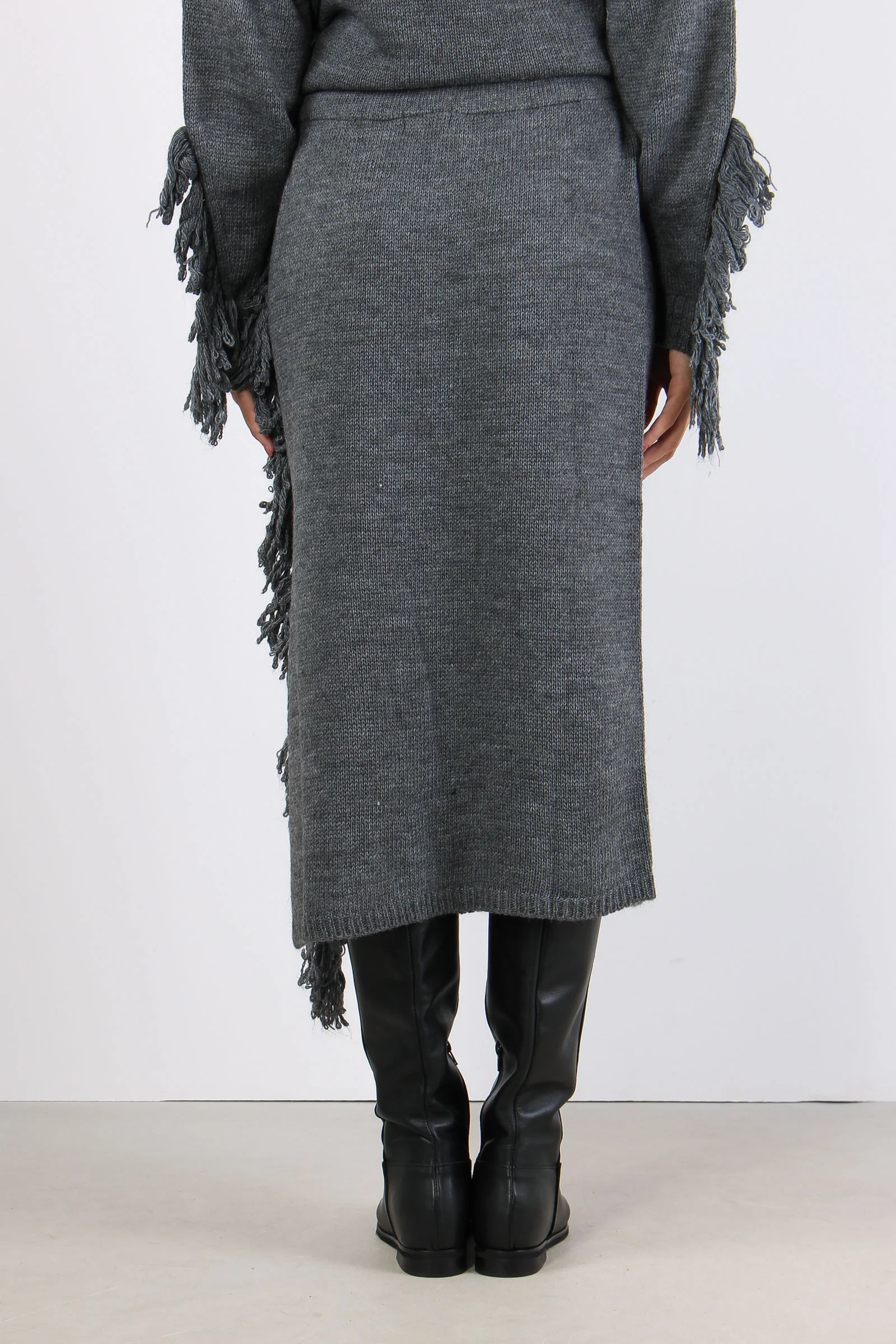 Gonna in maglia con fascia elastica in vita. Frange a lato con spacco. Composizione articolo: 75% acrilico 10% lana 10% viscosa 5% alpaca La modella è alta 1 75 e indossa una tg. S.