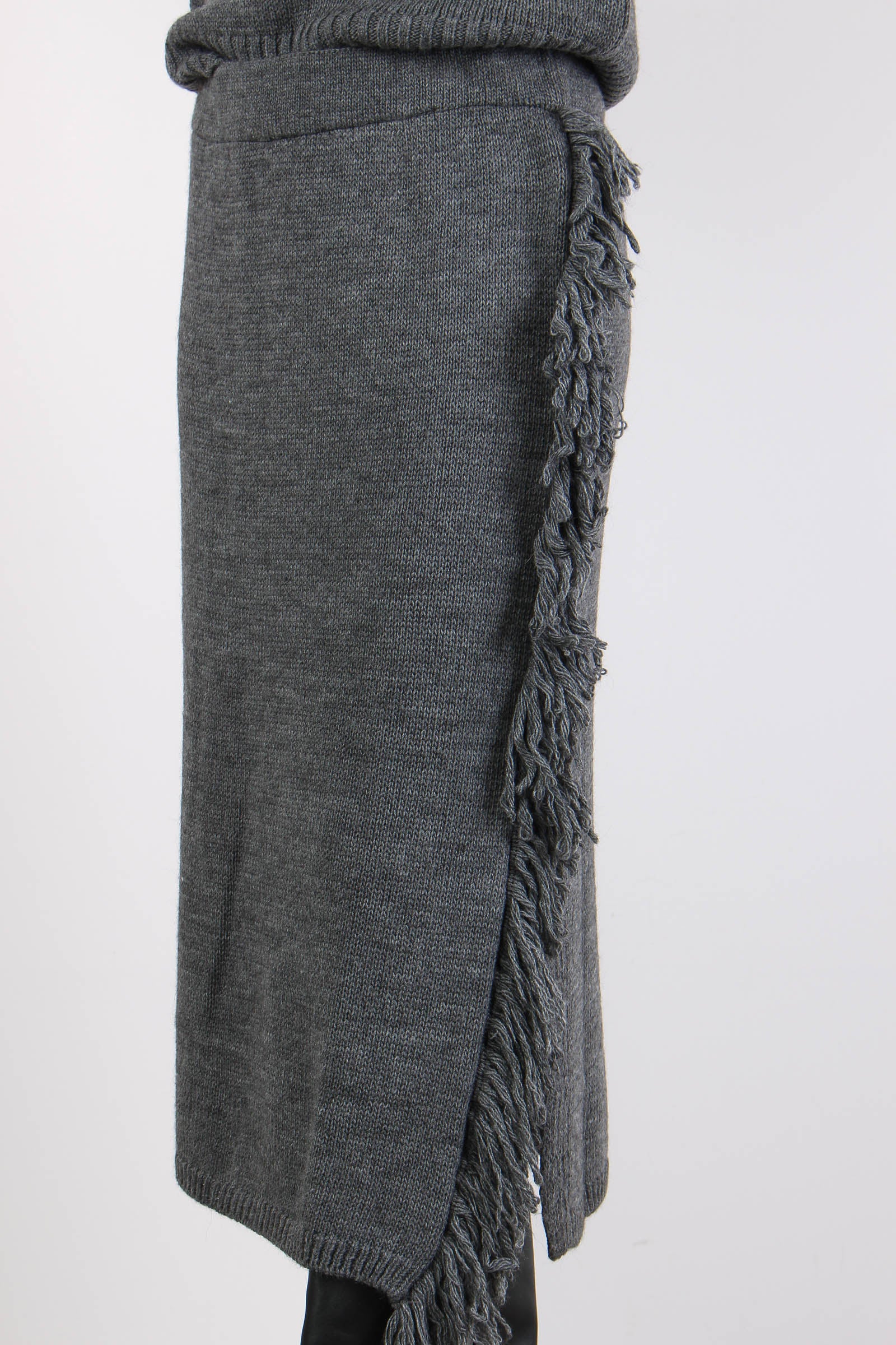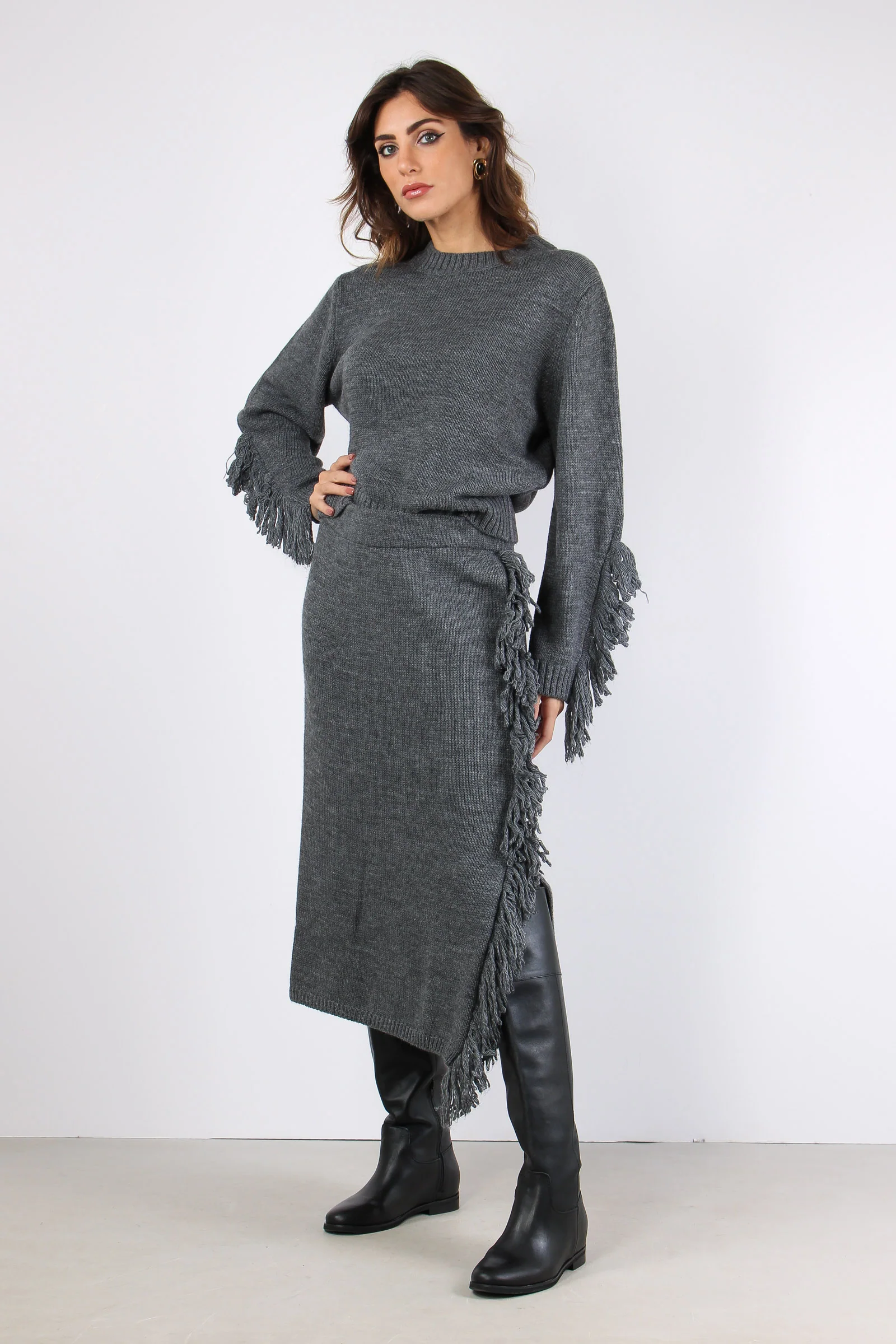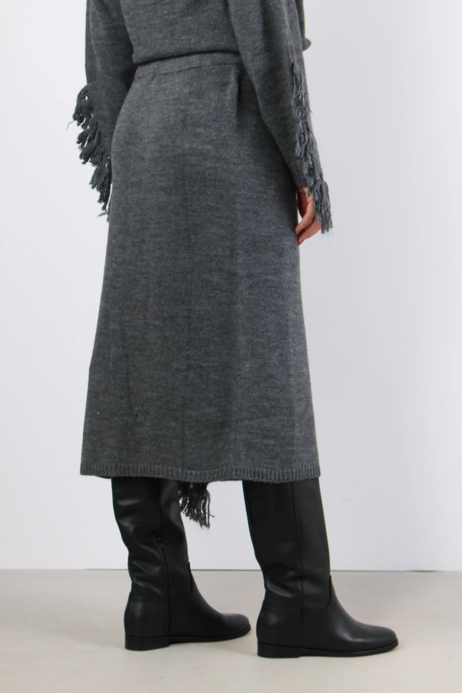 Gonna in maglia con fascia elastica in vita. Frange a lato con spacco. Composizione articolo: 75% acrilico 10% lana 10% viscosa 5% alpaca La modella è alta 1 75 e indossa una tg. S.