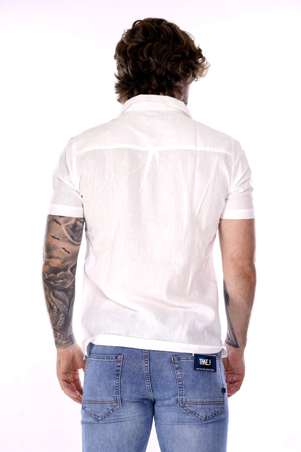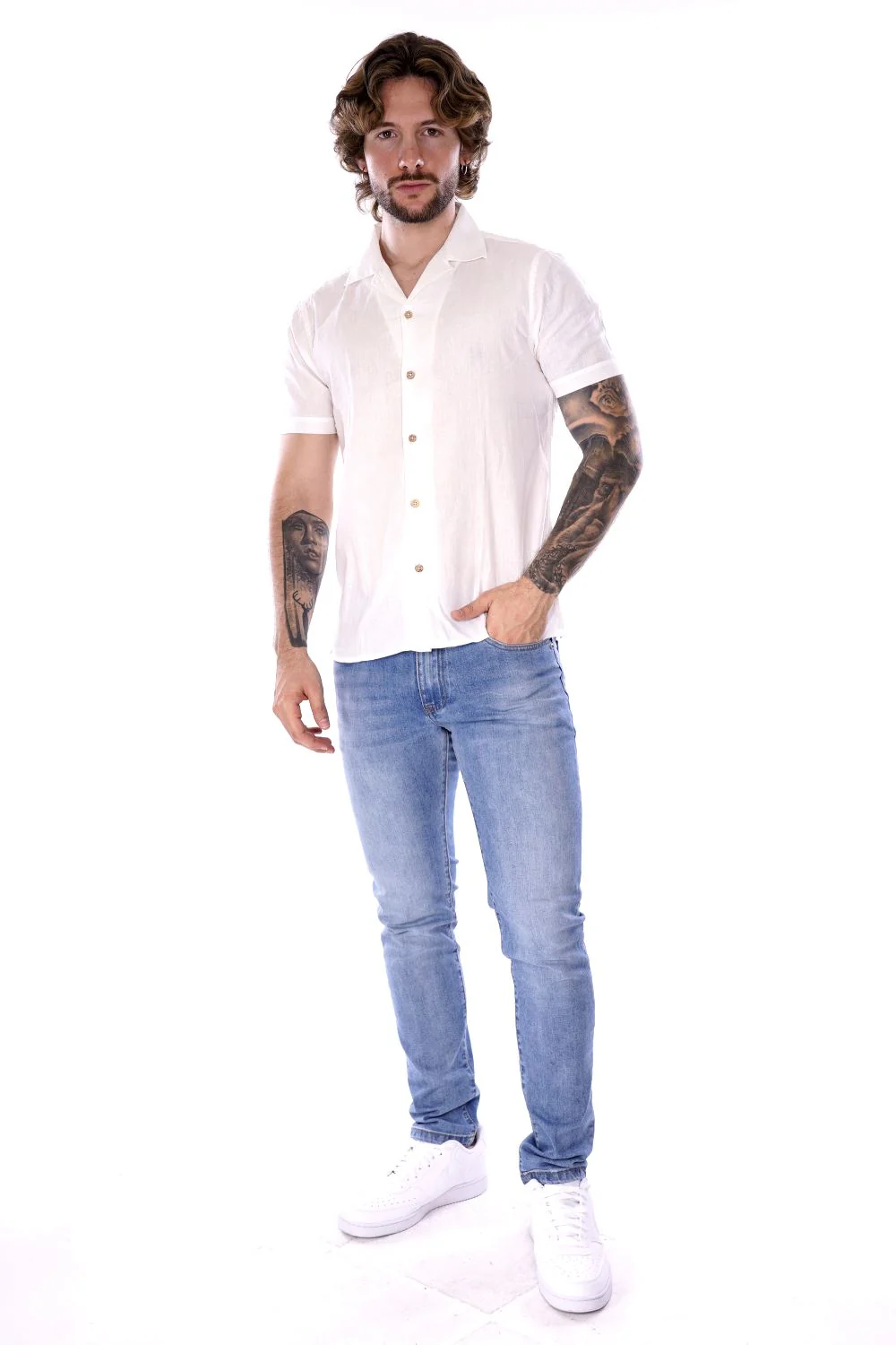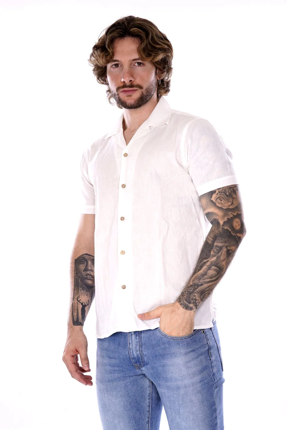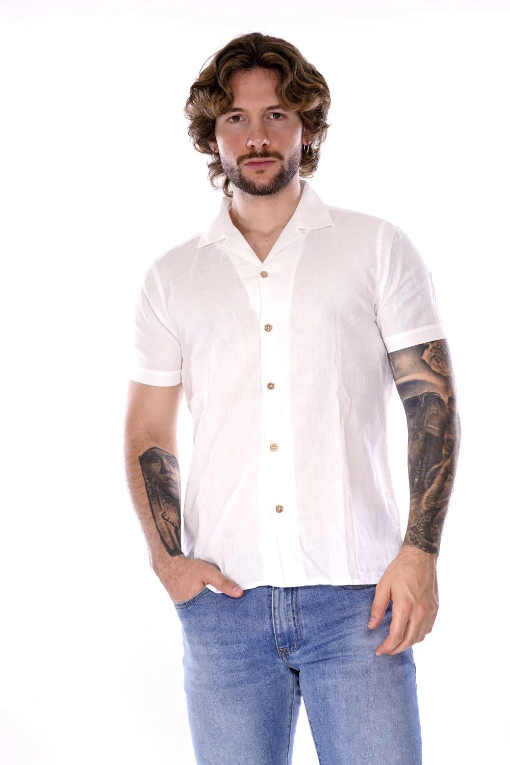 HAMAKI HO camicia a maniche corte bianca da uomo in misto lino/cotone . Modello con colletto classico a chiusura con bottoni