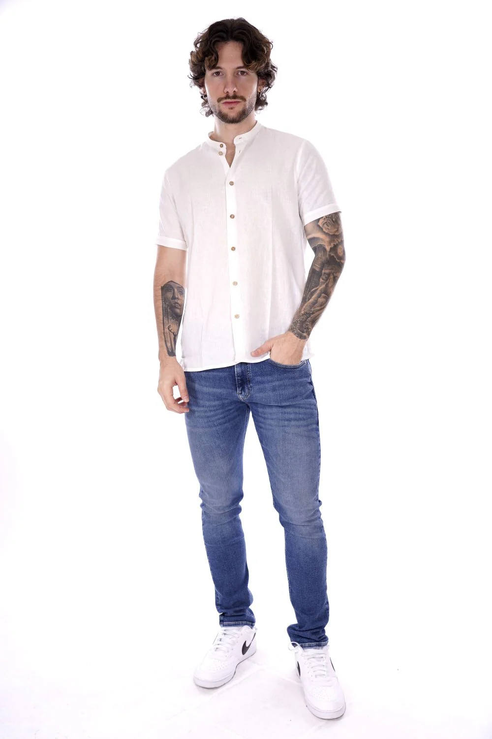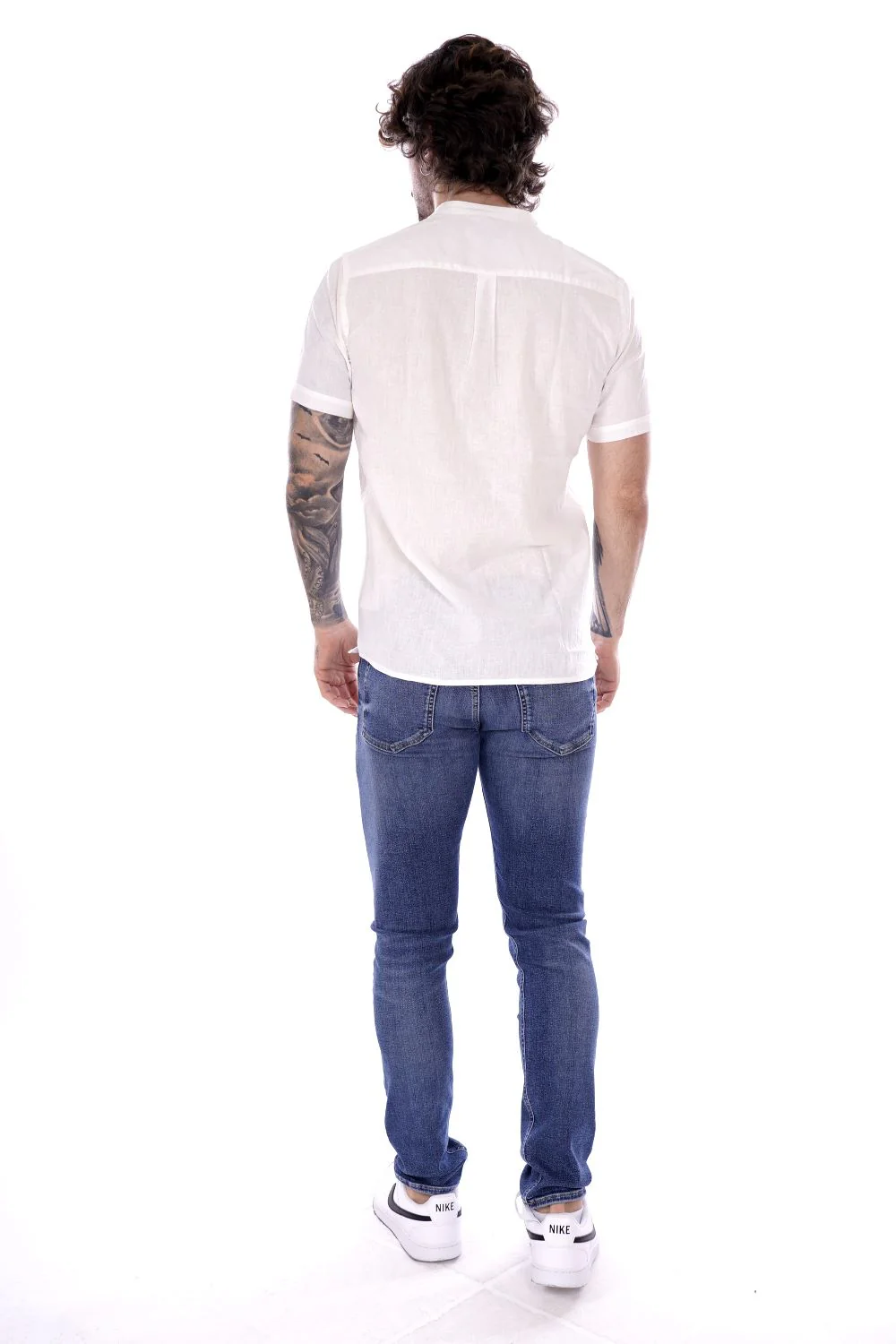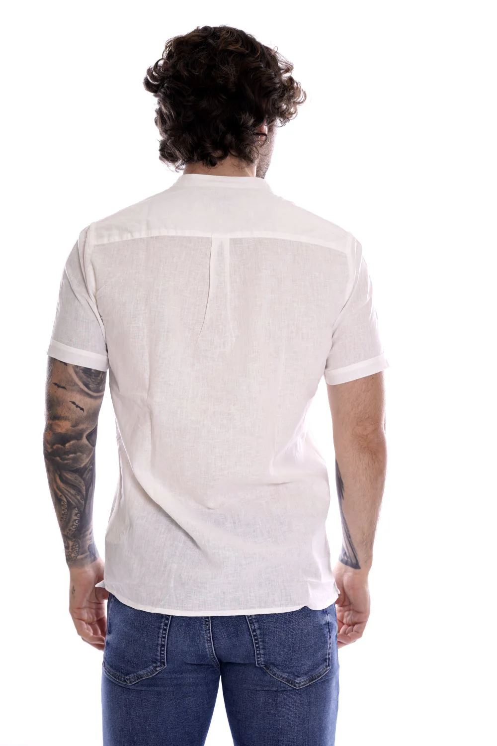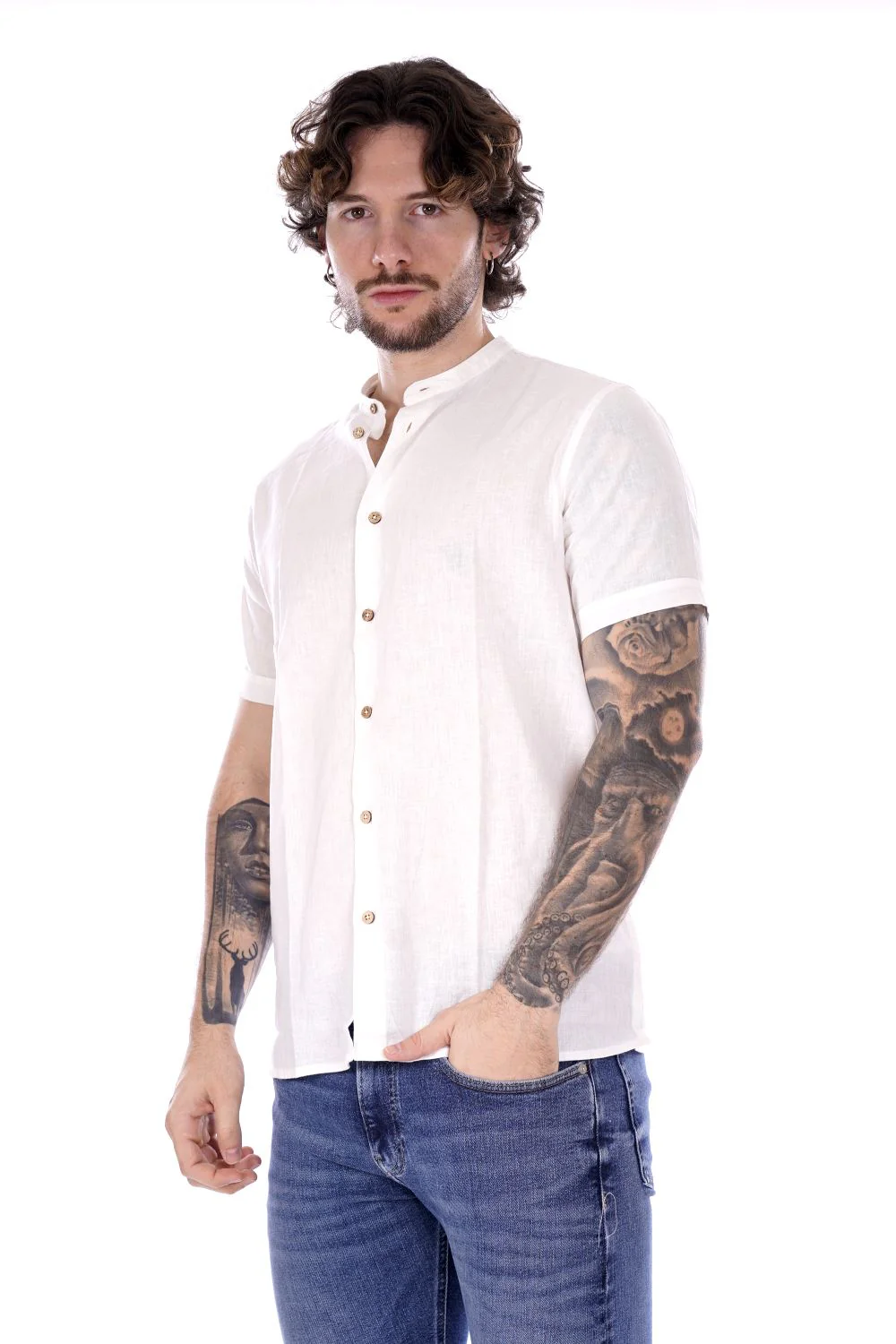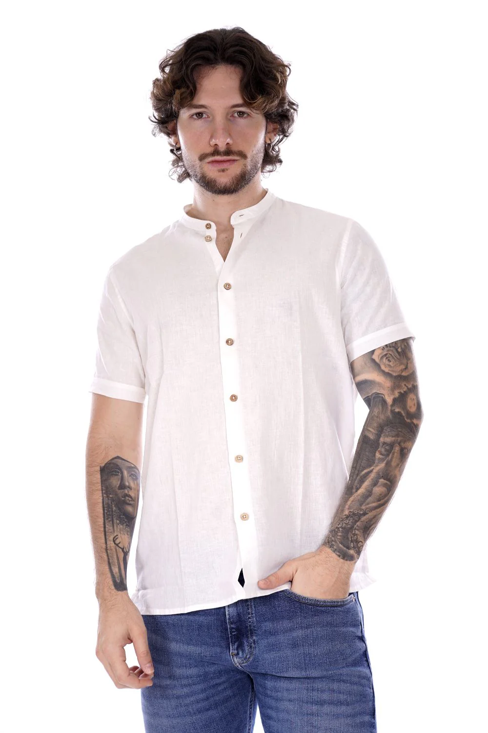 HAMAKI HO camicia a maniche corte bianca da uomo in misto lino/cotone . Modello con colletto alla coreana a chiusura con bottoni