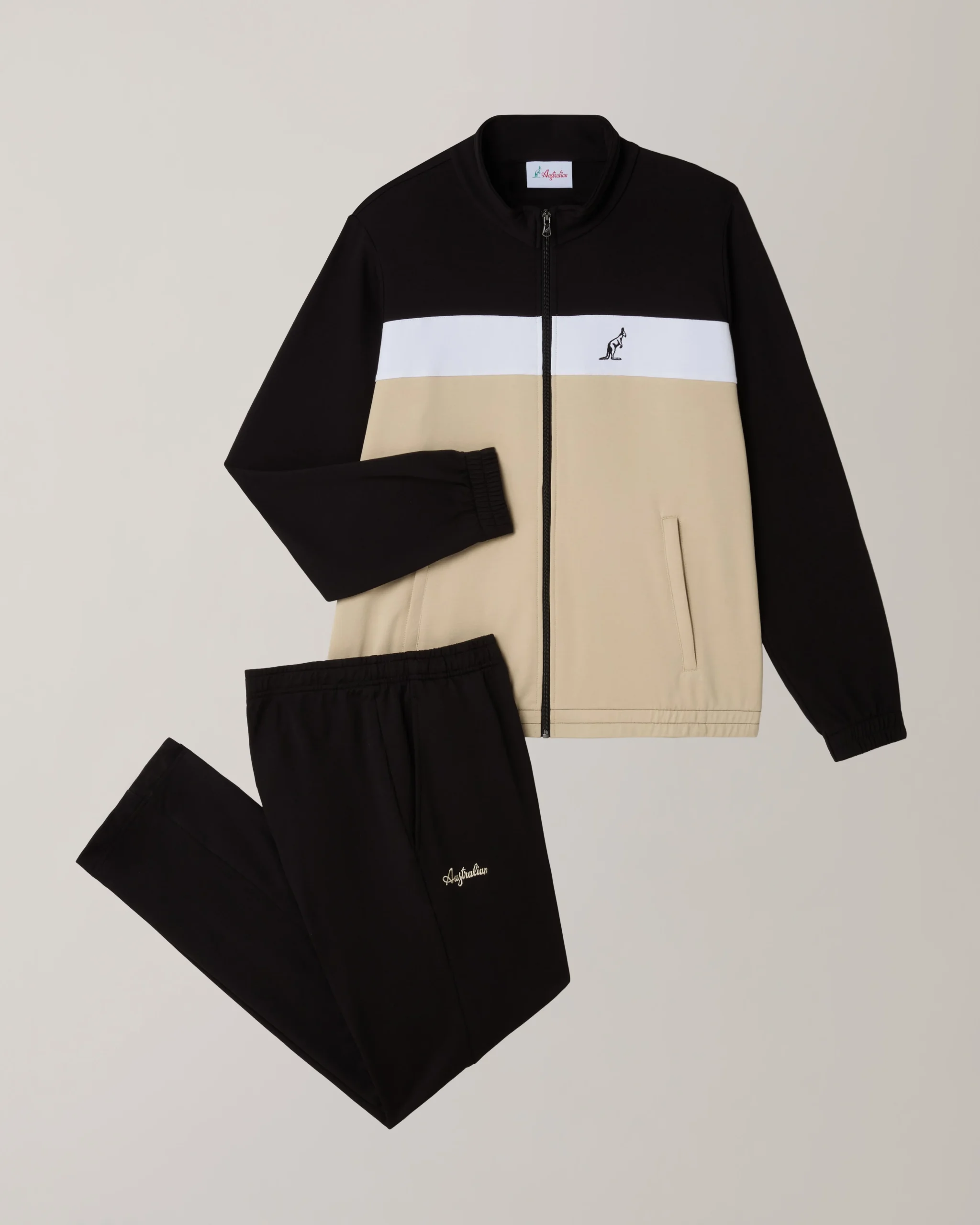 Tuta in felpa elasticizzata Giacca:– Inserto in contrasto sul davanti– Full zip frontale in contrasto– Tasche laterali con zip– Bordo e polsi elasticizzati– Logo ricamatoPantalone:– Elastico in vita con coulisse regolabile– Fondo dritto– Logo ricamatoMade in Italy