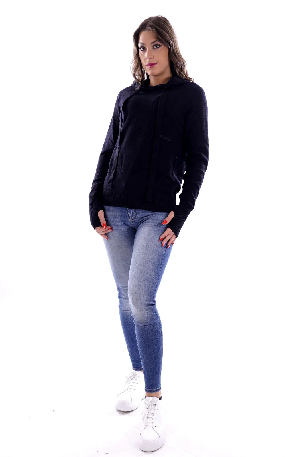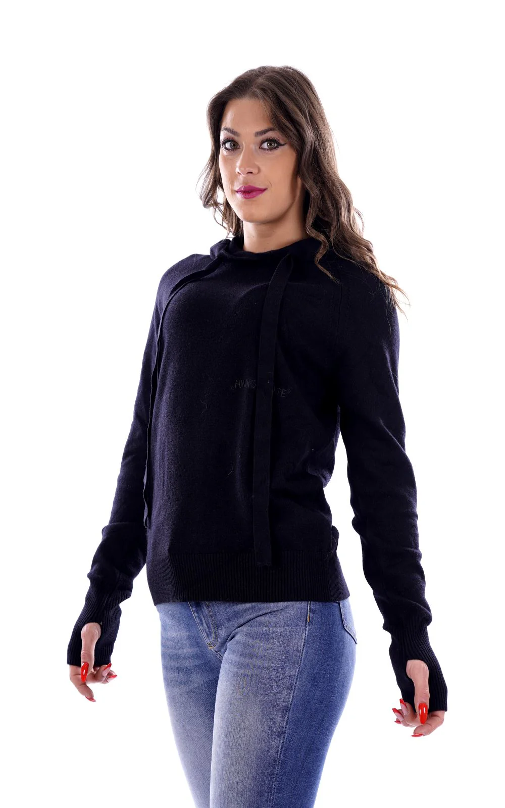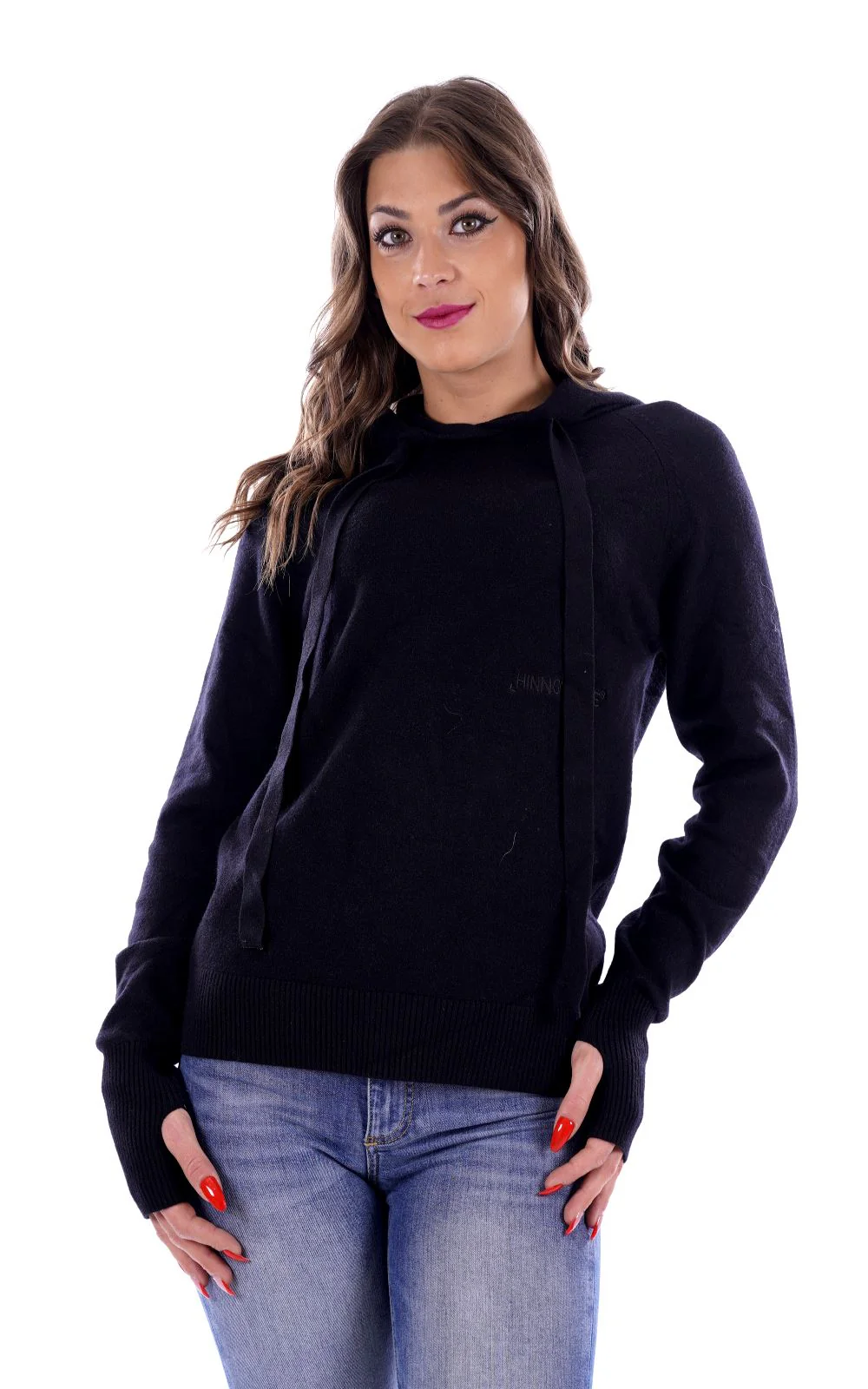 HINNOMINATE Felpa nera in lanetta per donna , con cappuccio . La presenza di viscosa rende il capo particolarmente morbido al tatto . Made in Italy
