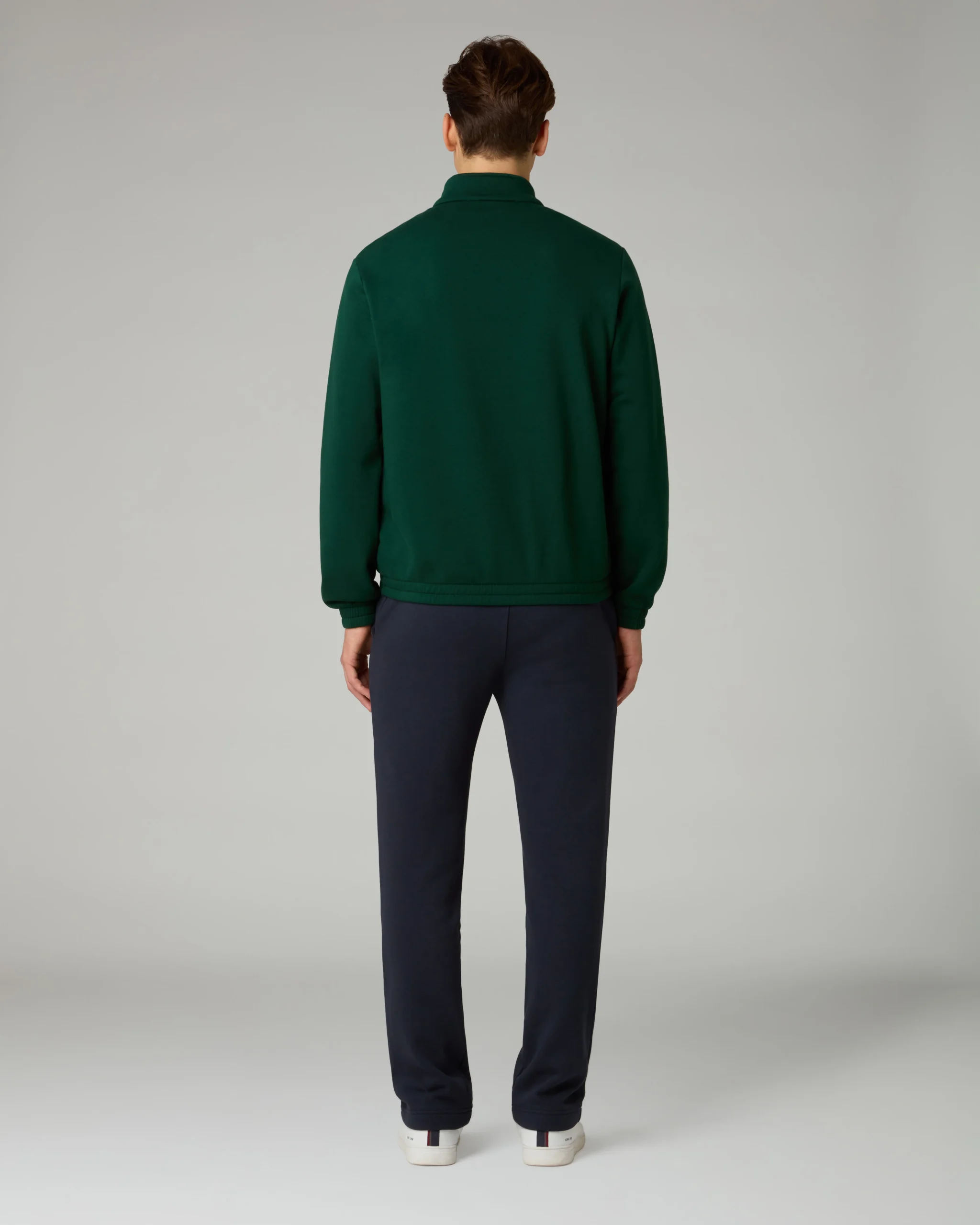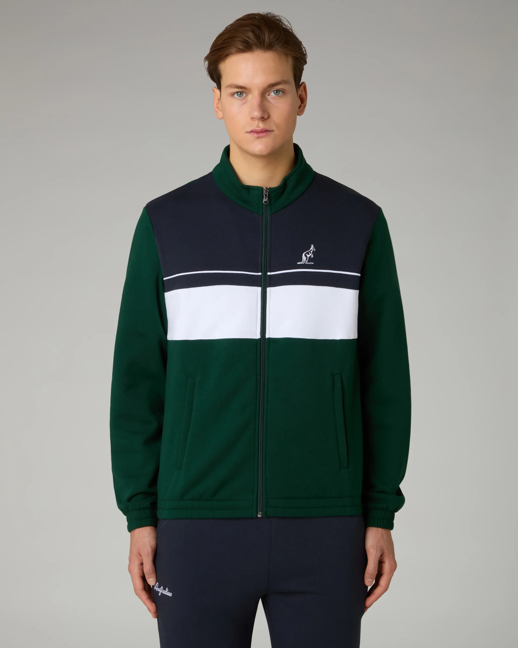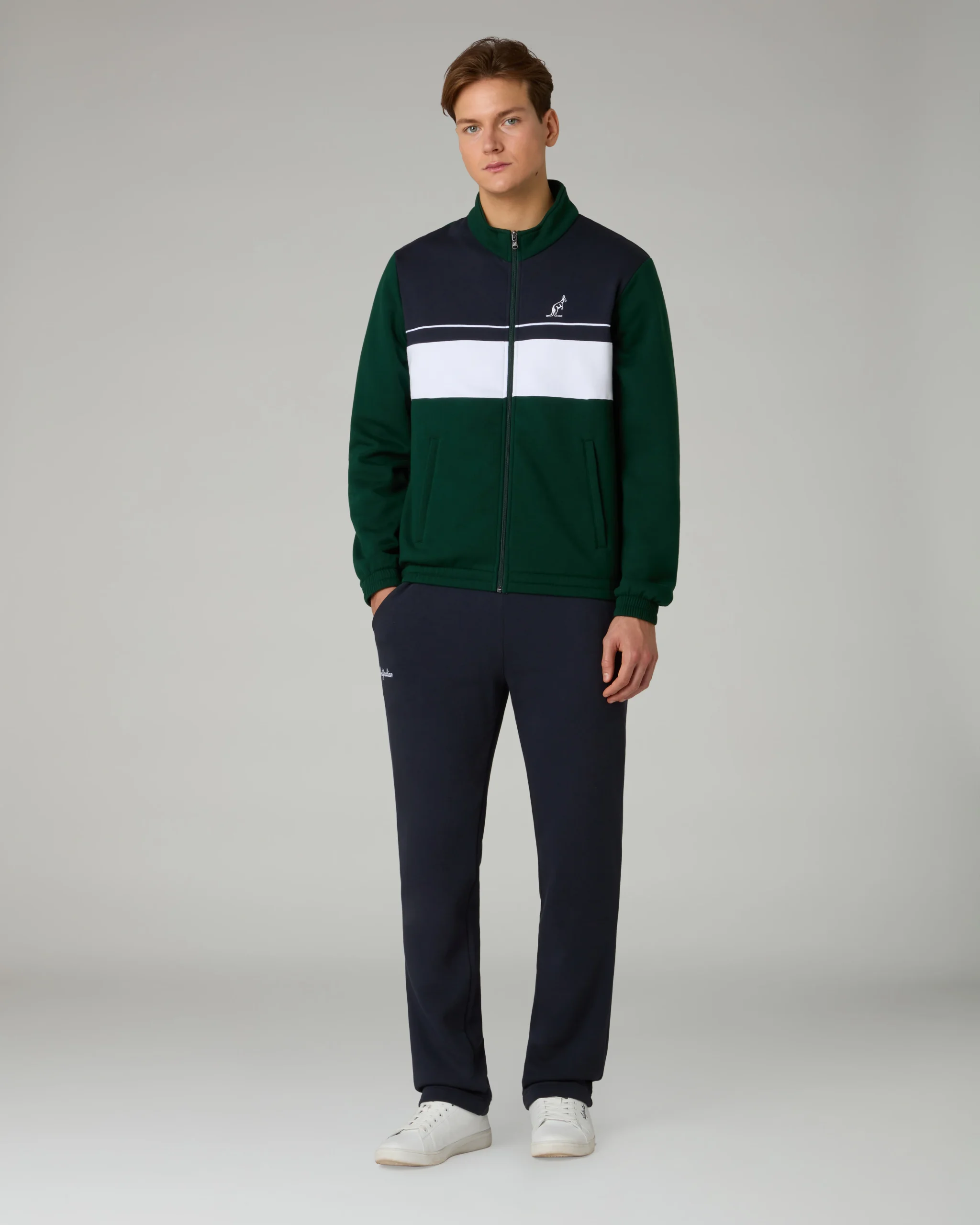 Tuta in felpa invernaleGiacca:– Inserti in constrasto sul davanti– Piping in contrasto– Full zip frontale– Tasche con zip– Bordo e polsi elasticizzatiPantalone:– Elastico in vita con coulisse regolabile– Fondo dritto– Logo ricamatoMade in Italy