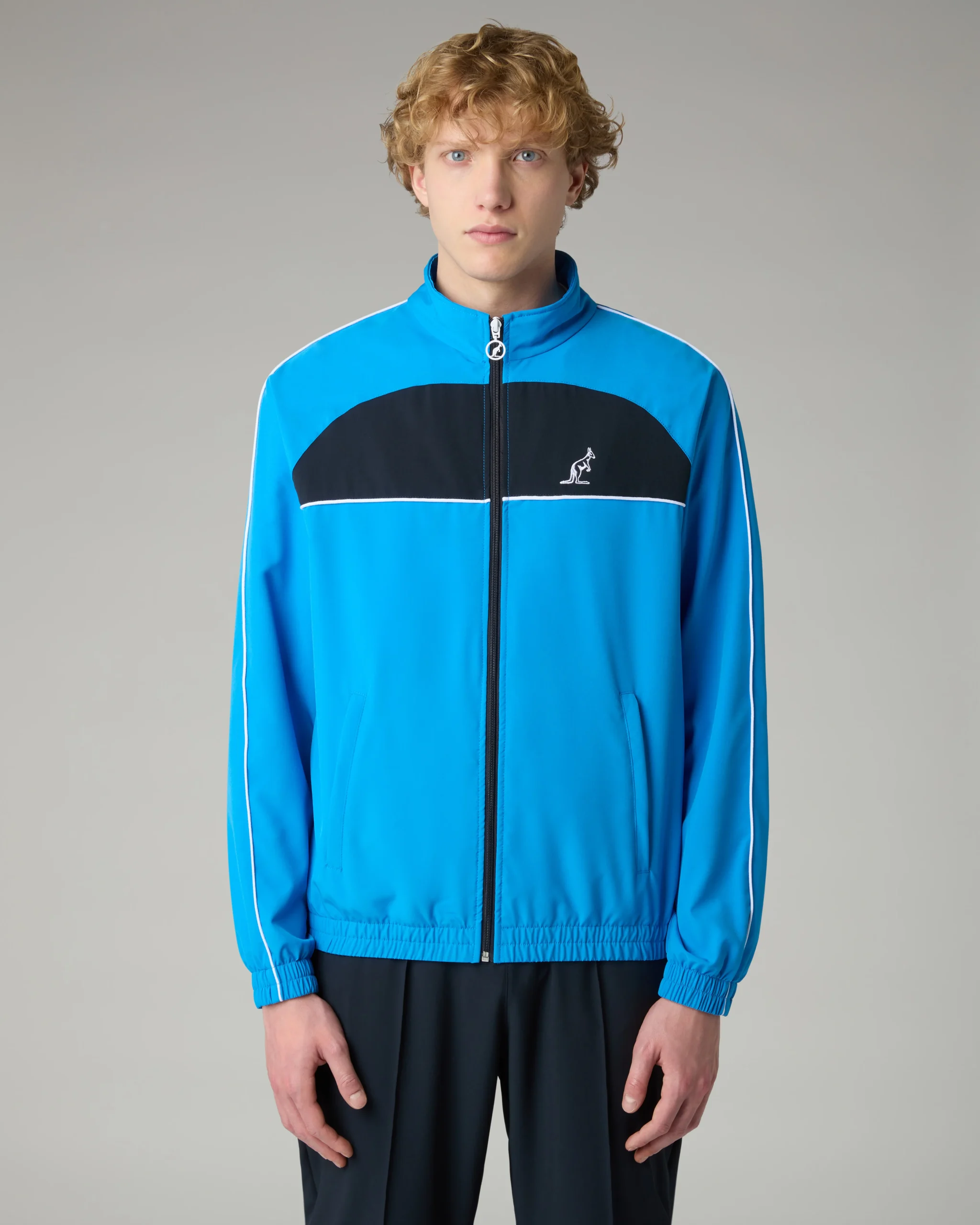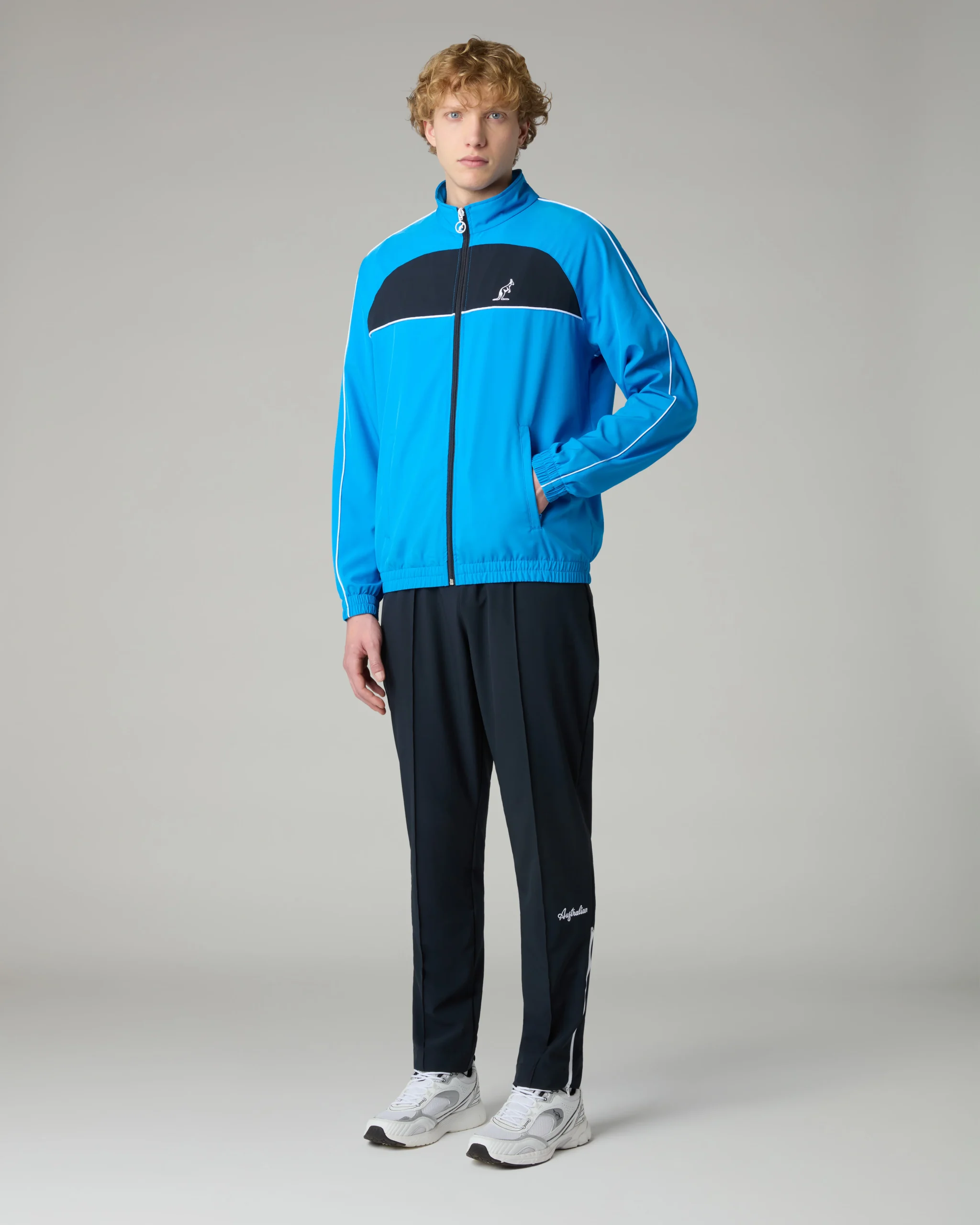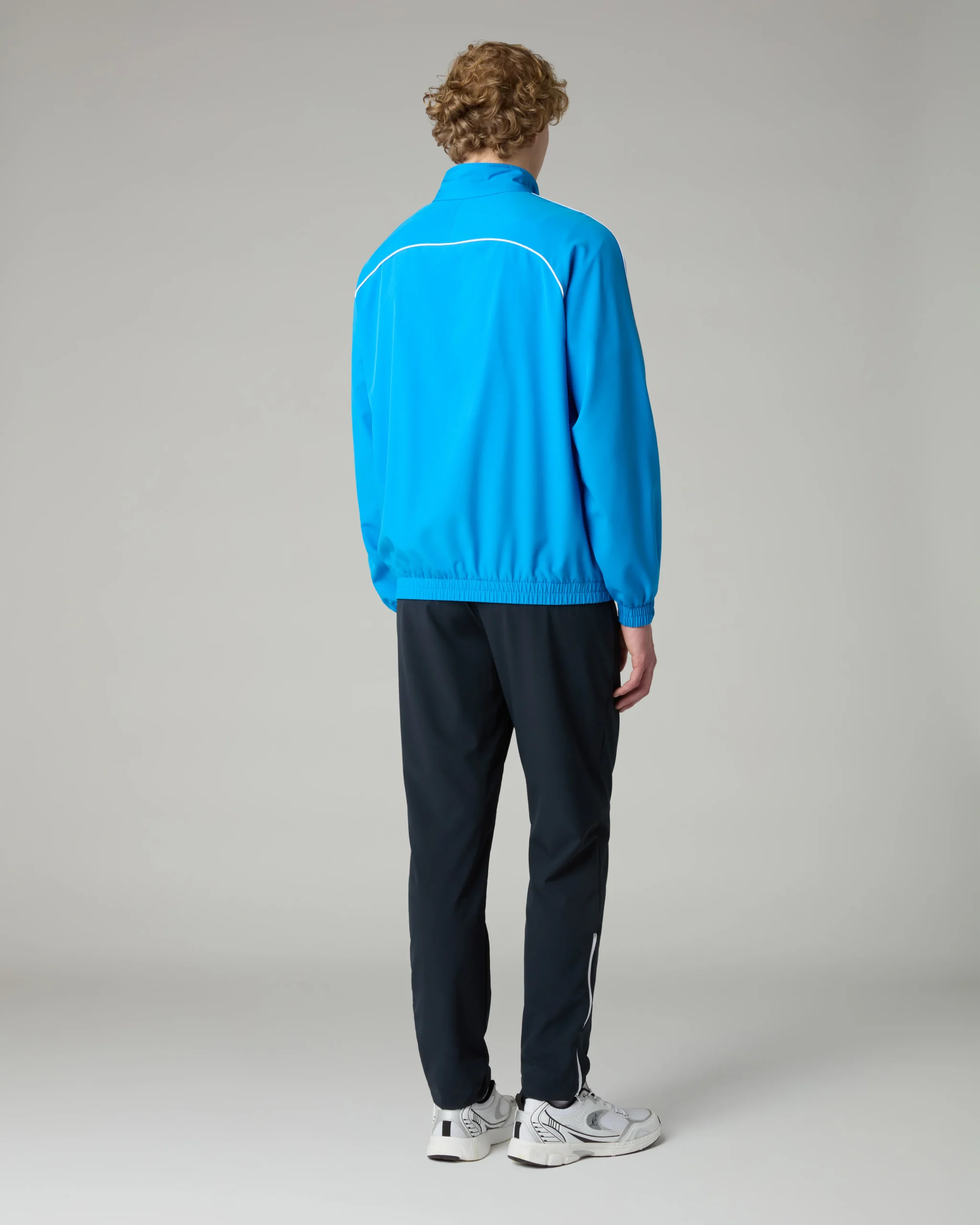 Tuta in tessuto “smash” sfoderataGiacca:– Inserti in contrasto– Piping in contrasto– Full zip frontale con tiretto personalizzato– Tasche con zip– Bordo e polsi elasticizzati– Logo ricamatoPantalone:– Elastico in vita con coulisse regolabile– Nervatura sul davanti– Fondo dritto con zip– Logo ricamatoMade in Italy