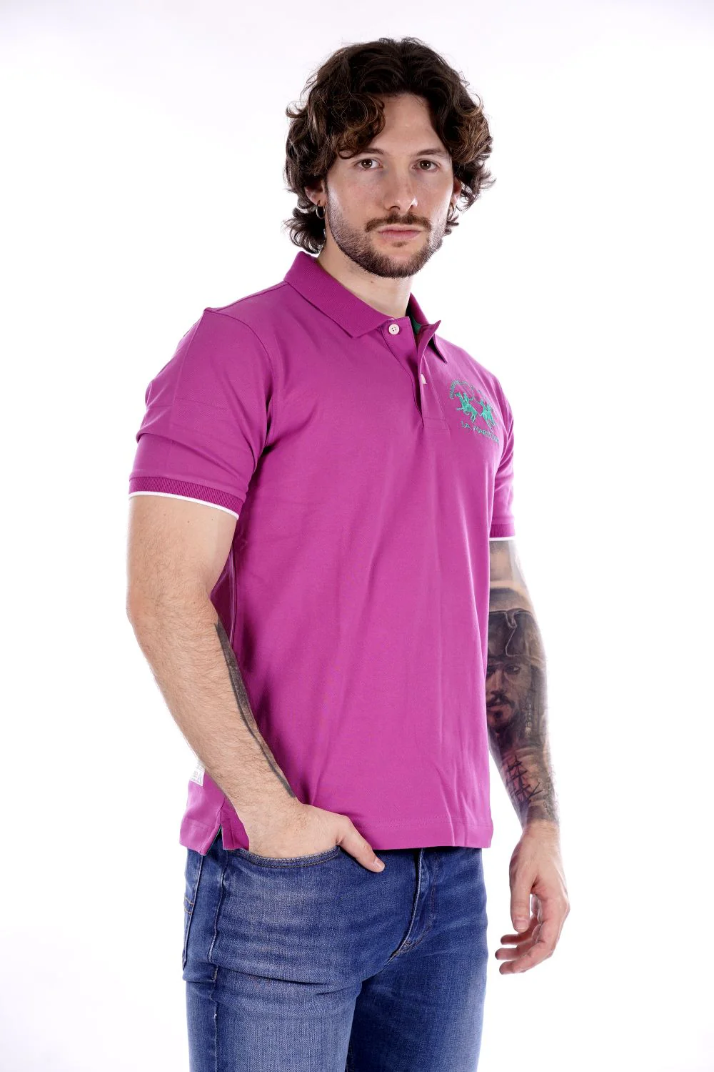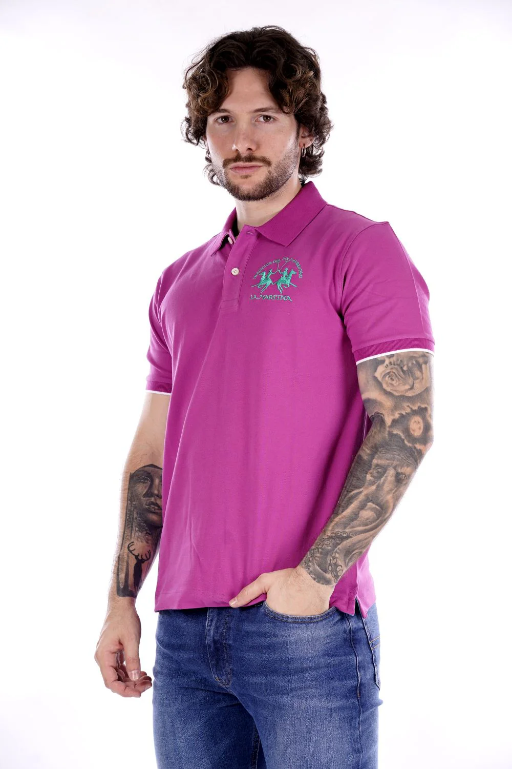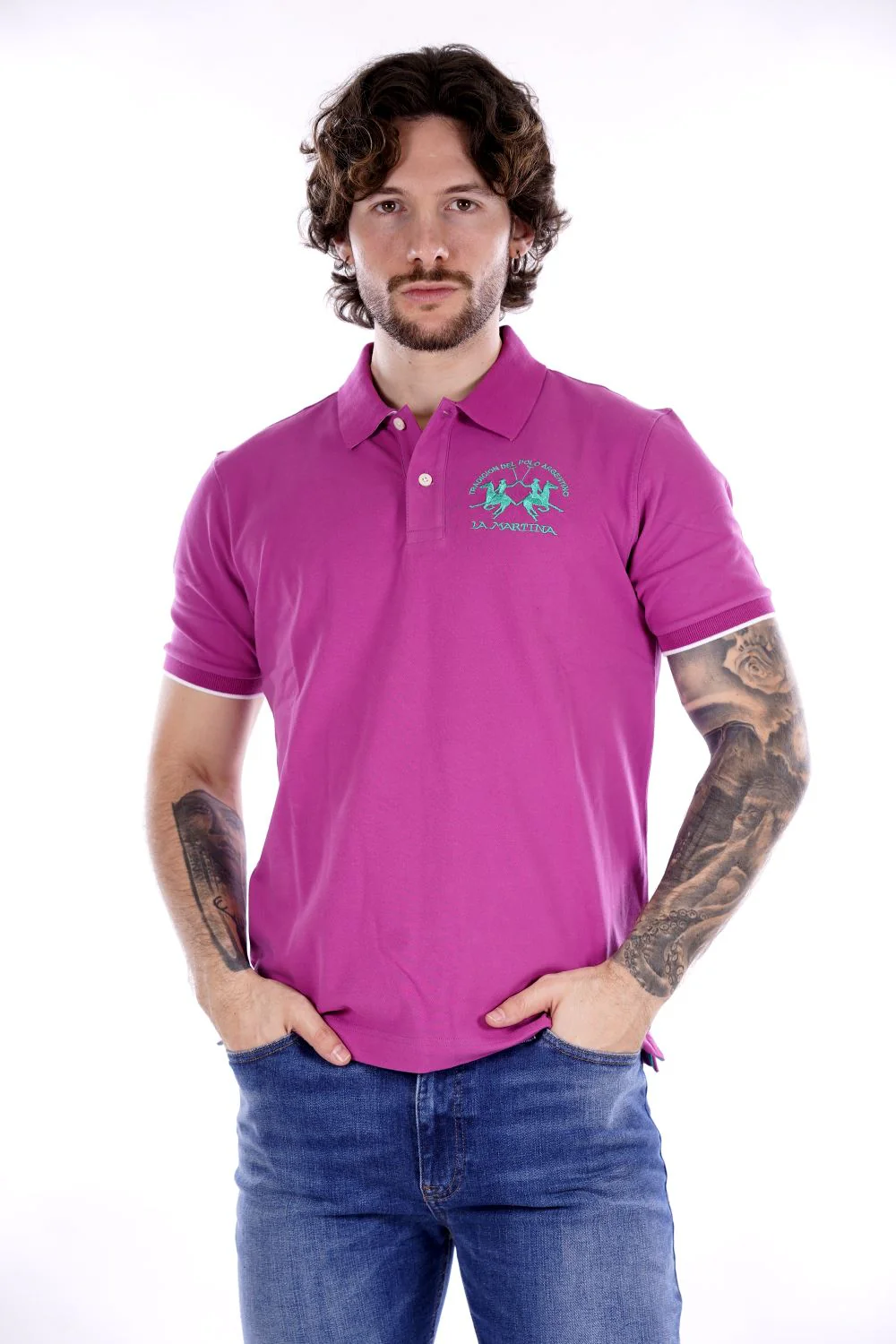 LA MARTINA Polo fucsia da uomo in cotone . Vestibilità regolare . Modello a mezze maniche con colletto classico e chiusura con due bottoni . Logo cucito sul petto in contrasto di colore