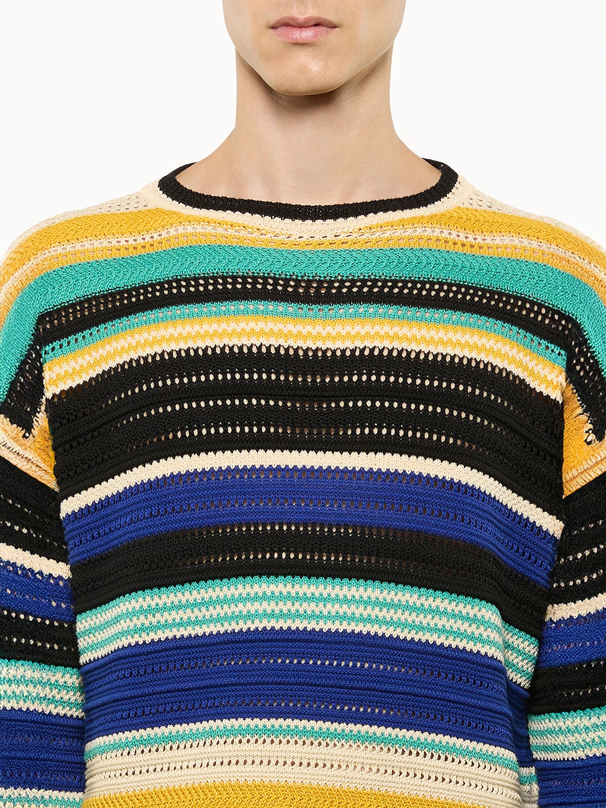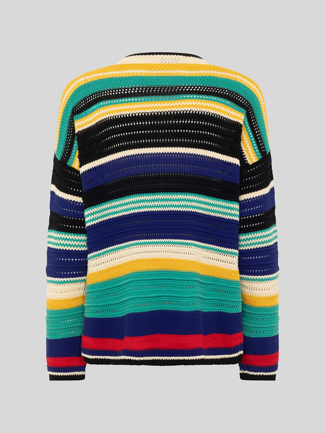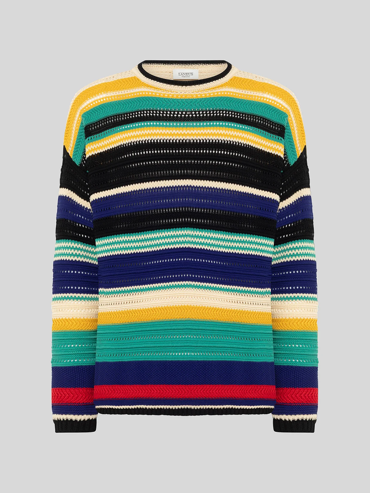 Maglia in cotone intrecciato punto rete. Caratterizzata da un aspetto fresco ed estivo. Maniche lunghe. Vestibilità Over. Made in Italy.