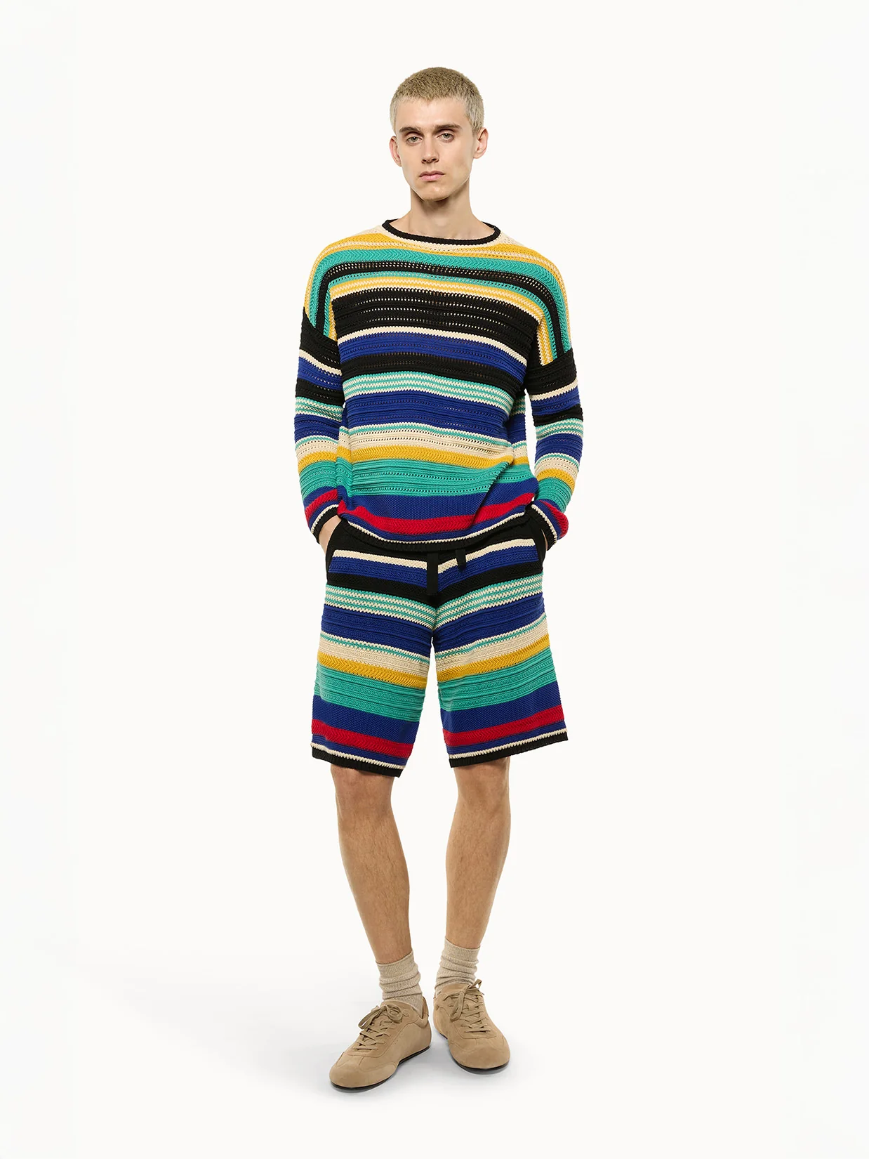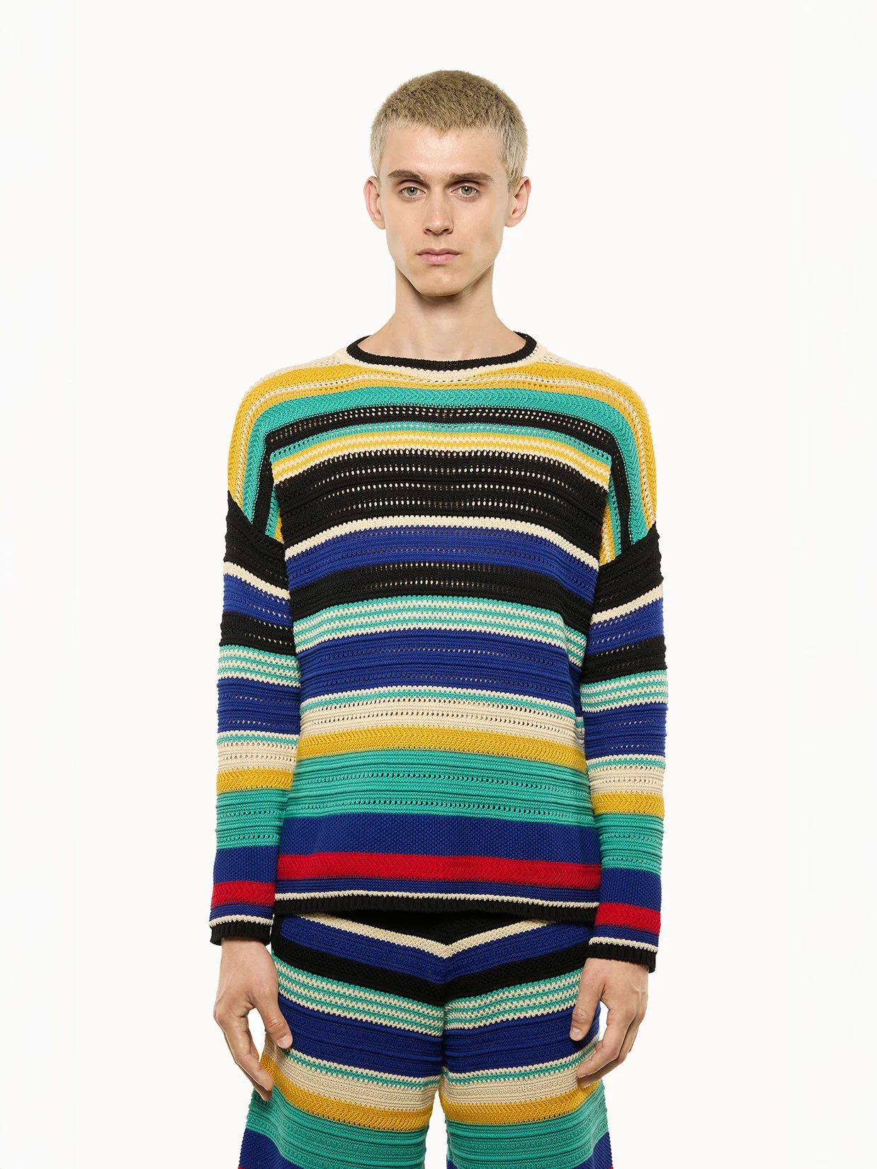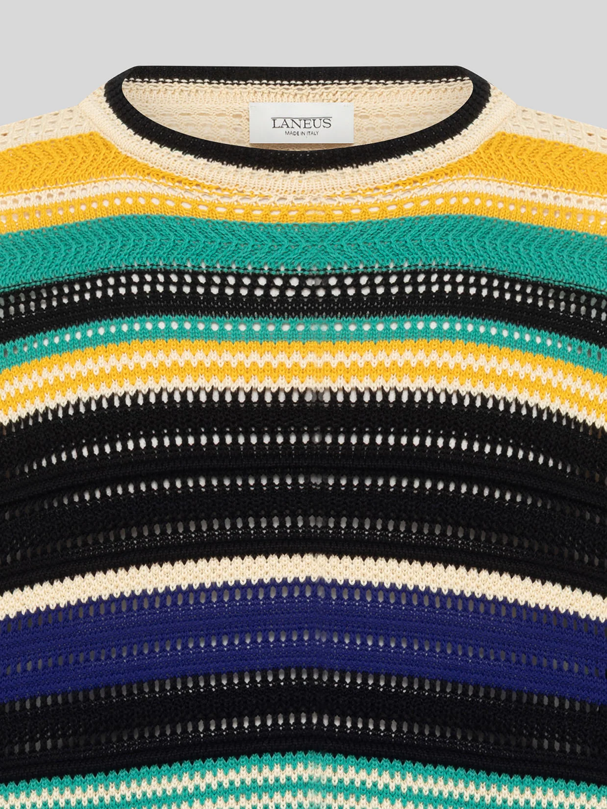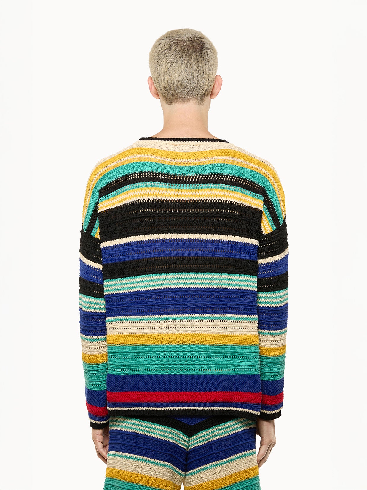 Maglia in cotone intrecciato punto rete. Caratterizzata da un aspetto fresco ed estivo. Maniche lunghe. Vestibilità Over. Made in Italy.