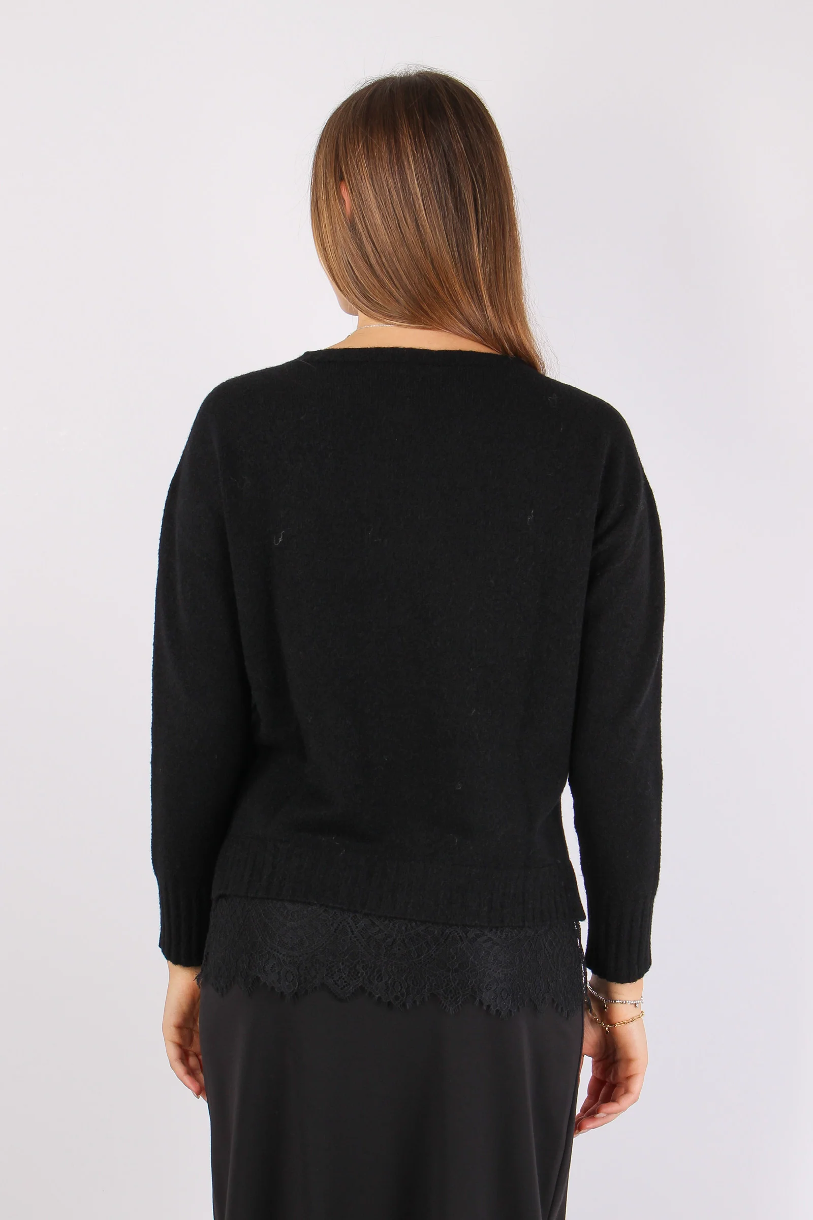 Maglia girocollo in viscosa dal taglio comodo con fondo in pizzo. Il confort che si unisce all’eleganza e alla femminilità. Composizione articolo: 50% viscosa 27% poliestere 23% poliamide La modella è alta 1 75 e indossa una tg. S.
