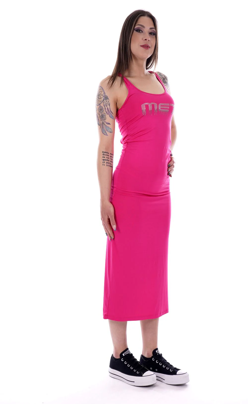 MET Vestito lungo fucsia da donna , in cotone . Logo con strass , bretella larga a vogatore