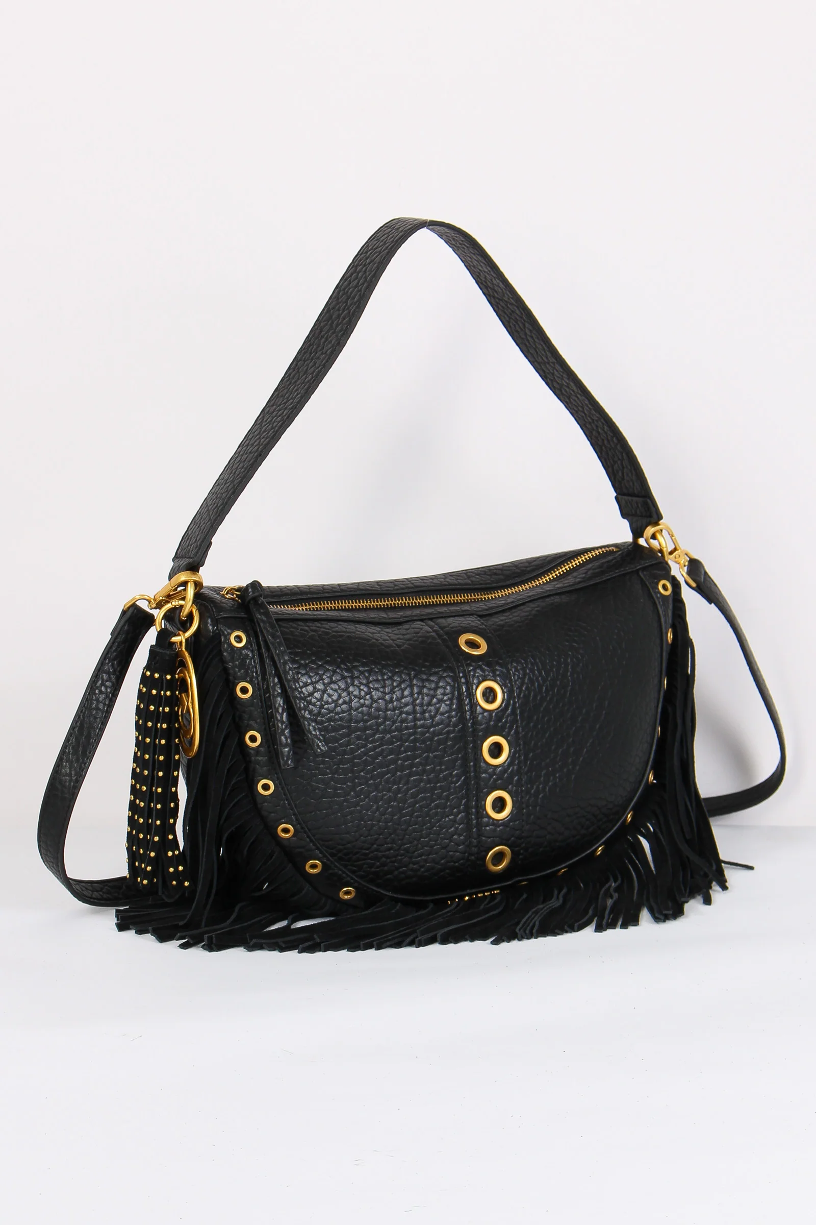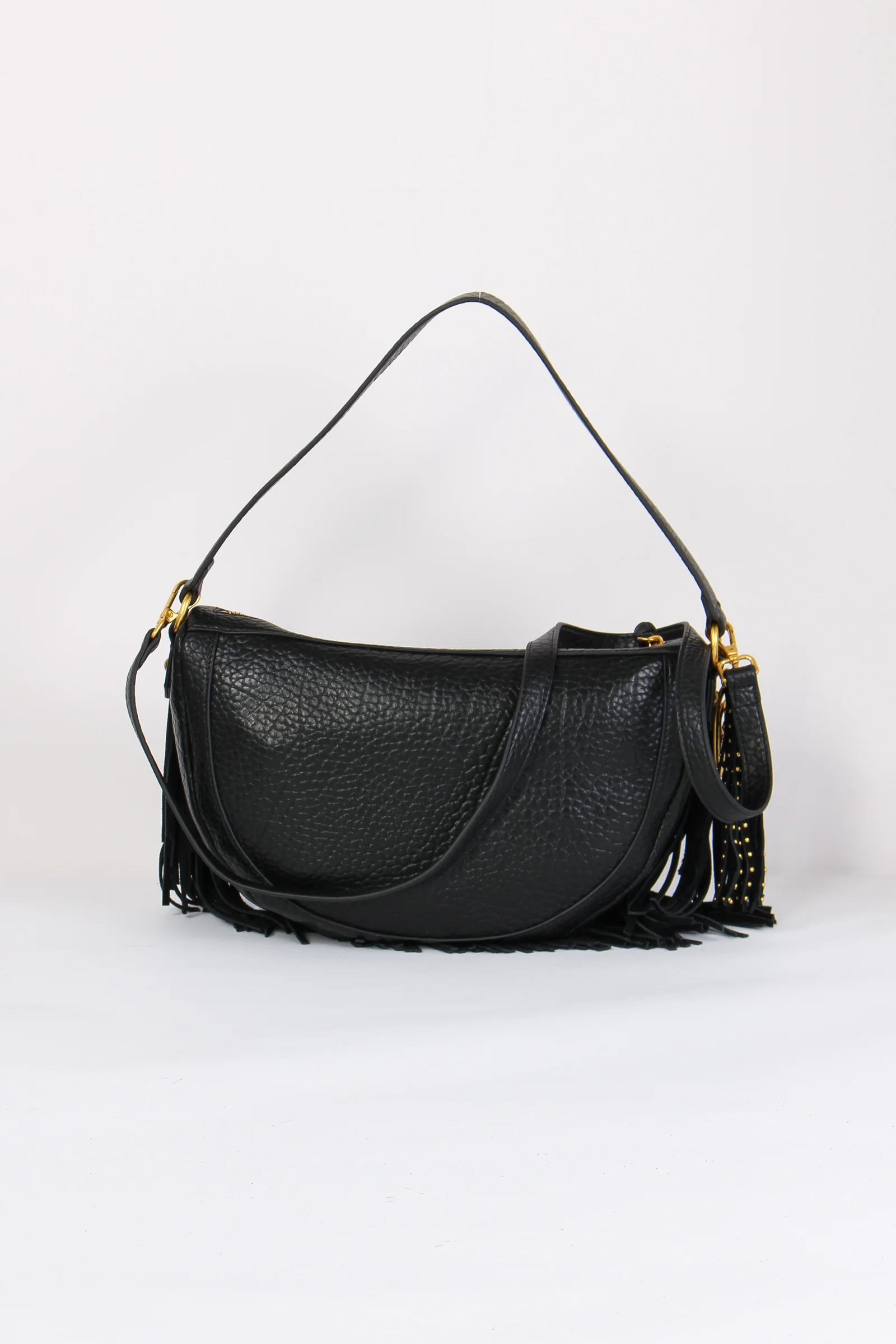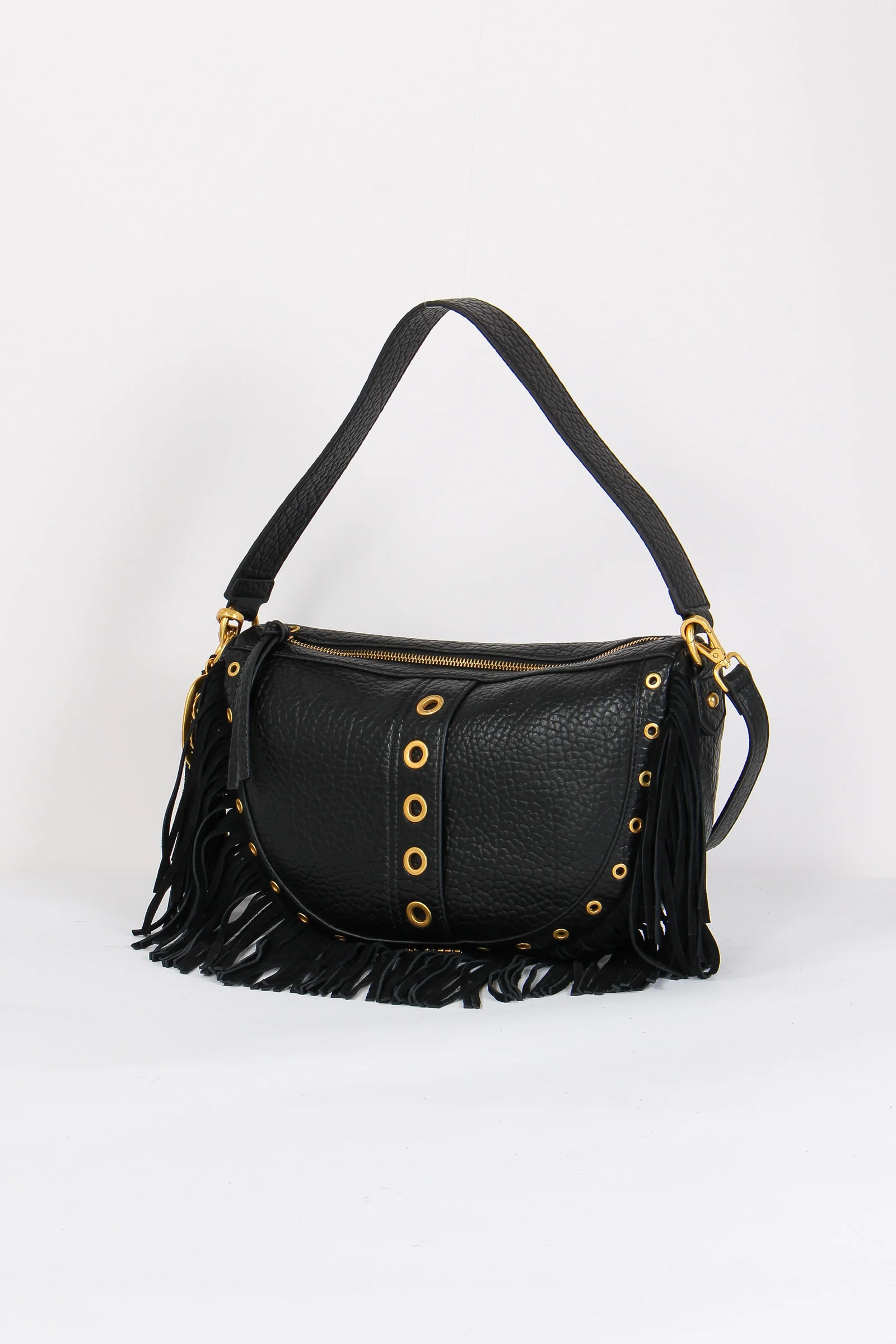 Materiale: ecopelle chiusura: zip tracolla: si dettagli: Mezzaluna realizzata in ecopelle effetto martellato. Dettagli borchie e charm decorativo logato. Frange sul bordo effetto camoscio. Manico fisso e tracolla regolabile e removibile. Interno portaoggetti. Misure: altezza 25cm lunghezza 33c