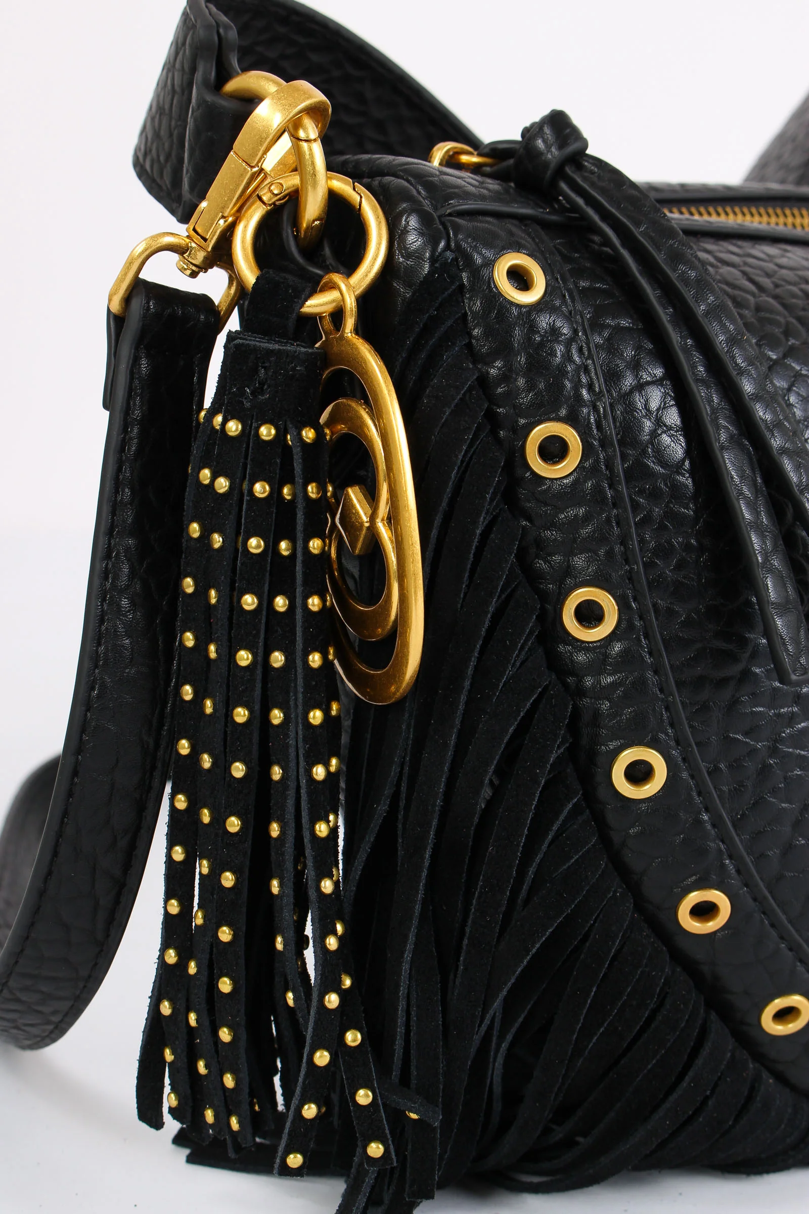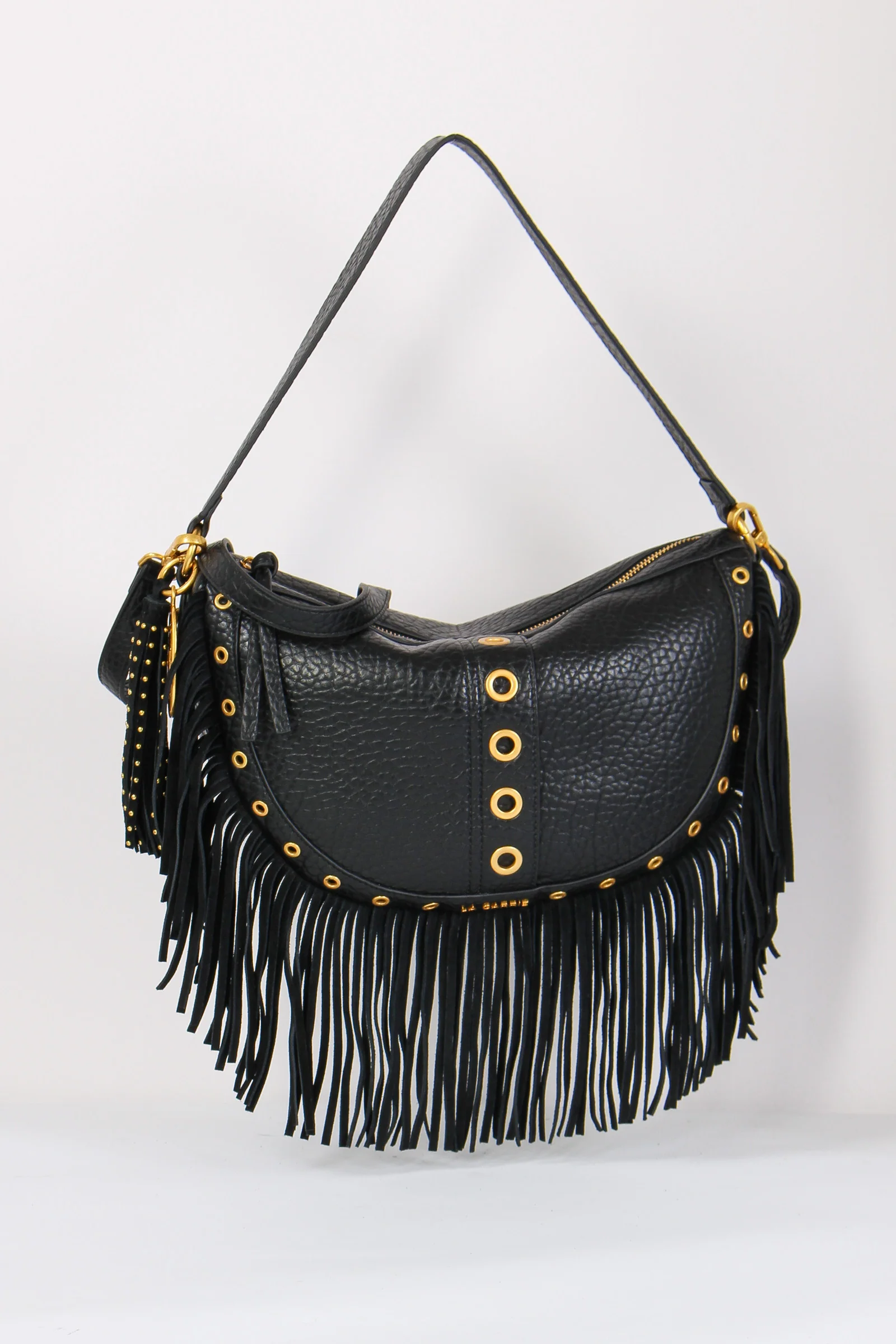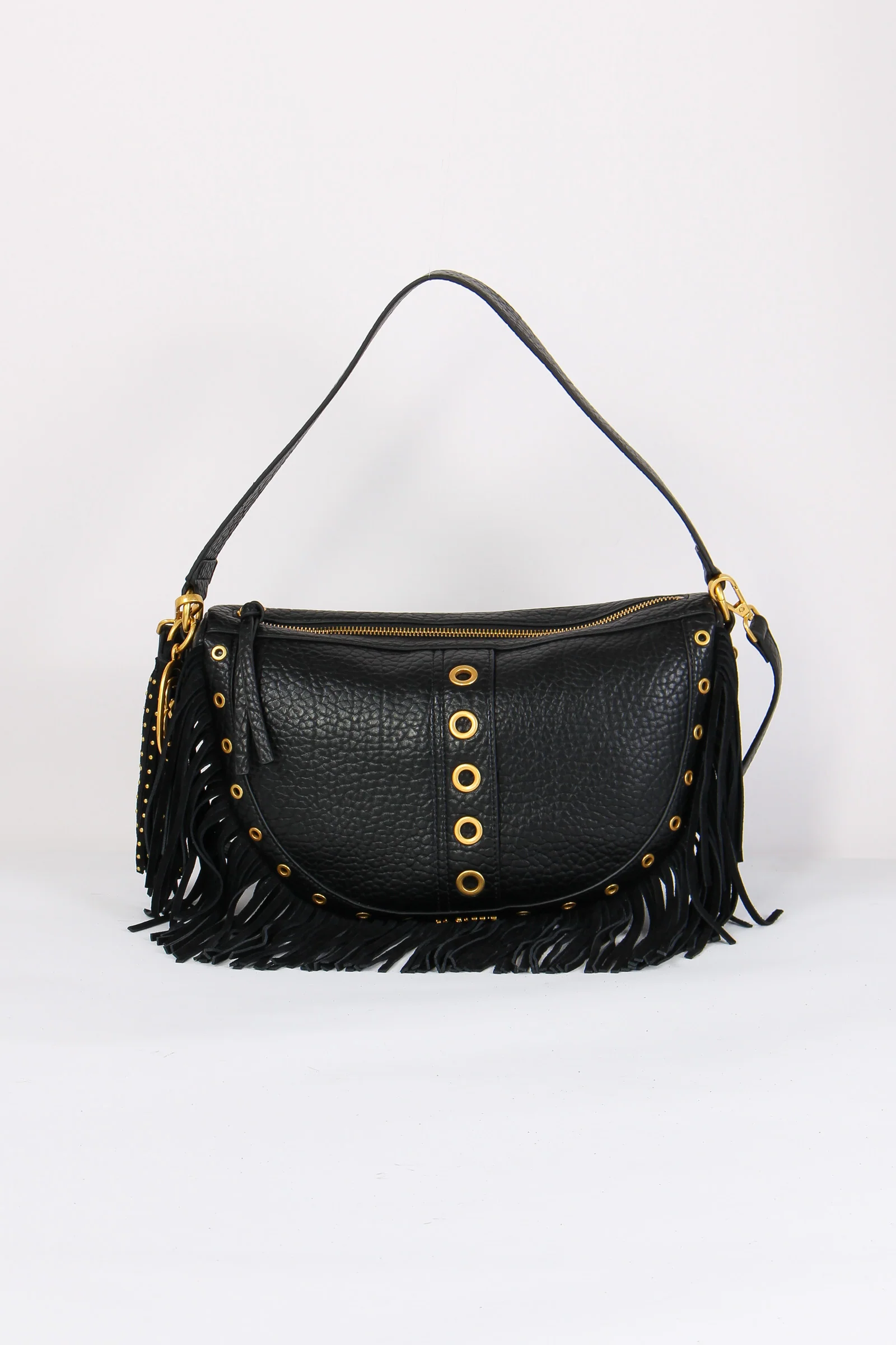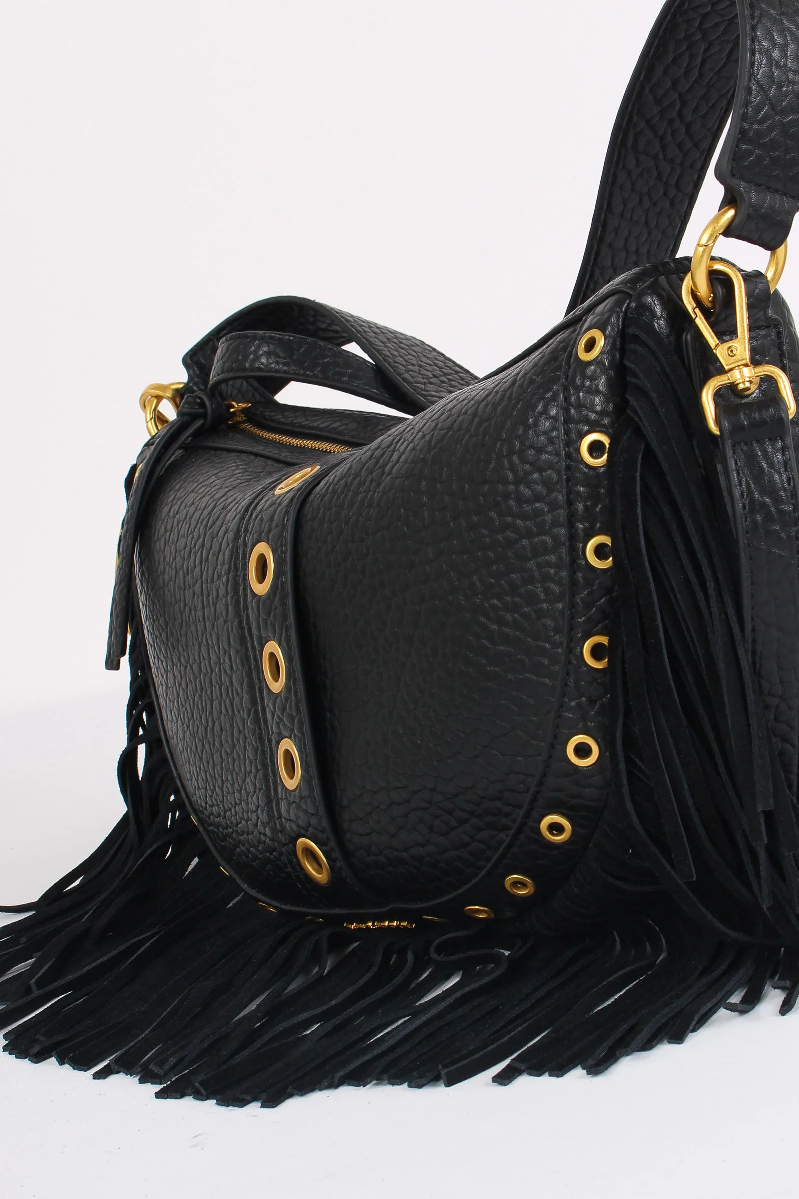 Materiale: ecopelle chiusura: zip tracolla: si dettagli: Mezzaluna realizzata in ecopelle effetto martellato. Dettagli borchie e charm decorativo logato. Frange sul bordo effetto camoscio. Manico fisso e tracolla regolabile e removibile. Interno portaoggetti. Misure: altezza 25cm lunghezza 33c