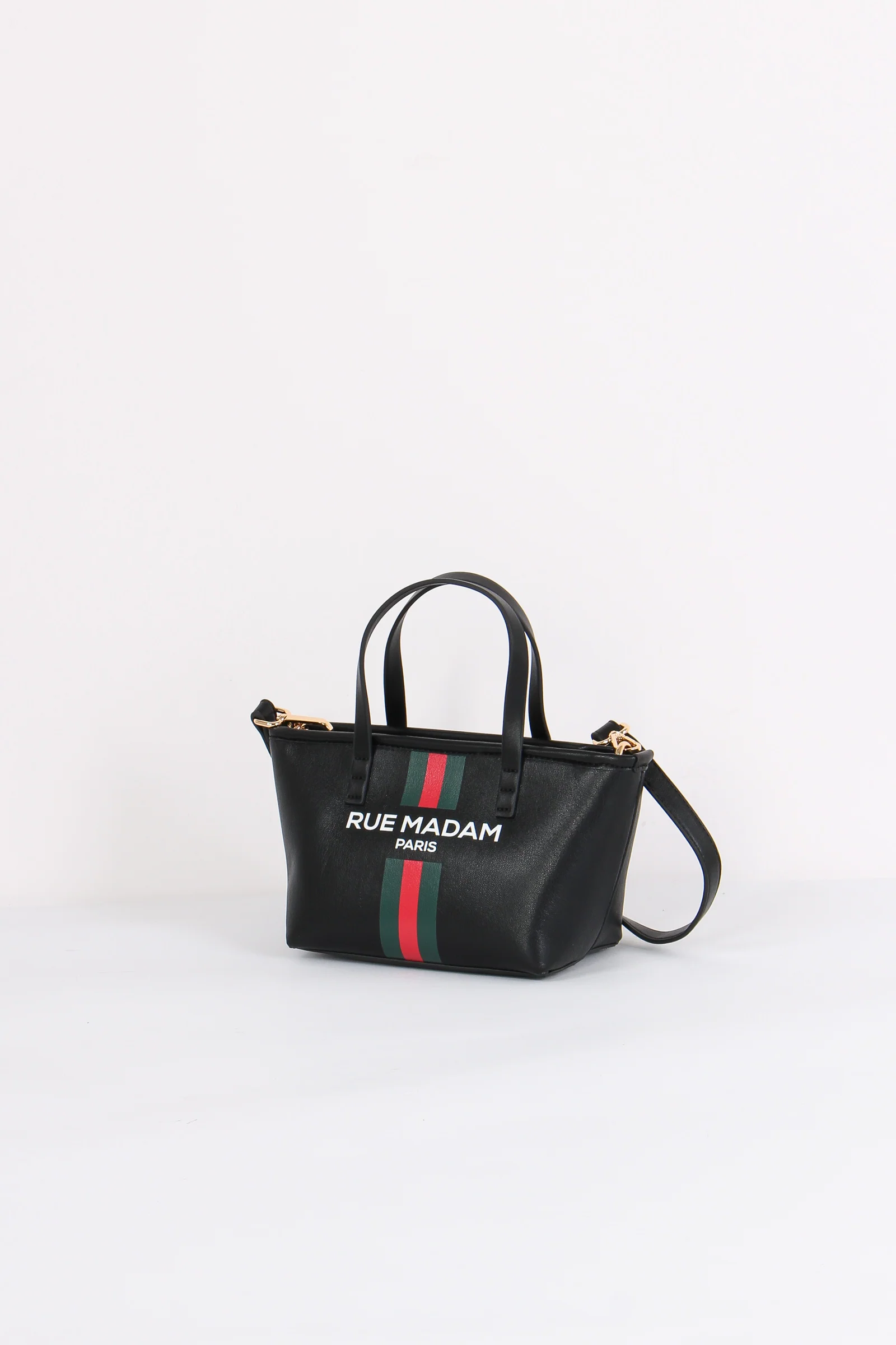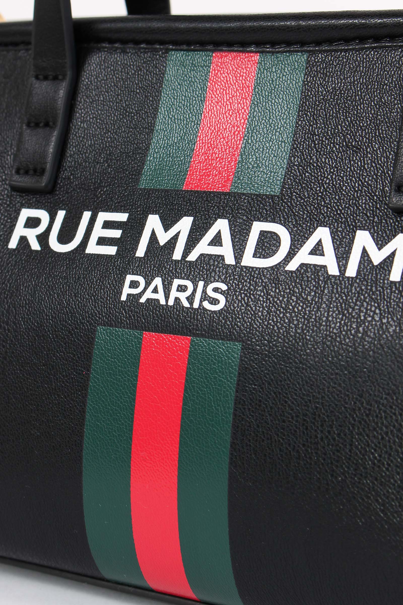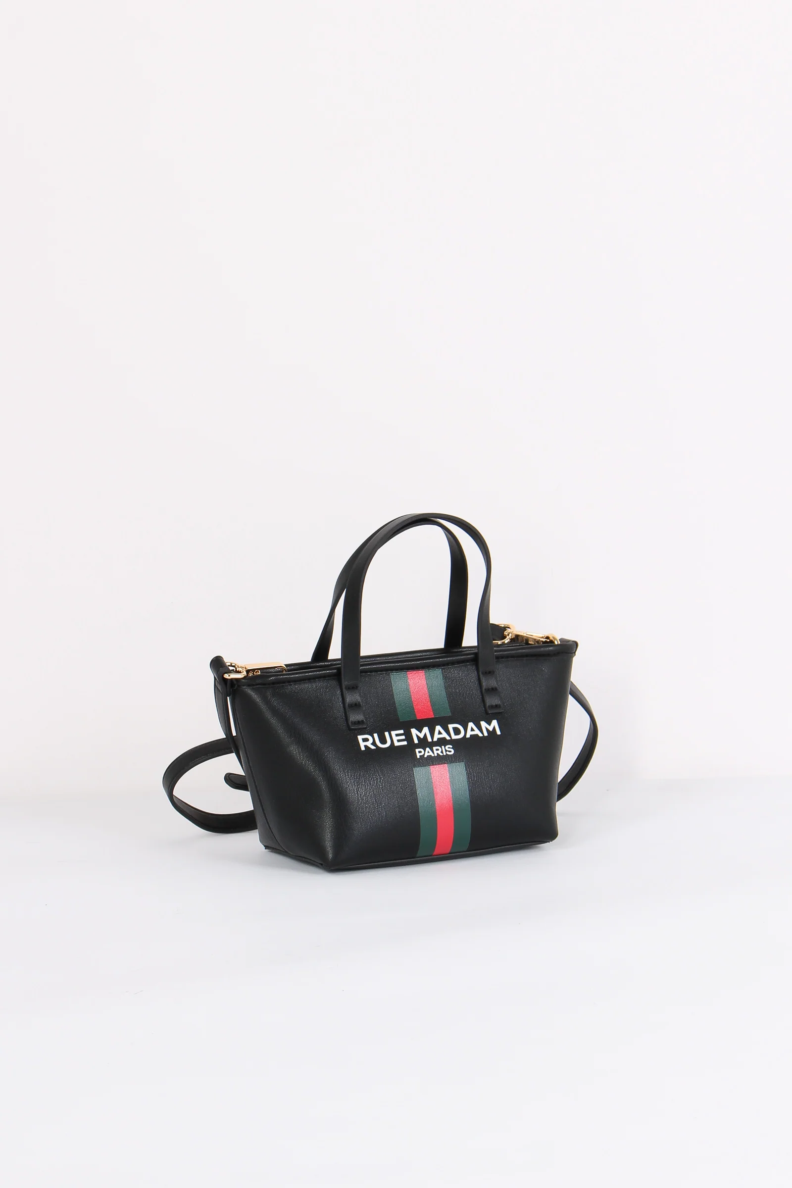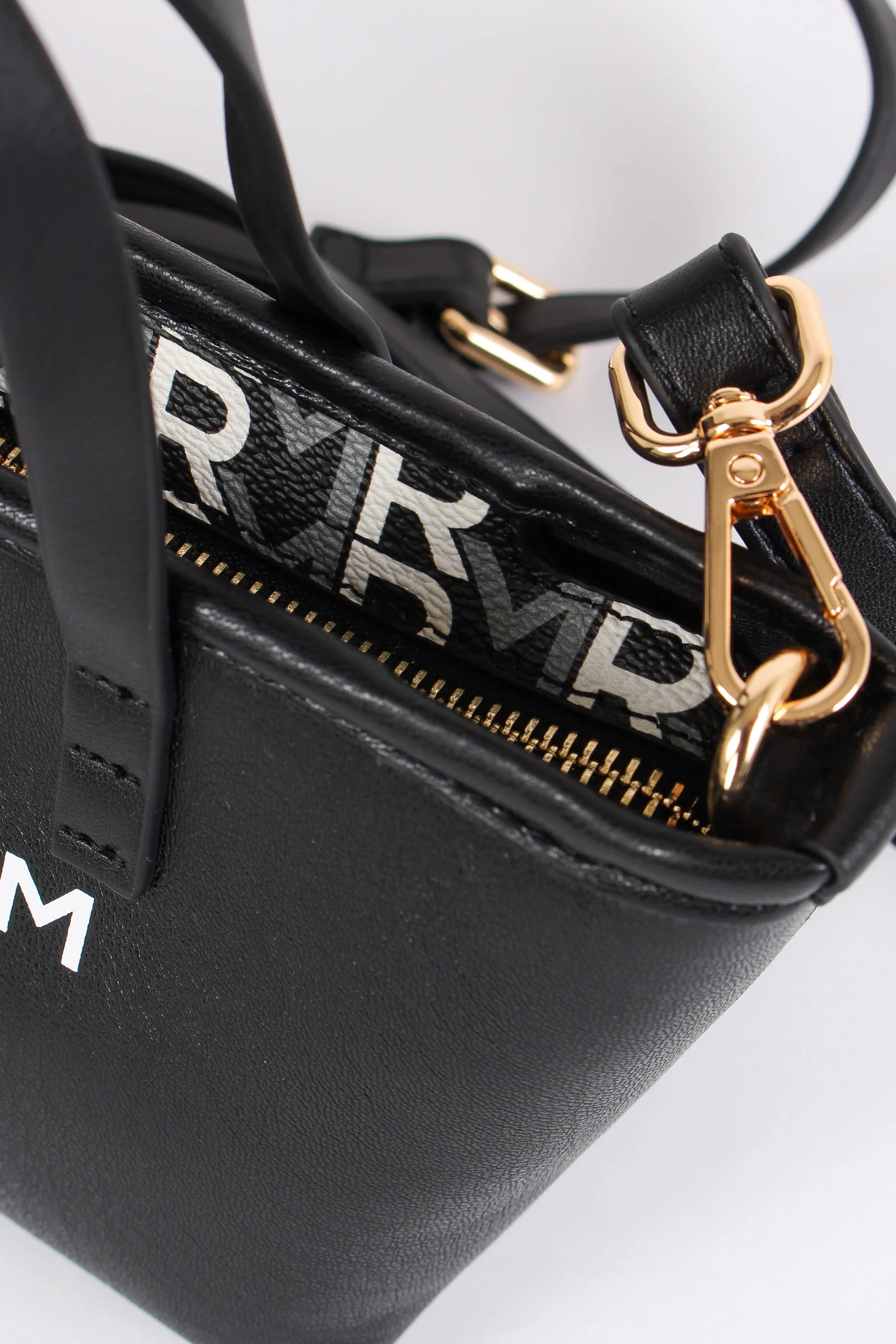 Materiale: ecopelle chiusura: zip tracolla: si dettagli: Mini shopping in ecopelle con dettaglio banda e logo sul davanti. Manici rigidi più tracolla regolabile e removile. Interno con scomparto portaoggetti dettaglio logato dentro borsa. Misure: altezza 14cm lunghezza 26cm e profondità 11cm