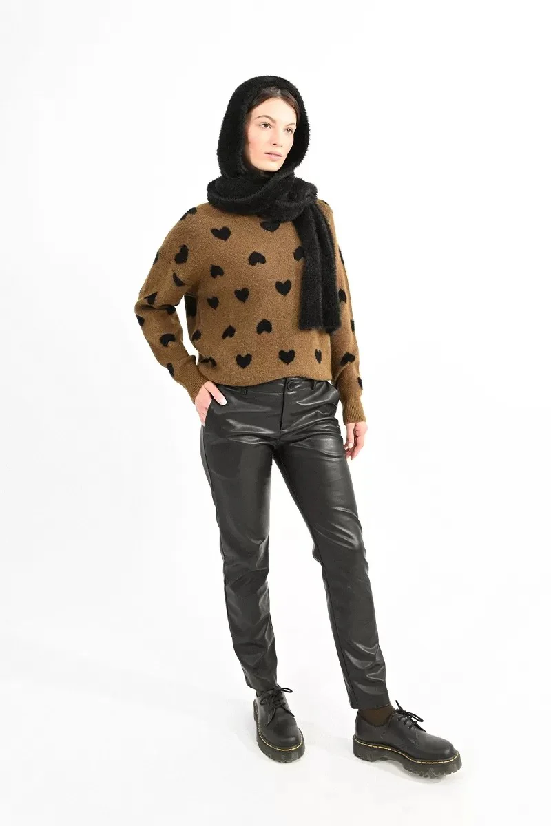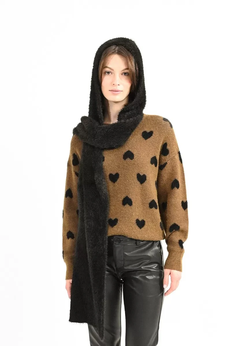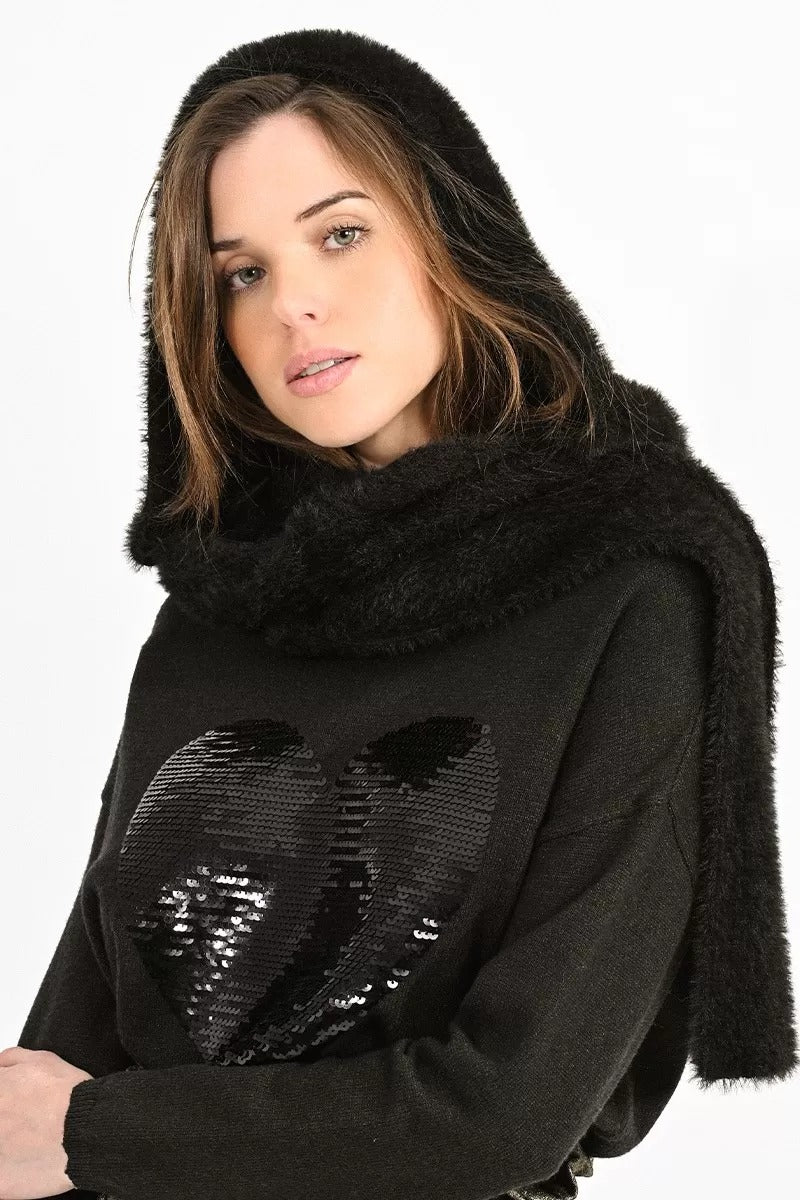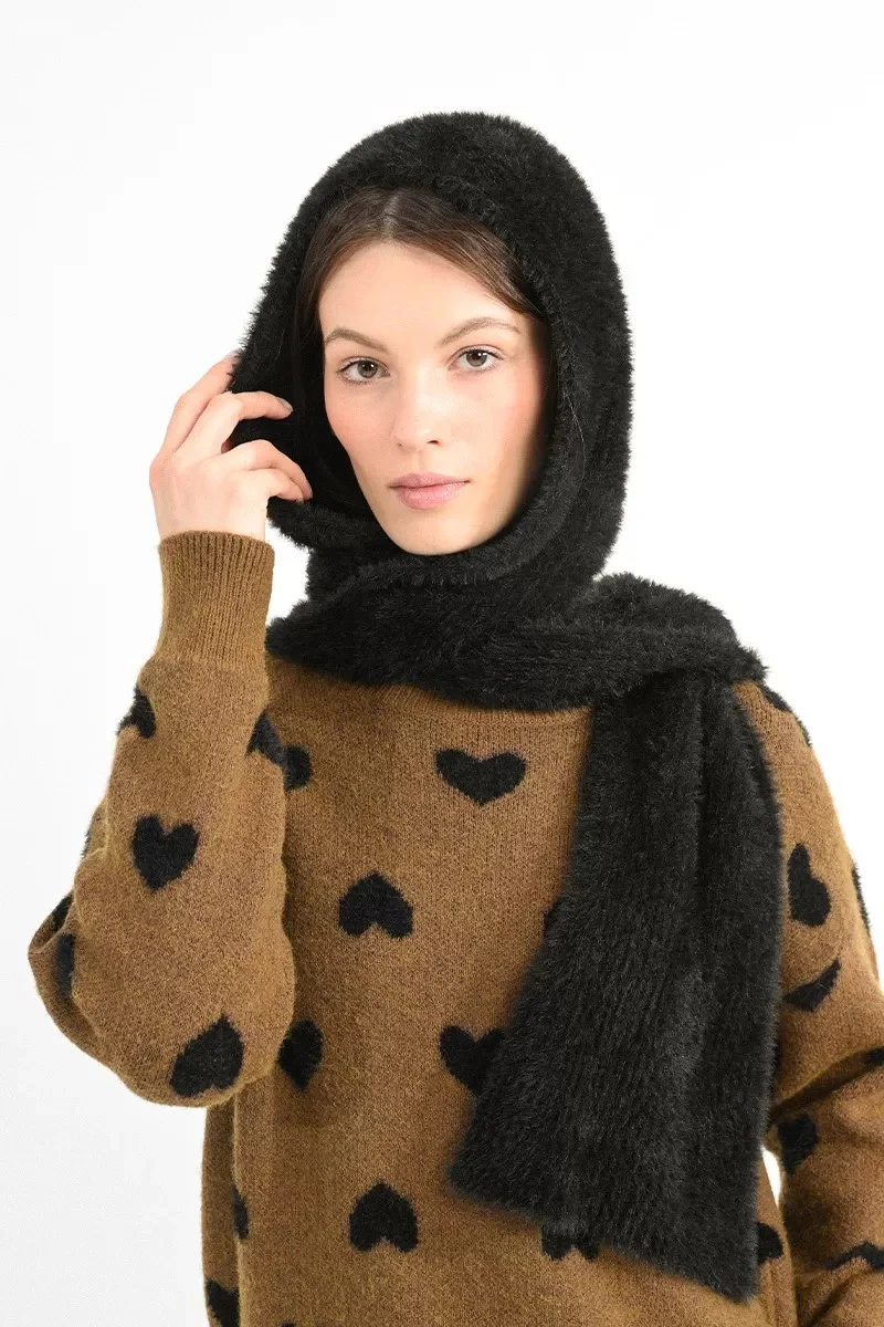 MOLLY BRACKEN Cappello nero da donna con lembi che diventano sciarpa , in tessuto morbido effetto peluche