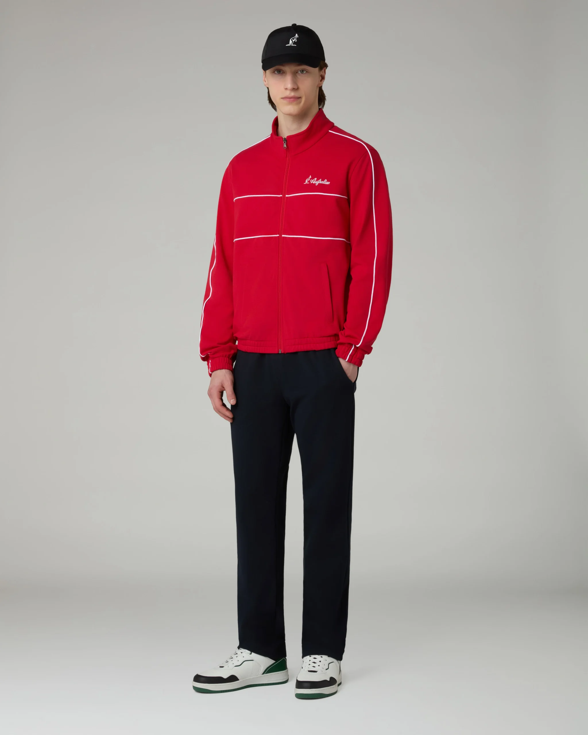 Tuta in tessuto “Piquet fisso”Giacca:– Piping in contrasto– Full zip frontale – Tasche laterali con zip– Bordo e polsi elasticizzati– Logo ricamatoPantalone:– Elastico in vita con coulisse regolabile– Fondo dritto– Logo ricamatoMade in Italy