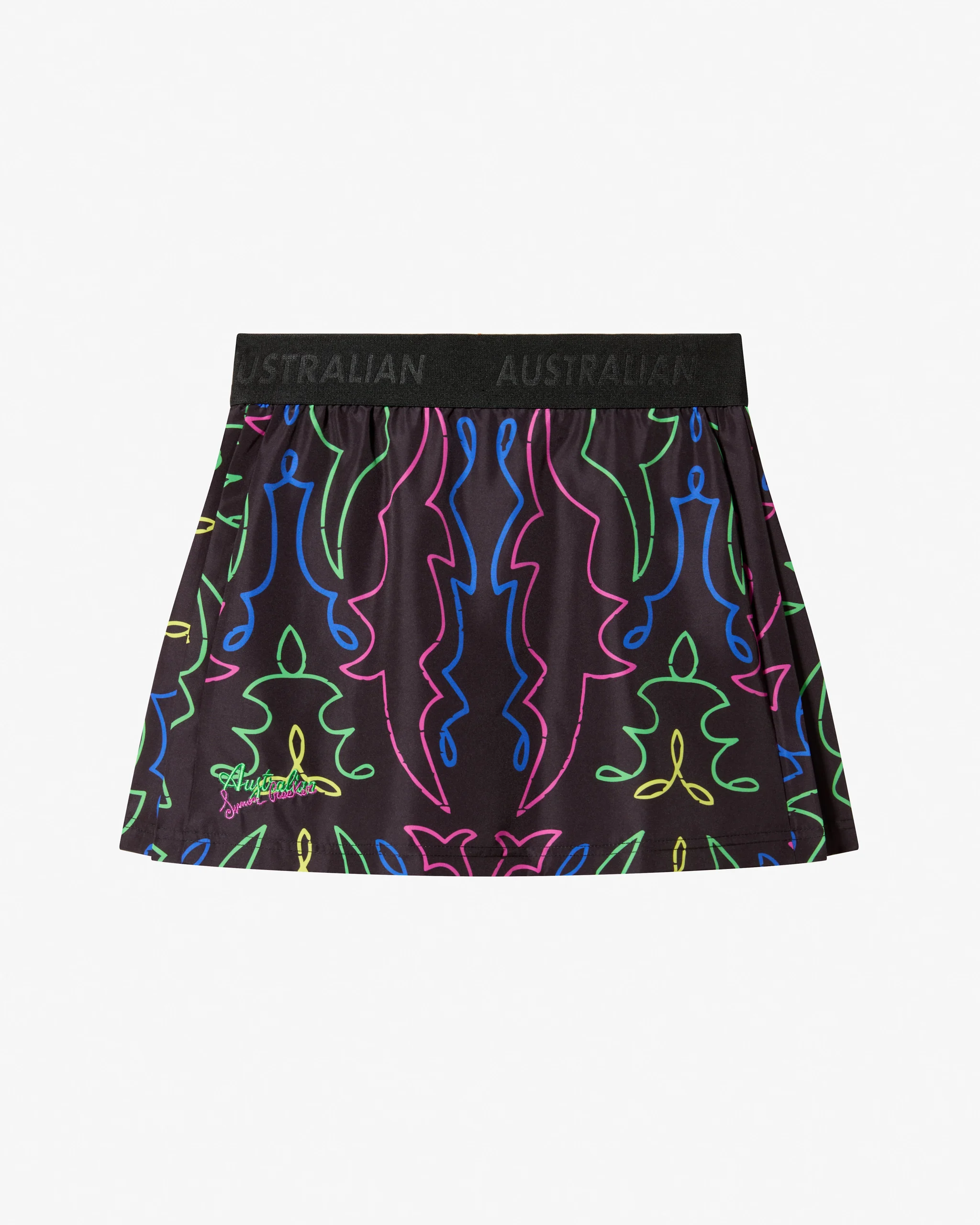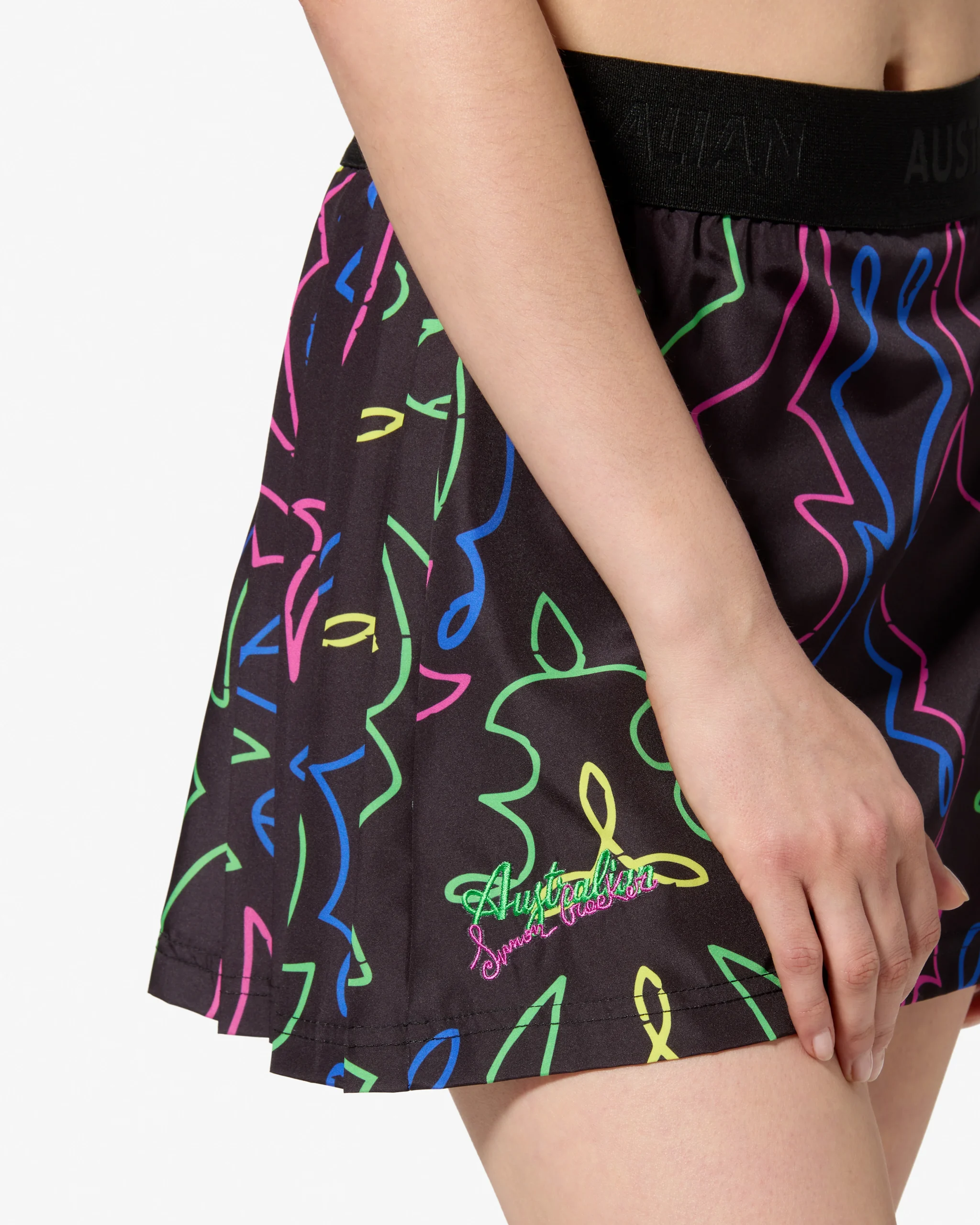 – Gonna in tessuto “smash” superleggero– Elastico personalizzato in vita– Inserto laterale con pieghe– Sottopantaloncino in tessuto “ace” elastico e traspirante con tasca porta smartphone– Logo Australian + Simon Cracker ricamato– Made in Italy