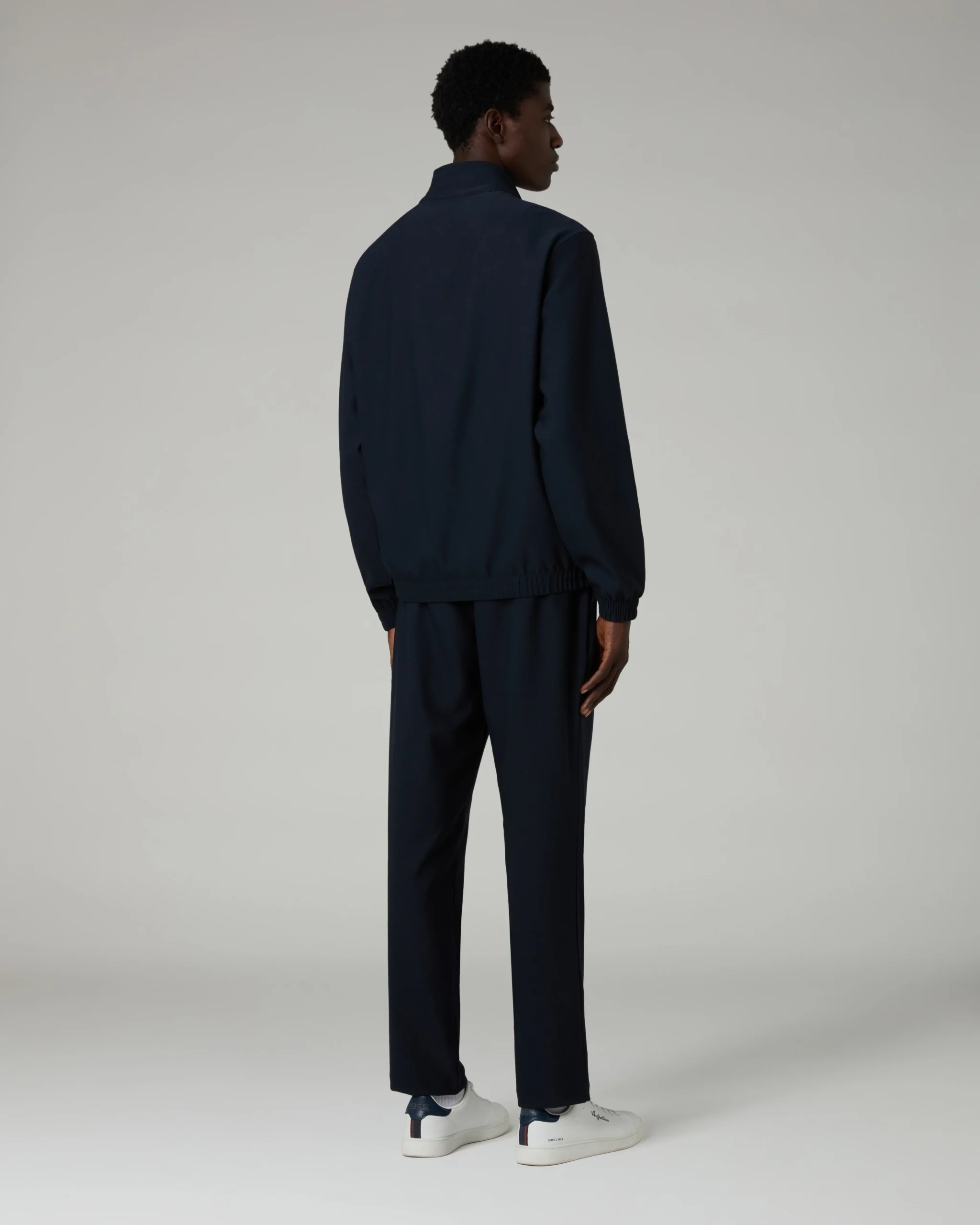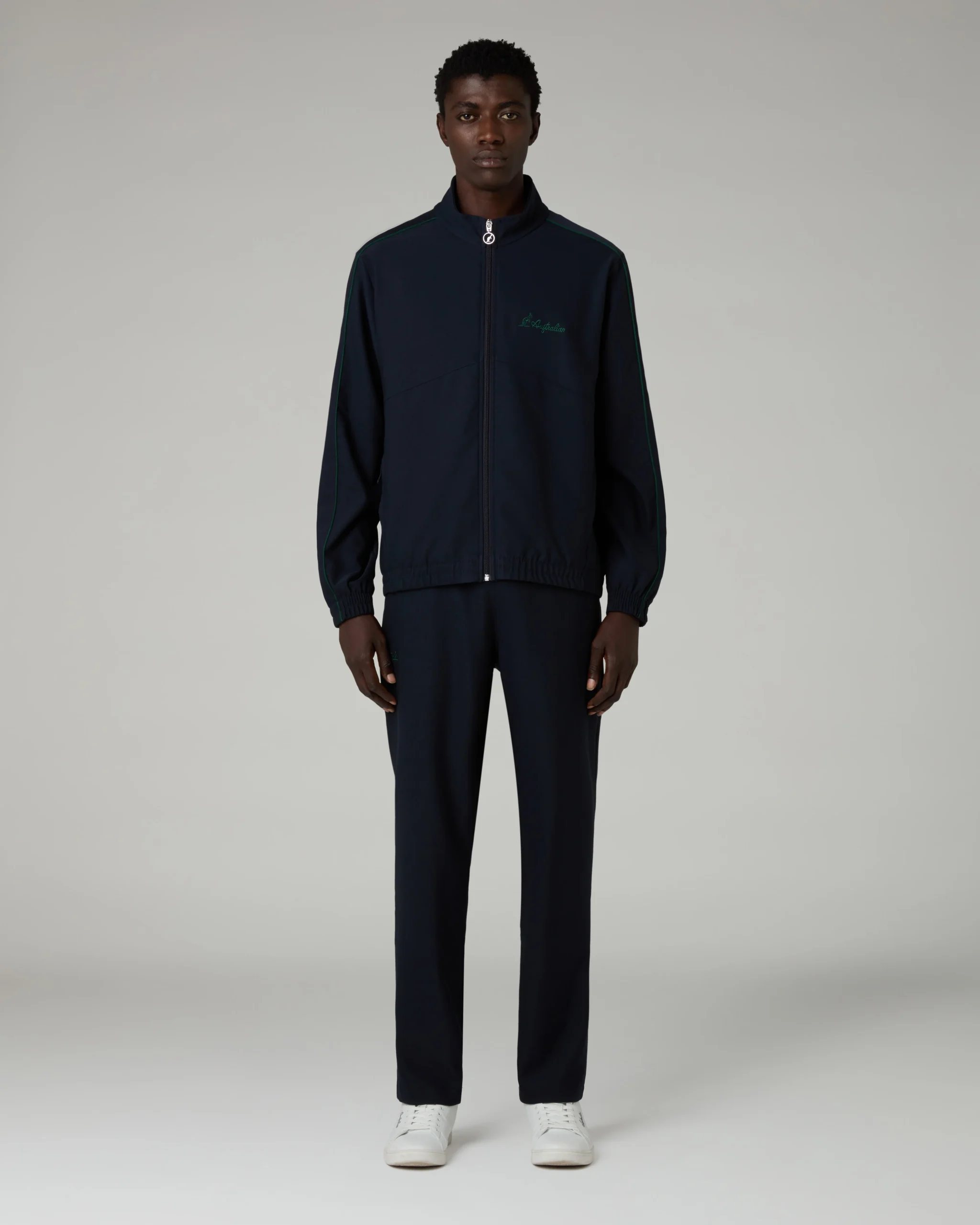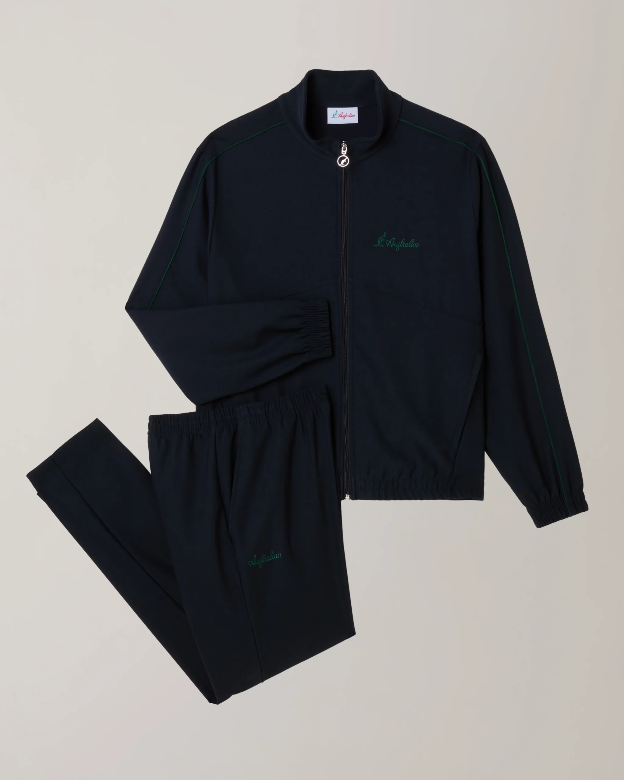 Tuta in morbido tessuto “Gabardine wool Hand”Giacca:– Piping in contrasto sulle maniche– Full zip frontale– Tasche con zip– Bordo e polsi elasticizzatiPantalone:– Elastico in vita con coulisse regolabile– Fondo dritto– Logo ricamatoMade in Italy