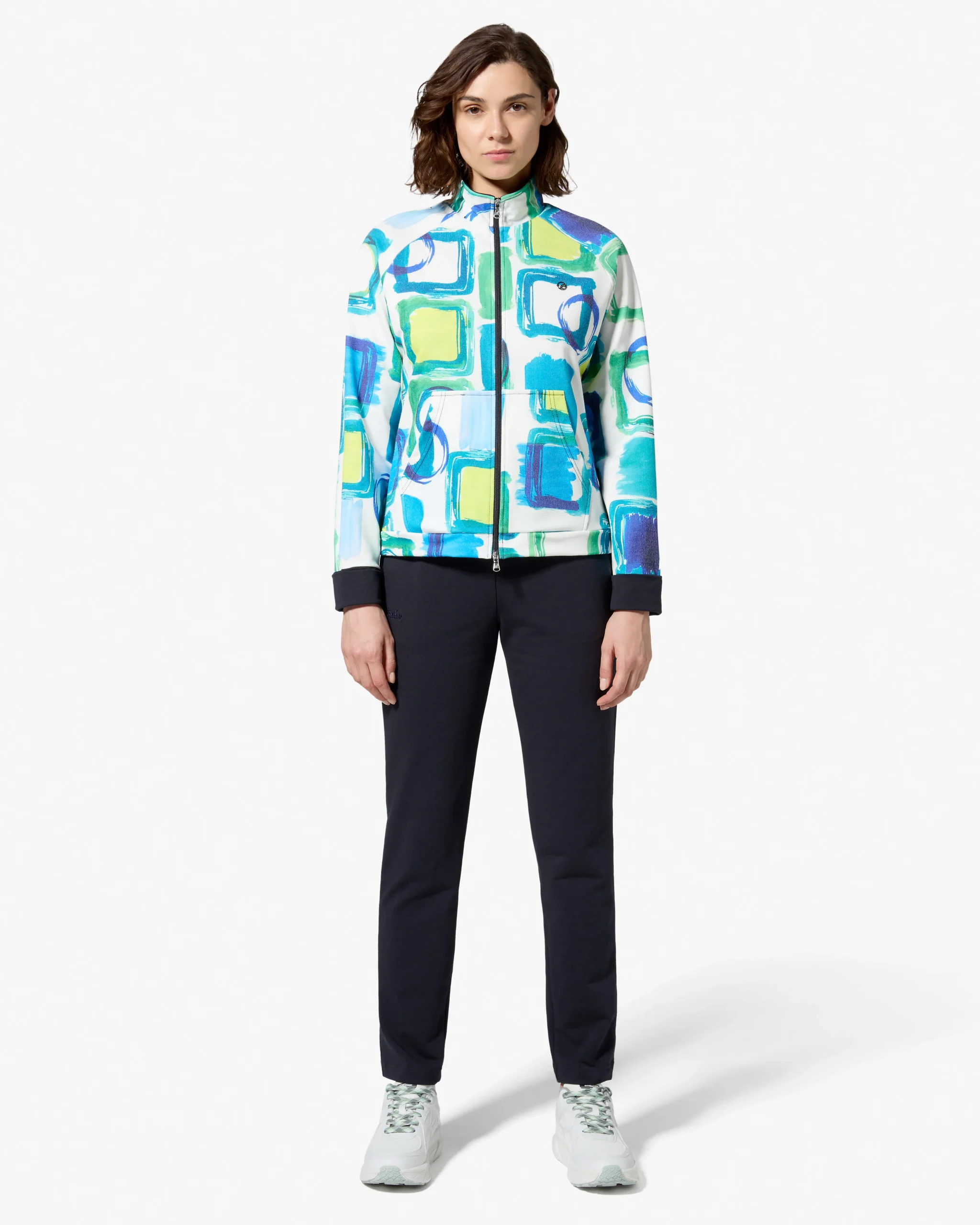 Tuta in Felpina stampata ed elasticizzataGiacca:– Stampa digitale– Full zip frontale con doppio cursore– Interno collo e polsi risvoltati– Maniche raglan– Tasca a marsupio– Logo applicato con placchettaPantalone:– in tessuto Felpa elasticizzata– Taglio a sigaretta– Elastico in vita con coulisse regolabile– Tasche dritte– Logo ricamatoMade in Italy