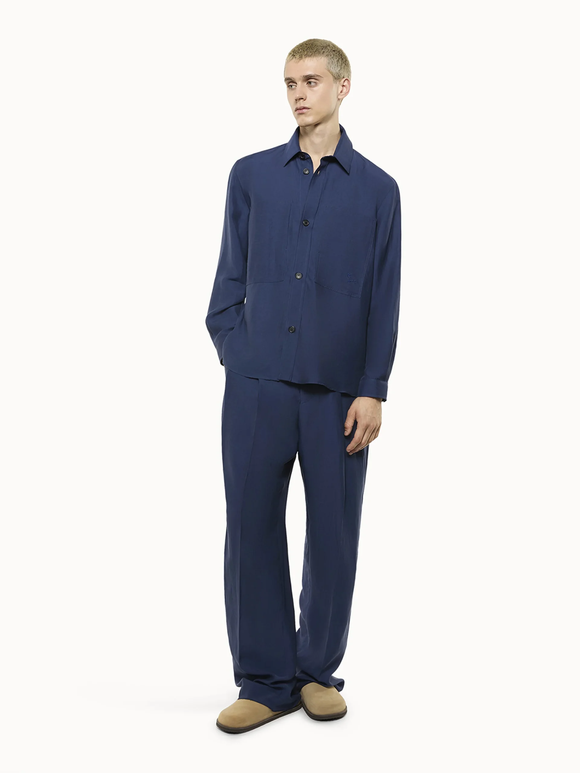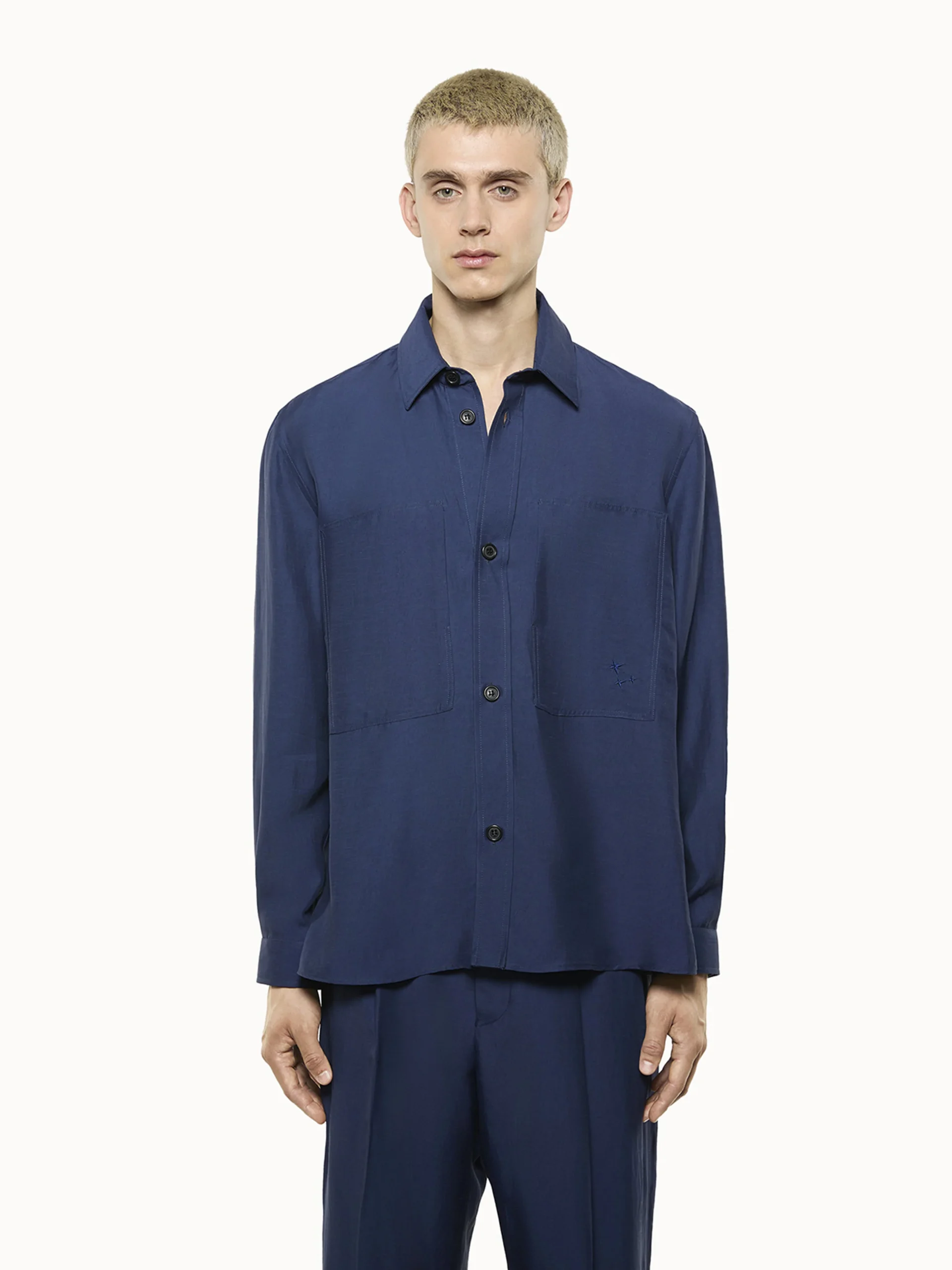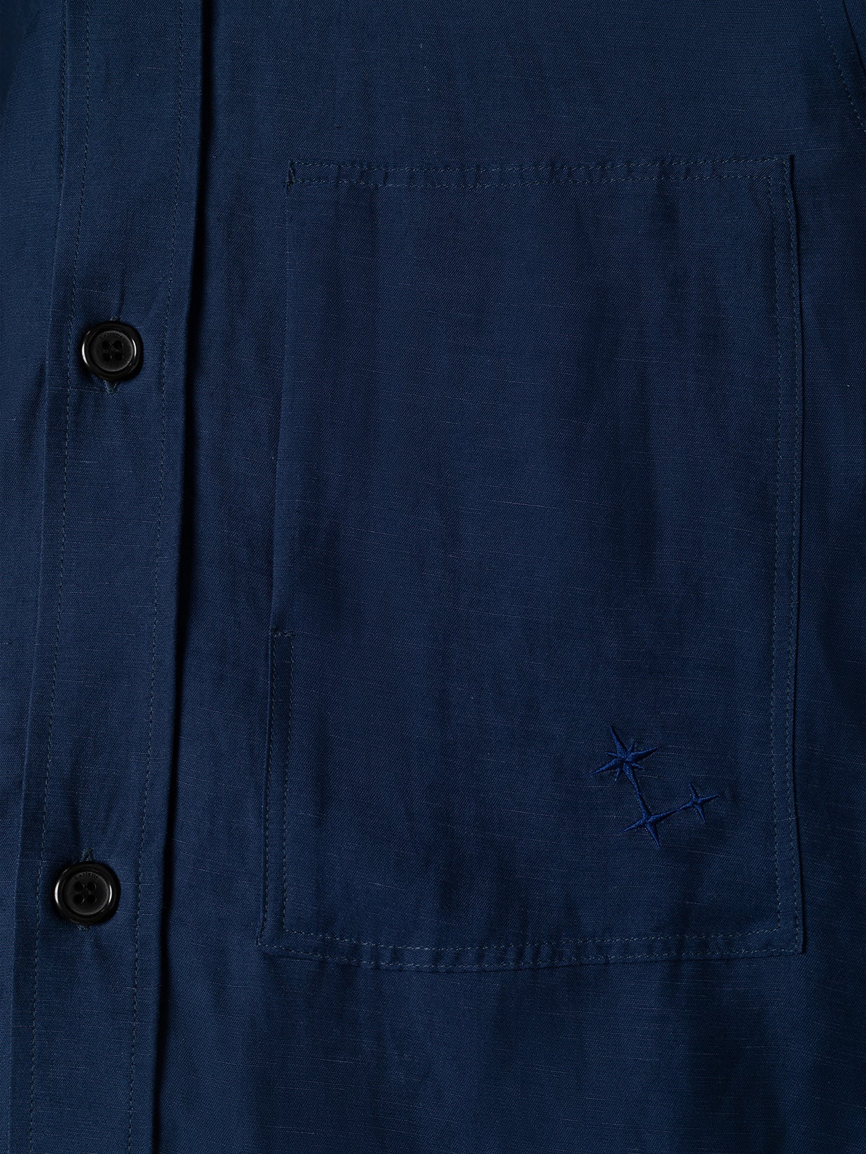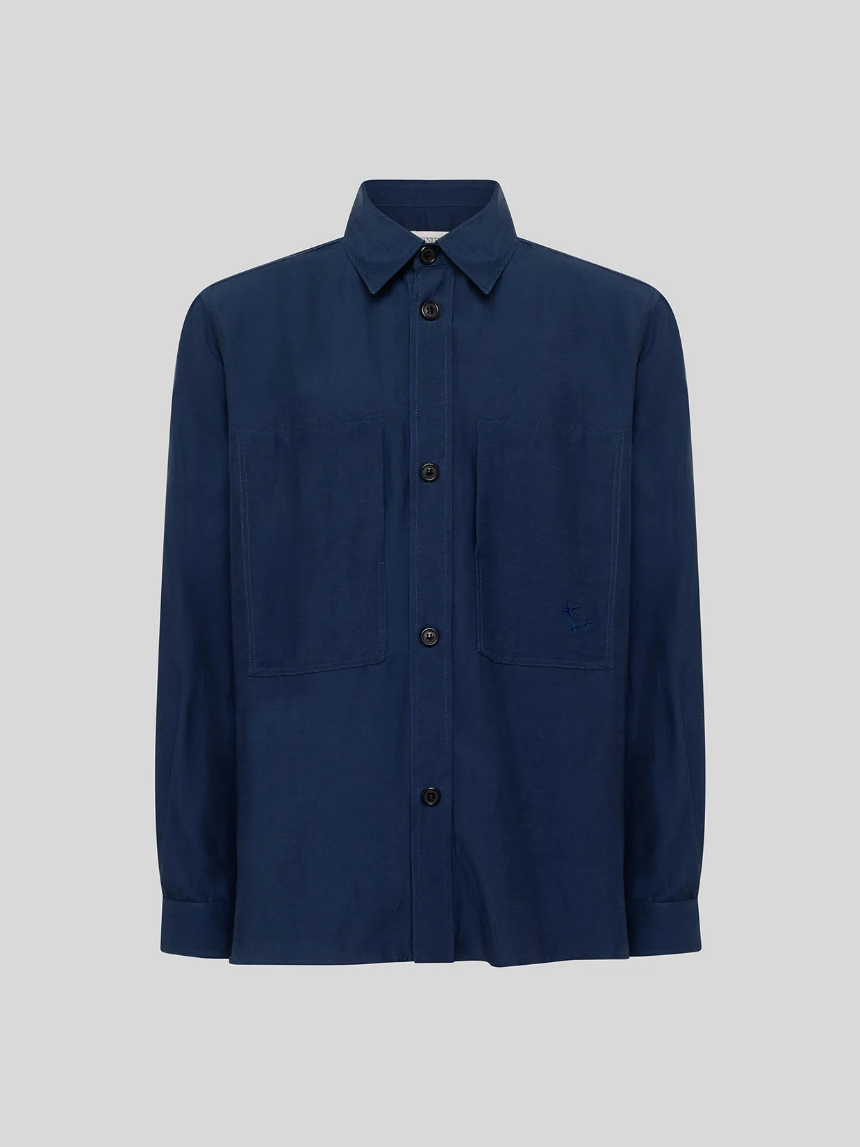 Overshirt in viscosa e lino con bottoni frontali. Doppia maxi tasca caratterizzata da ricamo ton sur ton. Vestibilità over. Made in Italy.